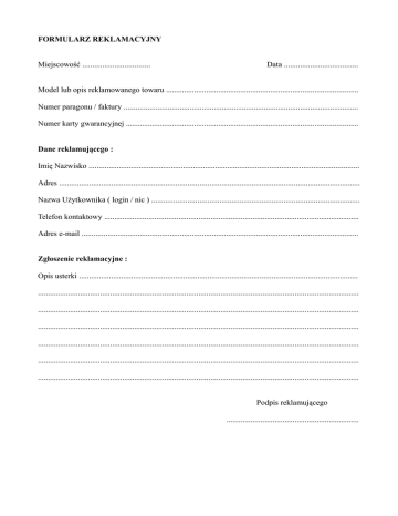 FORMULARZ REKLAMACYJNY Miejscowość .................................. Data ..................................... Model lub opis reklamowanego towaru ................................................................................................ Numer paragonu / faktury ..................................................................................................................... Numer karty gwarancyjnej .................................................................................................................... Dane reklamującego : Imię Nazwisko ....................................................................................................................................... Adres ...................................................................................................................................................... Nazwa Użytkownika ( login / nic ) ........................................................................................................ Telefon kontaktowy ............................................................................................................................... Adres e-mail .......................................................................................................................................... Zgłoszenie reklamacyjne : Opis usterki ........................................................................................................................................... ................................................................................................................................................................ ................................................................................................................................................................ ................................................................................................................................................................ ................................................................................................................................................................ ................................................................................................................................................................ ................................................................................................................................................................ Podpis reklamującego ..................................................................