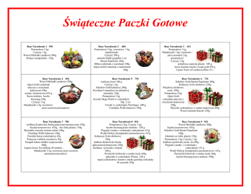 Świąteczne Paczki Gotowe Boze Narodzenie 1 59$ Pomarańcze 2 kg Cytryny 1 kg Wawel Michałki zamkowe 500g Delicje szampańskie 120g Boze Narodzenie 2 60$ Pomarańcze 2 kg, /sezonowo 1 kg mandarynek/ Cytryny 500 g pomelo/słodki grejpfrut 3 szt Salami Popularne 100g Milka czekolada z orzechami 100g Alpen Gold Czekolada z nadzieniem 100g Boze Narodzenie 3 61$ Pomarańcze 1 kg Mandarynki 1 kg/ sezonowo / poza sezonem 2 kg pomarańczy/ Cytryny 1 kg polędwica sopocka plastry 100 g kawa mielona Jacobs Cronat gold 250 g Lipton Taste of London herbata 25 t. Boze Narodzenie 4 69$ Wawel Michałki zamkowe 500g Alpen Gold czekolada mleczna z orzechami laskowymi 100g szynka konserwowa 454 g Kawa mielona Jacobs Kronung 250g Cytryny 1 kg Mandarynki 1 kg /sezonowo poza sezonem pomarańcze/ Boze Narodzenie 5 75$ wędzony łosoś 100 g Cytryny 1 kg Sokołów Gold kabanosy 200g President Camembert ser pleśniowy naturalny 120g Pomarańcze 2 kg Grześki Mega Wafel w czekoladzie 50g 2 szt Torciki w czekoladzie Pischinger 200 g Familijne Wafle kakaowe 180g Boze Narodzenie 6 73$ Sokołów Gold Salami Popularne 100g Kabanosy Extra drobiowe 250g Polędwica drobiowa extra 300g Pomarańcze 2 kg Alpen Gold czekolada mleczna z orzechami laskowymi 100g Patyczki czekoladowe o smaku miętowym 200g Wawel cukierki Raczki 120g Boze Narodzenie 7 78$ kiełbasa Krakowska Sucha pakowana hermetycznie 250g Szynka konserwowa 455g, Ser żółty plastry 150g Biesiadne orzeszki ziemne solone 100g Familijne Wafle kakaowe 180g Pawełek baton czekoladowy 45g Princessa wafelek orzechowy 36g Nesquik kakao słodkie rozpuszczalne 600g Lipton Green Tea herbata 20 torebek ., Mandarynki 2 kg /sezonowo poza sezonem pomaranczemarańcze/ Boze Narodzenie 8 81$ Pomarańcze 2 kg, Cytryny 1 kg Jacobs Kronung kawa mielona 250 g Pieguski ciastka z czekoladą i rodzynkami 135g Wedel Delicje Szampańskie pomarańczowe 147g Kabanosy Extra drobiowe 250g kiełbasa Krakowska Sucha pakowana hermetycznie 250g Kiełbasa żywiecka z indyka 360 g Pierniczki królewski o smaku trusk.160g galaretka w czekoladzie Wiśnia 180 g napój czekoladowy instant o smaku gorzkiej czekolady 10 saszetek 250g Boze Narodzenie 9 93$ Wawel Michałki zamkowe 500g Szynka konserwowa 455g Sokołów Gold Salami Popularne 100g Edamski ser żółty plastry 150g Pomarańcze 2 kg, Cytryny 1 kg kiełbasa myśliwska sucha ok.450g Pieguski ciastka / z czekoladą i rodzynkami 135 g Wedel Delicje Szampańskie pomarańczowe 147g Pierniczki królewski o smaku trusk.160g Jacobs Kronung kawa mielona 500g Boze Narodzenie 10 81$ Wawel Michałki zamkowe 500g Biesiadne orzeszki ziemne solone, puszka 100g Halls cukierki miód i cytryna 33g Milka czekolada 100g cream - z nadzieniem śmietankowym, krakersy Super 180g Cytryny 1 kg, Pomarańcze 1 kg Pieguski ciastka z czekoladą i rodzynkami 135g Milka alpejskie mleczko waniliowe 380g Polędwica drobiowa 300g Earl Grey her. czarna aromat. liściasta łamana 100g Boze Narodzenie 13 elegancki kuferek dla Pana120$ duńskie czekoladki marcepanowe 200 g wiśnie w rumie lub podobne 175 g migdały w czekoladzie 100 g salami bretońskie 175 g pastylki z miętowej czekolady 200 g kawa szwjacarska 200 g orzechy laskowe w czekoladzie 100 g kabanosy wieprzowe extra ok. 200g oliwki delikatesowe, prażone pistacje 150 g, trufle francuskie 200 g, whisky Ballantine's 0,5 l A la carte:7$ Cytryny 500 g 9$ Mandarynki 1 kg 9$ Pomarańcze 1 kg 9$ słodki grejpfrut 3 szt lub pomelo 10$ kabanosy wieprzowe extra Krakus 200 g 15$ kiełbasa krakowska sucha 400 g 11$ kiełbasa żywiecka z indyka 340 g 11$ szynka konserwowa 454g 11$ Boze Narodzenie 11 82$ Alpen Gold czekolada mleczna 100g Grześki Mega Wafel w czekoladzie 50g 3 szt Sokołów Gold kabanosy 240g Kiełbasa Żywiecka Sucha 300 g polędwica sopocka plastry 100g czekoladki After Eight z nadzieniem o smaku miętowym 200g M&M's draże czekoladowe czekoladowe 110g drażetki śmietankowe 70g, Lazur ser pleśniowy błękitny 100g Valbon Brie ser pleśniowy 125g Lipton Green tea Asian Temple torebki 25 szt Pomarańcze 2 kg, Cytryny 1 kg Boze Narodzenie 14 swiateczny kuferek dla Pani 123$ orzechy laskowe w czekoladzie 100 g delikatesowe śliwki w czekoladzie 100 g duńskie czekoladki marcepan 175 g herbata cejlońska w pięknej, metalowej puszce), \ mieszanka bakaliowa 100 g, chałwa czekoladowa 200 g suszone, lekko słodzone owoce żurawiny 150 g szwajcarskie Toblerone,czekoladki belgijskie 200 g irlandzki likier kawowo - śmietankowy Sheridan's 0,7 l fantazyjna, kulista świeca zapachowa boczek wędzony bukiem tradycyjny ok. 400 g 13$ łosoś wędzony 250 g w kawałku 13$ ser camembert francuski 240g 10$ kawa mielona Jacobs Kronung 250 g 9$ Jacobs Kronung kawa rozpuszczalna 100 g 13$ Herb. Tipson czarna oraz kremo. z trus. 2x20t 10$ bombonierka wiśnie w brandy 250 g 10$ czekolad. marcep. z różnym nadzien. 175 g 12$ praliny belgijskie 180 g 13$ Boze Narodzenie 12 93$ Pomarańcze 2 kg, Mandarynki 2 kg /sezonowo/ Cytryny 1 kg, łosoś wędzony 100 g tuńczyk w kawałkach w oleju roślinnym 170g Szynka Surowa Wędzona w plastrach 120g. szynka Wiejska plastry 120g, kiełbasa myśliwska sucha 300g Alpen Gold czekolada mleczna z orzechami laskowymi 100g chrupki kukurydziane 110g Jutrzenka Familijne Wafle kakaowe 180g Snickers baton Original 51g 2 szt Nimm2 Śmiej żelki wzbogacone witaminami Wedel Delicje Szampańskie pomarańczowe 147g Wedel Delicje Szampańskie malinowe 130g Boze Narodzenie 15 świąteczny kosz delikatesowy wiśnie w likierze 175 g torciki czekoladowe Pischinger 175 g 2 szwajcarskie czekolady , mleczna oraz mleczna z nadzieniem 2x 100 g, delikatesowe oliwki hiszpańskie 200 g czekoladki z espresso 100g śliwki w czekoladzie 100 g, konfitura z maliny 250 g herbata cejlońska i strawberry 2x20 t. orzechy laskowe w czekoladzie 100 g kawa Jacobs Kronung mielona 500 g 78$ czekolada szwajcarska 200 g 10$ wódka Finlandia 0,5 l 25$ whiskey Ballantine's 0,5 l 26$ Tennessee whisky Jack Daniels 0,5 31$ koniak Hennessy f