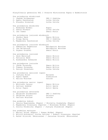 Klasyfikacja generalna RSL I Otwarte Mistrzostwa Kępna w Badmintonie Gra pojedyncza młodziczek 1. Jagoda Goldwasser 2. Agata Paszkowiak 3. Klaudia Grzesiak UKS 2 Sobótka Lotka Ostrów Lotka Ostrów Gra pojedyncza młodzików 1. Radosław Wróbel 2. Dawid Płokarz 3. Jan Żuber Kępno Lotka Ostrów Smecz Konin Gra pojedyncza juniorek młodszych 1. Sandra Smok Smecz Milicz 2. Kinga Barna UKS 2 Sobótka 3. Magdalena Paszkowiak Lotka Ostrów Gra pojedyncza juniorów młodszych 1. Sebastian Regeńczuk Matchpoint Wrocław 2. Jan Wolańczyk Matchpoint Wrocław 3. Szymon Grubski Smecz Konin Gra pojedyncza juniorek 1. Sara Waroczyk 2. Patrycja Smok 3. Aleksandra Szkwarek Smecz Milicz Smecz Milicz Smecz Milicz Gra pojedyncza juniorów 1. Jakub Poraszka 2. Tomasz Poraszka 3. Patryk Płomiński Smecz Milicz Smecz Milicz Lotka Ostrów Gra pojedyncza seniorek (open) 1. Justyna Rorat Baranów 2. Agata Rybak Siemianice 3. Halina Więcław Ostrów Gra pojedyncza senior (open) 1. Wojciech Cerazy 2. Dariusz Sobków 3. Artur Pupin Smecz Milicz Activ Opole Activ Opole Gra pojedyncza weteranów 1. Zbigniew Goldwasser 2. Zbigniew Dolata 3. Dariusz Więcław UKS 2 Sobótka Gniezno Ostrów Gra podwójna kobiet 1. Danuta Bagniewska (Kępno) / Wioletta Szymańska (Kępno) 2. Magdalena Orzeszyna (Opatów) / Wiesława Wróbel (Kępno) 3. Dorota Kłodnicka (Kępno) / Justyna Standziak (Kępno) Gra podwójna mężczyzn 1. Maciej Polak (Kępno) / Roman Wróbel (Kępno) 2. Witold Kołodziej (Lotka Ostrów) / Robert Orzeszyna (Opatów) 3. Rafał Glinicki (Wieruszów) / Jarosław Solecki (Wieruszów)