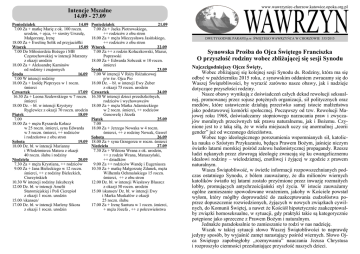 Intencje Mszalne 14.09 - 27.09 Poniedziałek 14.09 7.00 Za + matkę Marię z ok. 100 roczn. urodzin, + ojca, ++ siostry Urszulę, Małgorzatę, Irenę 18.00 Za + Ewelinę Solik od przyjaciółki Wtorek 15.09 7.00 Do Miłosierdzia Bożego i MB Częstochowskiej w intencji Marzeny z okazji urodzin 18.00 Za + Aleksandrę Kaminów od rodziny i znajomych Środa 16.09 7.00 W intencji rodziny 18.00 Za + Izoldę Pieprzyca w 1 roczn. śmierci Czwartek 17.09 16.30 Za + Leona Szalewskiego w 7 roczn. śmierci 18.00 Dz. – bł. w intencji Krystyny Ryglewicz z okazji 70 roczn. urodzin Piątek 18.09 7.00 18.00 Za + męża Ryszarda Kołacz w 25 roczn. śmierci, syna Edwarda w 3 roczn. śmierci, ++ rodziców i rodzeństwo z obu stron Sobota 19.09 18.00 Dz. bł. w intencji Marianny i Włodzimierza Matera z okazji 40 roczn. ślubu i rodziny Niedziela 20.09 7.30 Za + męża Krystiana, ++ rodziców 9.00 Za + Jana Bieleckiego w 12 roczn. śmierci, ++ z rodziny Bieleckich, Ciurzyńskich 10.30 W intencji rodziny Jakubczyk 12.00 Dz. bł. w intencji Amelii Staromiejskiej i Poli Cierepioł z okazji 1 roczn. urodzin 15.00 /skansen/ 17.00 Dz. bł. w intencji Marleny Sikora z okazji 1 roczn. urodzin Poniedziałek 21.09 7.00 Za + Jacka Piotrowskiego, ++ rodziców z obu stron 18.00 Za + męża Mieczysława Jasińskiego, ++ rodziców z obu stron Wtorek 22.09 7.00 Za ++ z rodzin Kołaczkowski, Mazur, Poprawski 18.00 Za + Edwarda Sobczak w 10 roczn. śmierci Środa 23.09 7.00 W intencji V Róży Różańcowej p/w św. Ojca Pio 18.00 Dz. – bł. w intencji Ewy Zuber z okazji 75 roczn. urodzin Czwartek 24.09 16.30 W intencji dzieci przedszkolnych, rodziców i wychowawców 18.00 Za + męża Marka Adamieckiego w 2 roczn. śmierci, ++ rodziców Genowefę i Józefa Piątek 25.09 7.00 18.00 Za + Jerzego Nowaka w 4 roczn. śmierci, ++ z rodziny Nowak, Gaweł Sobota 26.09 18.00 Za + syna Grzegorza w roczn. śmierci Niedziela 27.09 7.30 Za + Wiktora Wrana z ok. urodzin, ++ z rodzin Wrana, Matuszyński, ++ dziadków 9.00 Za ++ rodziców Wandę i Eugeniusza 10.30 Za + matkę Małgorzatę Zdunek, męża Wilhemla Ochmańskiego 15 roczn. śmierci, ++ z obu stron 12.00 Dz. bł. w intencji Wiesławy Bluszcz z okazji 50 roczn. urodzin 15.00 /skansen/ Dz. bł. w intencji Ewy i Marka Muskałów z okazji 25 roczn. ślubu 17.00 Za + Irenę Santura w 1 roczn. śmierci, + męża Józefa , ++ z pokrewieństwa WAWRZYN www.wawrzyniec-chorzow.katowice.opoka.org.pl DWUTYGODNIK PARAFII p.w. ŚWIĘTEGO WAWRZYŃCA W CHORZOWIE 355/2015 Synowska Prośba do Ojca Świętego Franciszka O przyszłość rodziny wobec zbliżającej się sesji Synodu Najczcigodniejszy Ojcze Święty, Wobec zbliżającej się kolejnej sesji Synodu ds. Rodziny, która ma się odbyć w październiku 2015 roku, z synowskim oddaniem zwracamy się do Waszej Świątobliwości, by wyrazić zarówno nasze obawy, jak i nadzieje dotyczące przyszłości rodziny. Nasze obawy wynikają z doświadczeń całych dekad rewolucji seksualnej, promowanej przez sojusz potężnych organizacji, sił politycznych oraz mediów, które ustawicznie działają przeciwko samej istocie małżeństwa jako podstawowej komórki społecznej. Począwszy od tzw. Rewolucji Majowej roku 1968, doświadczamy stopniowego narzucania praw i zwyczajów moralnych przeciwnych tak prawu naturalnemu, jak i Bożemu. Czynione jest to z taką siłą, że w wielu miejscach uczy się anormalnej „teorii gender” już od wczesnego dzieciństwa. Wobec tego ideologicznego porozumienia wspomnianych sił, katolicka nauka o Szóstym Przykazaniu, będąca Prawem Bożym, jaśnieje niczym światło latarni morskiej pośród zalewu hedonistycznej propagandy. Rzesze ludzi nękanych przez złowrogą ideologię zwracają się ku ewangelicznemu ideałowi rodziny – wielodzietnej, cnotliwej i żyjącej w zgodzie z prawem naturalnym. Wasza Świątobliwość, w świetle informacji rozpowszechnianych podczas ostatniego Synodu, z bólem zauważamy, że dla milionów wiernych katolików światło tej latarni zostało przyćmione przez inwazję rozmaitych lobby, promujących antychrześcijański styl życia. W istocie zauważamy ogólne zamieszanie spowodowane wrażeniem, jakoby w Kościele powstał wyłom, który mógłby doprowadzić do zaakceptowania cudzołóstwa poprzez dopuszczenie rozwiedzionych, żyjących w nowych związkach cywilnych, do Komunii Świętej, a nawet że Kościół hipotetycznie zaakceptowałby związki homoseksualne, w sytuacji, gdy praktyki takie są kategorycznie potępione jako sprzeczne z Prawem Bożym i naturalnym. Jednakże paradoksalnie to zamieszanie to rodzi w nas nadzieję. Wszak w takiej sytuacji słowo Waszej Świątobliwości to naprawdę jedyny sposób, by wyjaśnić zamęt narastający pośród wiernych. Słowo Ojca Świętego zapobiegłoby „rozmywaniu” nauczania Jezusa Chrystusa i rozproszyło ciemności przesłaniające przyszłość naszych dzieci. Błagamy Cię, Ojcze Święty, o takie słowo! Czynimy to z sercem przepełnionym oddaniem dla Waszej Świątobliwości oraz wszystkiego, co Wasza Świątobliwość reprezentuje. Mamy pewność, że słowo Biskupa Rzymu nigdy nie rozdzieli duszpasterskiej praktyki od nauki ustanowionej przez Jezusa Chrystusa i Jego namiestników, bowiem to tylko powiększyłoby panujący chaos. Wszak nasz Zbawiciel nauczał z całą jasnością, iż musi istnieć zgodność pomiędzy prawdą i życiem (J 14,6-7). Przestrzegał nas także, że jedynym sposobem by nie upaść, jest wcielanie w życie Jego nauki (Mt 7, 24-27). Prosząc o apostolskie błogosławieństwo, zapewniamy o naszej modlitwie do Świętej Rodziny – Jezusa, Maryi, i Józefa – o światło dla Waszej Świątobliwości w tych niesłychanie ważkich okolicznościach. Papieskie intencje Apostolstwa Modlitwy na miesiąc wrzesień: Intencja ogólna: Aby wzrastały możliwości kształcenia się i pracy dla wszystkich ludzi młodych. Intencja misyjna: Abyśmy katecheci dawali świadectwo życia zgodnego z wi