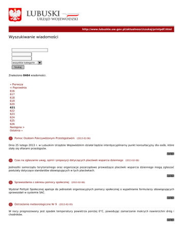 http://www.lubuskie.uw.gov.pl/aktualnosci/szukaj/printpdf.html Wyszukiwanie wiadomości wszystkie kategorie ... ▼ Szukaj Znaleziono 8464 wiadomości. « Pierwsza < Poprzednia 616 617 618 619 620 621 622 623 624 625 626 Następna > Ostatnia » Pomoc Osobom Pokrzywdzonym Przestępstwem (2013-02-06) Dnia 25 lutego 2013 r. w Lubuskim Urzędzie Wojewódzkim działał będzie interdyscyplinarny punkt konsultacyjny dla osób, które stały się ofiarami przestępstw. więcej Czas na zgłaszanie uwag, opinii i propozycji dotyczących placówek wsparcia dziennego (2013-02-06) Jednostki samorządu terytorialnego oraz organizacje pozarządowe prowadzące placówki wsparcia dziennego mogą zgłaszać postulaty dotyczące standardów obowiązujących w tych placówkach. więcej Sprawozdania z zakresu pomocy społecznej (2013-02-06) Wydział Polityki Społecznej apeluje do jednostek organizacyjnych pomocy społecznej o wypełnianie formularzy obowiązujących sprawozdań w systemie SAC. więcej Ostrzeżenie meteorologiczne Nr 9 (2013-02-05) W nocy prognozowany jest spadek temperatury powietrza poniżej 0°C, powodując zamarzanie mokrych nawierzchni dróg i chodników. więcej Nie żyje Andrzej Patalas współtwórca Autostrady Wielkopolskiej (2013-02-05) - Z ogromnym smutkiem przyjąłem wiadomość o śmierci Andrzeja Patalasa. Bez jego zaangażowania województwo lubuskie pod względem komunikacyjnym na mapie Polski byłoby w zupełnie innym miejscu - powiedział wojewoda lubski Marcin Jabłoński więcej Decyzja w sprawie obwodnicy Międzyrzecza coraz bliżej (2013-02-05) Wojewoda Marcin Jabłoński wszczął postępowanie w sprawie wydania decyzji o zezwoleniu na budowę drugiego pasa ruchu na obwodnicy Międzyrzecza . więcej OSTRZEŻENIE HYDROLOGICZNE Nr I:11 (2013-02-05) W związku z rozwojem sytuacji hydrologicznej w ciągu najbliższej doby przewiduje się przekroczenie stanów ostrzegawczych w Santoku nad Warta i Notecią. więcej Cyfrowe lekcje w Lubuskiem [wideo] (2013-02-05) W województwie lubuskim zakończył się I etap wdrażania rządowego programu „Cyfrowa Szkoła”. We wtorek w Szkole Podstawowej w Mirocinie Dolnym wojewoda Marcin Jabłoński podsumował projekt, dzięki któremu do lubuskich szkół trafił sprzęt o wartości miliona złotych. więcej Wojewoda zamknie I etap programu Cyfrowa szkoła (2013-02-04) Ponad milion złotych, prawie 400 komputerów, kilometry kabli, oprogramowanie, projektory, rzutniki drukarki i sknery. I etap projektu Cyfrowa Szkoła, realizowanego przez wojewodę lubuskiego Marcina Jabłońskiego został zakończony. Uroczyste podsumowanie odbędzie się w Szkole Podstawowej w Mirocinie Dolnym w gminie Kożuchów 5 lutego o godzinie10.00. więcej O byłym przejściu granicznym i terminalu w Świecku na antenie Radia Zachód (2013-02-04) Starosta słubicki przez wiele miesięcy uchylał się od wydania decyzji administracyjnej dotyczącej przekazania dawnego przejścia granicznego w świecku Generalnej Dyrekcji Dróg Krajowych i Autostrad – dyrektor Wydziału Gospodarki Nieruchomościami Lubuskiego Urzędu Wojewódzkiego Grzegorz Dłubek prostuje informacje, które na antenie Radia Zachód przekazał Andrzej Bycka. więcej « Pierwsza < Poprzednia 616 617 618 619 620 621 622 623 624 625 626 Następna > Ostatnia »