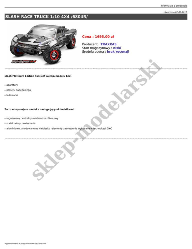 Informacje o produkcie Utworzono 02-03-2017 SLASH RACE TRUCK 1/10 4X4 /6804R/ Cena : 1695.00 zł sk i Producent : TRAXXAS Stan magazynowy : niski Średnia ocena : brak recenzji aparatury ● pakietu napędowego ● ładowarki el ● ar Slash Platinum Edition 4x4 jest wersją modelu bez: od Za to otrzymujesz model z następującymi dodatkami: regulowany centralny mechanizm różnicowy ● stabilizatory zawieszenia ● aluminiowe, anodowane na niebiesko elementy zawieszenia wykonane w technologii CNC sk le p- m ● Wygenerowano w programie www.oscGold.com