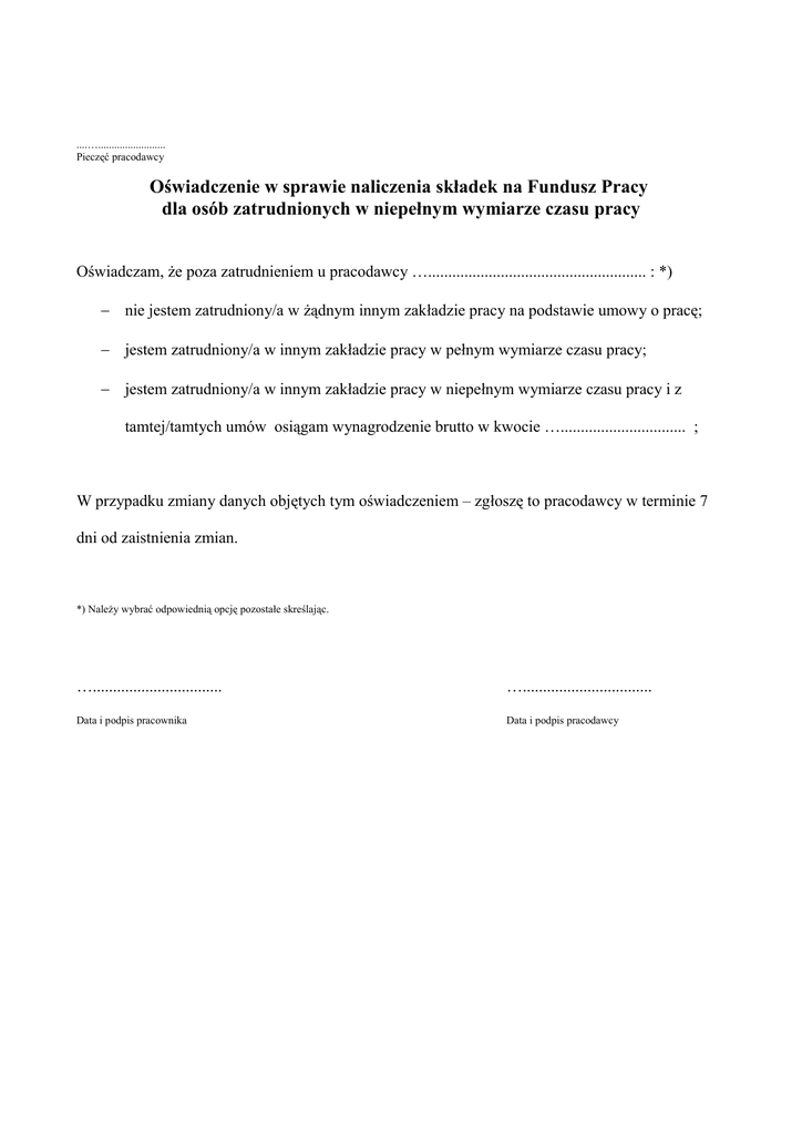 ....…......................... Pieczęć pracodawcy Oświadczenie w sprawie naliczenia składek na Fundusz Pracy dla osób zatrudnionych w niepełnym wymiarze czasu pracy Oświadczam, że poza zatrudnieniem u pracodawcy …...................................................... : *) − nie jestem zatrudniony/a w żądnym innym zakładzie pracy na podstawie umowy o pracę; − jestem zatrudniony/a w innym zakładzie pracy w pełnym wymiarze czasu pracy; − jestem zatrudniony/a w innym zakładzie pracy w niepełnym wymiarze czasu pracy i z tamtej/tamtych umów osiągam wynagrodzenie brutto w kwocie …............................... ; W przypadku zmiany danych objętych tym oświadczeniem – zgłoszę to pracodawcy w terminie 7 dni od zaistnienia zmian. *) Należy wybrać odpowiednią opcję pozostałe skreślając. …................................ …................................ Data i podpis pracownika Data i podpis pracodawcy