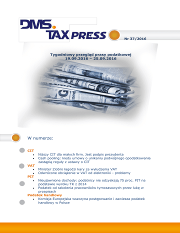 Nr 37/2016 Tygodniowy przegląd prasy podatkowej 19.09.2016 – 25.09.2016 W numerze: CIT VAT PIT Niższy CIT dla małych firm. Jest podpis prezydenta Cash pooling: kiedy umowy o unikaniu podwójnego opodatkowania zastąpią reguły z ustawy o CIT Minister Ziobro łagodzi kary za wyłudzenia VAT Odwrócone obciążenie w VAT od elektroniki - problemy Nieujawnione dochody: podatnicy nie odzyskają 75 proc. PIT na podstawie wyroku TK z 2014 Podatek od szkolenia pracowników tymczasowych przez lukę w przepisach Podatek handlowy Komisja Europejska wszczyna postępowanie i zawiesza podatek handlowy w Polsce CIT Niższy CIT dla małych firm. Jest podpis prezydenta Źródło: money.pl, 23-09-2016 Redakcja money.pl informuje o podpisaniu przez prezydenta nowelizacji ustawy o PIT i CIT, zgodnie z którą stawka podatku CIT dla małych podatników zostanie obniżona do 15%. Małym podatnikiem CIT jest płatnik CIT, którego przychód ze sprzedaży razem z kwotą należnego VAT nie przekroczył 1,2 mln euro rocznie. Redakcja przypomina, że obniżona stawka CIT dotyczyć będzie również podatników, którzy rozpoczynają swoją działalność. Na obniżony CIT nie mogą liczyć jednak podatkowe grupy kapitałowe, a także ci przedsiębiorcy, którzy będą dzielić swoją spółkę tylko po to, aby zapłacić niższą stawkę podatku. Co więcej, nowelizacja przewiduje przepisy uszczelniające pobór podatków dochodowych i uniemożliwiające niektóre sposoby optymalizacji. Nie będzie można na przykład preferencyjnie opodatkować wymiany udziałów, jeżeli jedynym albo głównym celem takiej transakcji będzie optymalizacja podatkowa. Doprecyzowano również kiedy dochód podatnika, który podlega ograniczonemu obowiązkowi podatkowemu jest uznawany za uzyskany na terytorium Polski. Pokaż artykuł Cash pooling: kiedy umowy o unikaniu podwójnego opodatkowania zastąpią reguły z ustawy o CIT Źródło: Rzeczpospolita, Aleksandra Tarka, 23-09-2016 Autorka omawia wyrok NSA dotyczący opodatkowania cash poolingu (sygn. akt II FSK 2299/14). Spółka wystąpiła do Dyrektora Izby Skarbowej z wnioskiem o interpretację wyjaśniając, że zamierza przystąpić do systemu wspólnego zarządzania płynnością finansową w ramach grupy kapitałowej. Realizację mechanizmu miał zapewnić bank z UE lub EOG, ale niemający siedziby w Polsce. Spółka zapytała, czy ma obowiązek pobierać podatek u źródła z tytułu wypłacanych odsetek na rzecz pool leadera w związku z uczestnictwem w cash poolingu. Sama uważała, że pytanie należy rozpatrywać w kontekście umów o unikaniu podwójnego opodatkowania, a nie art. 21 ust. 3 ustawy o CIT. Fiskus nie potwierdził stanowiska spółki wskazując, że aby zastosować postanowienia umów o unikaniu podwójnego opodatkowania dotyczące odsetek, podmiot, który te odsetki uzyska powinien mieć status rzeczywistego odbiorcy („beneficial owner”). Zdaniem organu, ze stanu faktycznego opisanego we wniosku o interpretację nie wynikało, czy bank będzie rzeczywistym odbiorcą odsetek. WSA w Gdańsku przychylił się do stanowiska organu. Wskazał, że jeżeli podmiot polski wypłaca odsetki na rzecz rezydenta z innego państwa, którego nie można uznać za rzeczywistego odbiorcę tych odsetek, Polska nie jest ograniczona umową o unikaniu podwójnego opodatkowania w zakresie możliwości opodatkowania tych odsetek. Wyrok NSA potwierdził to stanowisko. Pokaż artykuł Nr 37 / 2016 2 VAT Minister Ziobro łagodzi kary za wyłudzenia VAT Źródło: Rzeczpospolita, Agata Łukaszewicz, 21-09-2016 W poprzednich numerach TAX Press pisaliśmy o walce rządu z karuzelami podatkowymi, w tym o planowanych sankcjach karnych za wystawianie tzw. pustych faktur oraz podrabianie i przerabianie faktur w celu użycia ich jako autentycznych. Agata Łukaszewicz przypomina, że kilka dni temu rząd przyjął projekt zmian w Kodeksie Karnym w tym zakresie. W tym tygodniu jednak, po spotkaniu z przedsiębiorcami Minister Sprawiedliwości zapowiedział wprowadzenie poprawek w projekcie i ich rekomendację w Sejmie. Zbigniew Ziobro chce złagodzić przewidziane pierwotnie sankcje. Zapowiada, że przestępstwo fałszowania faktur VAT będzie zbrodnią dopiero powyżej 5 mln zł (obecnie w projekcie przewidziana jest kwota 1 mln zł). Kara od 5 do 15 lat pozbawienia wolności, a w najcięższych przypadkach kara 25 pozbawienia wolności grozić będzie natomiast za sfałszowanie faktur opiewających na kwotę powyżej 10 mln zł (obecnie – 5 mln zł). Minister zapowiedział również wszczęcie śledztwa przeciwko przedstawicielom organów państwa, którzy w latach 2011-2015 zlekceważyli informacje przedsiębiorców, dotyczące funkcjonujących w Polsce karuzeli podatkowych. Pokaż artykuł Odwrócone obciążenie w VAT od elektroniki - problemy Źródło: Rzeczpospolita, Paweł Rochowicz, 21-09-2016 Autor alarmuje, że organy wciąż wszczynają postępowania dotyczące rzekomych przewinień podatników w zakresie wyłudzeń VAT w branży elektronicznej sprzed lipca 2015 roku. 1 lipca tego roku wprowadzono bowiem system odwróconego obciążenia VAT dla drobnej elektroniki. Skarbówka ciągle prowadzi jednak wiele kontroli skarbowych, które dotyczą okresu sprzed wprowadzenia przepisów. Organy zarzucają przedsiębiorcom prowadzenie interesów z oszustami i odmawiają im odliczenia VAT od tych transakcji, nakazując zapłacenie podatku. Autor przytacza przykład spółki Action, której reprezentant twierdzi, że kontrola skarbowa zarzuca spółce zmowę z firmą wyłudzającą VAT tylko na podstawie faktu, że reprezentanci Action spotkali się z oszustami. Równocześnie brak bezpośredniego kontaktu z reprezentantem kontrahenta także bywa podejrzany dla skarbówki. Kolejnym problemem jest fakt, że niektóre kontrole dotyczą okresu między 2012 a 2014 rokiem, w którym przedsiębiorcy nie byli nawet świadomi istnienia karuzeli podatkowych. Wielu przedsiębiorców n