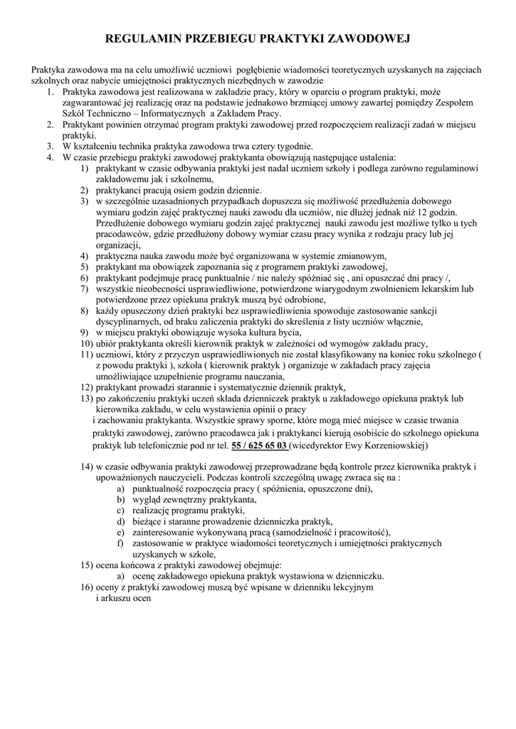 REGULAMIN PRZEBIEGU PRAKTYKI ZAWODOWEJ Praktyka zawodowa ma na celu umożliwić uczniowi pogłębienie wiadomości teoretycznych uzyskanych na zajęciach szkolnych oraz nabycie umiejętności praktycznych niezbędnych w zawodzie 1. Praktyka zawodowa jest realizowana w zakładzie pracy, który w oparciu o program praktyki, może zagwarantować jej realizację oraz na podstawie jednakowo brzmiącej umowy zawartej pomiędzy Zespołem Szkół Techniczno – Informatycznych a Zakładem Pracy. 2. Praktykant powinien otrzymać program praktyki zawodowej przed rozpoczęciem realizacji zadań w miejscu praktyki. 3. W kształceniu technika praktyka zawodowa trwa cztery tygodnie. 4. W czasie przebiegu praktyki zawodowej praktykanta obowiązują następujące ustalenia: 1) praktykant w czasie odbywania praktyki jest nadal uczniem szkoły i podlega zarówno regulaminowi zakładowemu jak i szkolnemu, 2) praktykanci pracują osiem godzin dziennie. 3) w szczególnie uzasadnionych przypadkach dopuszcza się możliwość przedłużenia dobowego wymiaru godzin zajęć praktycznej nauki zawodu dla uczniów, nie dłużej jednak niż 12 godzin. Przedłużenie dobowego wymiaru godzin zajęć praktycznej nauki zawodu jest możliwe tylko u tych pracodawców, gdzie przedłużony dobowy wymiar czasu pracy wynika z rodzaju pracy lub jej organizacji, 4) praktyczna nauka zawodu może być organizowana w systemie zmianowym, 5) praktykant ma obowiązek zapoznania się z programem praktyki zawodowej, 6) praktykant podejmuje pracę punktualnie / nie należy spóźniać się , ani opuszczać dni pracy /, 7) wszystkie nieobecności usprawiedliwione, potwierdzone wiarygodnym zwolnieniem lekarskim lub potwierdzone przez opiekuna praktyk muszą być odrobione, 8) każdy opuszczony dzień praktyki bez usprawiedliwienia spowoduje zastosowanie sankcji dyscyplinarnych, od braku zaliczenia praktyki do skreślenia z listy uczniów włącznie, 9) w miejscu praktyki obowiązuje wysoka kultura bycia, 10) ubiór praktykanta określi kierownik praktyk w zależności od wymogów zakładu pracy, 11) uczniowi, który z przyczyn usprawiedliwionych nie został klasyfikowany na koniec roku szkolnego ( z powodu praktyki ), szkoła ( kierownik praktyk ) organizuje w zakładach pracy zajęcia umożliwiające uzupełnienie programu nauczania, 12) praktykant prowadzi starannie i systematycznie dziennik praktyk, 13) po zakończeniu praktyki uczeń składa dzienniczek praktyk u zakładowego opiekuna praktyk lub kierownika zakładu, w celu wystawienia opinii o pracy i zachowaniu praktykanta. Wszystkie sprawy sporne, które mogą mieć miejsce w czasie trwania praktyki zawodowej, zarówno pracodawca jak i praktykanci kierują osobiście do szkolnego opiekuna praktyk lub telefonicznie pod nr tel. 55 / 625 65 03 (wicedyrektor Ewy Korzeniowskiej) 14) w czasie odbywania praktyki zawodowej przeprowadzane będą kontrole przez kierownika praktyk i upoważnionych nauczycieli. Podczas kontroli szczególną uwagę zwraca się na : a) punktualność rozpoczęcia pracy ( spóźnienia, opuszczone dni), b) wygląd zewnętrzny praktykanta, c) realizację programu praktyki, d) bieżące i staranne prowadzenie dzienniczka praktyk, e) zainteresowanie wykonywaną pracą (samodzielność i pracowitość), f) zastosowanie w praktyce wiadomości teoretycznych i umiejętności praktycznych uzyskanych w szkole, 15) ocena końcowa z praktyki zawodowej obejmuje: a) ocenę zakładowego opiekuna praktyk wystawiona w dzienniczku. 16) oceny z praktyki zawodowej muszą być wpisane w dzienniku lekcyjnym i arkuszu ocen INSTRUKCJA PROWADZENIA DZIENNICZKA PRAKTYK ZAWODOWYCH 1. Dzienniczek praktyk stanowi podstawowy dokument zaliczenia praktyki i należy go prowadzić zgodnie z objaśnieniami dla praktykanta. 2. Każdy dzienny zapis w dzienniczku powinien być potwierdzony podpisem osoby, która w danym dniu prowadziła szkolenie praktyczne 3. Dzienniczek należy prowadzić bardzo starannie, czytelnie i systematycznie. Istotne sprawy powinny być podkreślone. 4. W ostatnim dniu praktyki należy uzupełnić zapisy w dzienniczku oraz złożyć u zakładowego opiekuna praktyk w celu wystawienia przez niego opinii o pracy i sprawowaniu praktykanta. 5. Po zakończeniu praktyk zawodowych (tj-03 czerwca 2013r.) uczeń składa dzienniczek praktyk u Pani wicedyrektor Ewy Korzeniowskiej. PROGRAM PRAKTYKI – technik elektronik Praktyka zawodowa (wyciąg z programu nauczania dla zawodu - Technik Elektronik) Praca przy obsłudze i konserwacji urządzeń elektronicznych (w zakładach, w których są stosowane urządzenia elektryczne) 1. Szczegółowe cele kształcenia W wyniku zorganizowanego procesu kształcenia uczeń (słuchacz) powinien umieć: - zainstalować urządzenia elektroniczne, - uruchomić urządzenia elektroniczne, - obsłużyć i nadzorować pracę urządzeń elektronicznych, - dokonać okresowych konserwacji urządzeń elektronicznych, - lokalizować i usuwać drobne usterki. 2. Materiał nauczania Zapoznanie uczniów (słuchaczy) z organizacją zakładu pracy. Przeszkolenie uczniów z zakresu BHP. Zapoznanie uczniów z zarządzeniami obowiązującymi w zakładzie. Zapoznanie z dokumentacją techniczną i obsługą urządzeń elektronicznych. Praca przy instalowaniu i uruchamianiu urządzeń elektronicznych. Praca przy lokalizowaniu i usuwaniu drobnych usterek. Praktyka zawodowa (wyciąg z programu nauczania dla zawodu - Technik Elektronik) Praca w serwisie urządzeń elektronicznych (w warsztatach naprawczych urządzeń elektronicznych) 1. Szczegółowe cele kształcenia W wyniku zorganizowanego procesu kształcenia uczeń (słuchacz) powinien umieć: - posłużyć się dokumentacją serwisową urządzeń elektronicznych, - obsłużyć przyrządy pomiarowe i testery podczas napraw, - zastosować typowe sposoby i techniki lokalizacji uszkodzeń, - wymienić uszkodzone elementy i układy, - uruchomić urządzenia po dokonaniu wymiany uszkodzonych elementów. 2. Materiał nauczania