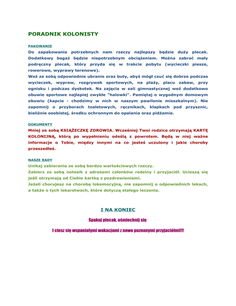 PORADNIK KOLONISTY PAKOWANIE Do zapakowania potrzebnych nam rzeczy najlepszy będzie duży plecak. Dodatkowy bagaż będzie niepotrzebnym obciążeniem. Można zabrać mały podręczny plecak, który przyda się w trakcie pobytu (wycieczki piesze, rowerowe, wyprawy terenowe). Weź ze sobą odpowiednie ubranie oraz buty, abyś mógł czuć się dobrze podczas wycieczek, wypraw, rozgrywek sportowych, na plaży, placu zabaw, przy ognisku i podczas dyskotek. Na zajęcia w sali gimnastycznej weź dodatkowo obuwie sportowe najlepiej zwykłe "halowki". Pamiętaj o wygodnym domowym obuwiu (kapcie - chodzimy w nich w naszym pawilonie mieszkalnym). Nie zapomnij o przyborach toaletowych, ręcznikach, klapkach pod przysznic, bieliźnie osobistej, środku ochronnym do opalania oraz pidżamie. DOKUMENTY Mniej ze sobą KSIĄŻECZKĘ ZDROWIA. Wcześniej Twoi rodzice otrzymają KARTĘ KOLONIJNĄ, którą po wypełnieniu odeślą z powrotem. Będą w niej ważne informacje o Tobie, między innymi na co jesteś uczulony i jakie choroby przeszedłeś. NASZE RADY Unikaj zabierania ze sobą bardzo wartościowych rzeczy. Zabierz ze sobą notesik z adresami członków rodziny i przyjaciół. Ucieszą się jeśli otrzymają od Ciebie kartkę z pozdrowieniami. Jeżeli chorujesz na chorobę lokomocyjną, nie zapomnij o odpowiednich lekach, a także o tych lekarstwach, które dotyczą stałego leczenia. I NA KONIEC Spakuj plecak, uśmiechnij się I ciesz się wspaniałymi wakacjami z nowo poznanymi przyjaciółmi!!!