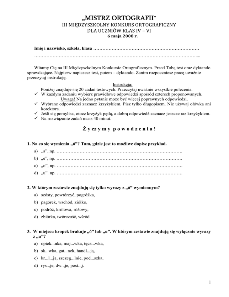 „MISTRZ ORTOGRAFII” III MIĘDZYSZKOLNY KONKURS ORTOGRAFICZNY DLA UCZNIÓW KLAS IV – VI 6 maja 2008 r. Imię i nazwisko, szkoła, klasa …………………………………………………………… …………………………………………………………………………………………….... Witamy Cię na III Międzyszkolnym Konkursie Ortograficznym. Przed Tobą test oraz dyktando sprawdzające. Najpierw napiszesz test, potem – dyktando. Zanim rozpoczniesz pracę uważnie przeczytaj instrukcję. Instrukcja: Poniżej znajduje się 20 zadań testowych. Przeczytaj uważnie wszystkie polecenia. W każdym zadaniu wybierz prawidłowe odpowiedzi spośród czterech proponowanych. Uwaga! Na jedno pytanie może być więcej poprawnych odpowiedzi. Wybrane odpowiedzi zaznacz krzyżykiem. Pisz tylko długopisem. Nie używaj ołówka ani korektora. Jeśli się pomylisz, otocz krzyżyk pętlą, a dobrą odpowiedź zaznacz jeszcze raz krzyżykiem. Na rozwiązanie zadań masz 40 minut. Ż y cz y m y p o w o d z e n i a ! 1. Na co się wymienia „ó”? Tam, gdzie jest to możliwe dopisz przykład. a) „a”, np. ………………………………………………………………………. b) „e”, np. ………………………………………………………………………. c) „o”, np. ………………………………………………………………………. d) „u”. np. ………………………………………………………………………. 2. W którym zestawie znajdują się tylko wyrazy z „ó” wymiennym? a) szósty, powtórzyć, pogróżka, b) pagórek, wschód, ziółko, c) podróż, królowa, różowy, d) zbiórka, twórczość, wśród. 3. W miejscu kropek brakuje „ó” lub „u”. W którym zestawie znajdują się wyłącznie wyrazy z „u”? a) opiek...nka, maj...wka, tęcz...wka, b) sk...wka, gat...nek, handl...ją, c) kr...l...ją, szczeg...lnie, pod...szka, d) rys...je, dw...je, post...j. 1 4. Co piszemy wielką literą? a) nazwy miesięcy, b) nazwy członków rodziny, c) imiona i nazwiska, d) nazwy gwiazd. 5. W którym zestawie dopisałbyś wszędzie wielkie litery? a) (G, g) …óry (Ś, ś) ...więtokrzyskie, (W, w) ...ielkanoc, b) (M, m) ...orze (B, b) ...ałtyk, (W, w ) ...ielka (B, b) ...rytania, c) (B, b) ...elweder, (G, g) ...azeta (W, w) ...yborcza, d) (W, w) ...arszawiak, (E, e) …uropa, (E, e) ...uro. 6. Kiedy piszemy „rz”? a) gdy wymienia się na „r”, b) po spółgłoskach: l, m, n, c) po spółgłoskach: b, j, t, d) w zakończeniach rzeczowników rodzaju męskiego. 7. W miejscu kropek brakuje „rz”, „ż” lub „sz”. W którym zestawie występują wyrazy tylko z „rz”? a) k...tałt, bu...a, ch...est, b) ...adko, ja...ębina, kątomie..., c) rowe...ysta, ...ędy, w...eciono, d) w...ask, najlep...y, t...miel. 8. W którym zestawie wszystkie wyrazy zawierają „rz” niewymienne? a) dworzanin, kurz, b) pancerz, marzec, c) korzeń, talerz, d) orzech, wierzba. 9. Kiedy piszemy „ż”? Wybierz odpowiedzi, w których wszystkie wymienione spółgłoski są prawidłowe. a) gdy wymienia się na: z, s, g, h, b) gdy wymienia się na: sz, cz, rz, c) po spółgłoskach: l. ł, m, d) po spółgłoskach: p, d, w. 2 10. W miejscu kropek brakuje „rz” lub „ż”. W którym zestawie nie ma wyrazów z „ż”? a) ...eka, tak...e, skar...yć; b) wzo...ysty, zda...enie, gara...; c) g...ebień, tchó..., u...ądzenie; d) ul...yć, dru...yna, in...ynier. 11. Wskaż zestaw, w którym wszystkie wyrazy z partykułą „nie” zapisane są poprawnie. a) nie wiem, nie chciało, b) nie nawidzić, nie jedząc, c) nie każdy, nie mój, d) niedrogo, niecierpliwość. 12. Wskaż zestaw, w którym jest wyraz z błędem ortograficznym”. a) źródło, córka, brzózka, b) maluję, rysuję, wędruję c) stalówka, zasówka, surówka d) humor, chaos, tulejka. 13. W którym zestawie na końcu wszystkich wyrazów dopisałbyś(abyś) jeszcze jedno „i”? a) poezji(?), lekcji(?), b) histori (?), Austri(?), c) Azji(?), Klaudi(?), d) Kasi(?), ziemi (?). 14. W miejscu kropek brakuje „h” lub „ch”. W którym zestawie znajduje się tylko jeden wyraz z „h” i dwa pozostałe z „ch”? a) brzu..., s...ody, dru..., b) ...inka, ...uśtawka, mu...a, c) ...ałas, ...erbata, wa...adło, d) ...omogenizowany, ...urtownia, ar...itekt. 15. Wskaż zdanie, w którym pojawia się błąd w pisowni wyrazów z „ą, ę, em, om, en, on”. a) Jacek ma wysoką tęperaturę. b) Dentysta plombował Kasi ząb. c) Wieczorem pójdę z bratem do kina. d) Nie umię wytłumaczyć moim młodszym siostrom zadania domowego. 3 16. Wpisz skojarzenia (wyrazy z trudnością ortograficzną) w miejsce kropek. a) ciepło, piach, słońce, leżenie ............................................................................................... b) stolica, smok, ołtarz Wita Stwosza ...................................................................................... c) zwierzę, skóra, futro, ciepło, odzienie ................................................................................. d) pszczoła, słodycz, plaster .................................................................................................... 17. Wytłumacz pisownię podanych wyrazów, dopisując ich uzasadnienie. (np. zgrzyt - rz po spółgłosce g) a) hiperbola - ................................................................................................................................ b) złotówka - ................................................................................................................................. c) masarz - ................................................................................................................................... d) cichy - ....................................................................................................................................... e) pieniążek - ...................