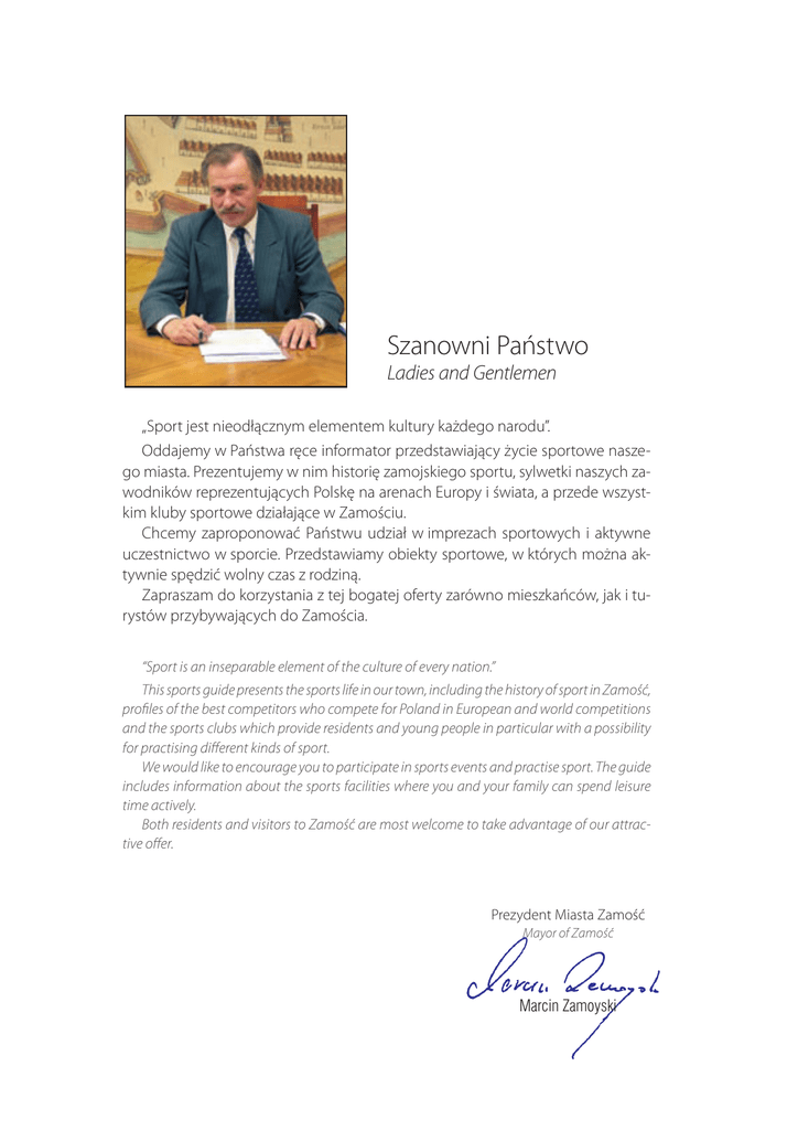 Szanowni Państwo Ladies and Gentlemen „Sport jest nieodłącznym elementem kultury każdego narodu”. Oddajemy w Państwa ręce informator przedstawiający życie sportowe naszego miasta. Prezentujemy w nim historię zamojskiego sportu, sylwetki naszych zawodników reprezentujących Polskę na arenach Europy i świata, a przede wszystkim kluby sportowe działające w Zamościu. Chcemy zaproponować Państwu udział w imprezach sportowych i aktywne uczestnictwo w sporcie. Przedstawiamy obiekty sportowe, w których można aktywnie spędzić wolny czas z rodziną. Zapraszam do korzystania z tej bogatej oferty zarówno mieszkańców, jak i turystów przybywających do Zamościa. “Sport is an inseparable element of the culture of every nation.” This sports guide presents the sports life in our town, including the history of sport in Zamość, profiles of the best competitors who compete for Poland in European and world competitions and the sports clubs which provide residents and young people in particular with a possibility for practising different kinds of sport. We would like to encourage you to participate in sports events and practise sport. The guide includes information about the sports facilities where you and your family can spend leisure time actively. Both residents and visitors to Zamość are most welcome to take advantage of our attractive offer. Prezydent Miasta Zamość Mayor of Zamość Marcin Zamoyski Zamość - miasto idealne Zamość - miasto idealne Zamość - an ideal town Zamość - an ideal town Zamość miasto idealne Stare Miasto The Old Town Zamość jest jednym z najpiękniejszych europejskich miast. Otoczone murami Stare Miasto w 1992 r. wpisane zostało na listę Światowego Dziedzictwa Kultury UNESCO, a czytelnicy dziennika „Rzeczpospolita” uznali je za jeden z „7 cudów Polski”. Zamość założył w 1580 r. hetman i kanclerz wielki koronny – Jan Zamoyski. Budował je w sportowym tempie i w ciągu kilkunastu lat wzniósł spore, potężnie ufortyfikowane miasto. W obrębie murów tej prywatnej twierdzy znalazły się: rezydencja właściciela, akademia, kościoły, sądy i inne instytucje oraz kamienice mieszczańskie. Wielokulturowy Zamość, do którego ściągali Grecy, Ormianie, Żydzi, Niemcy, Włosi, Anglicy, Holendrzy, szybko zyskał miano jednego z centrów handlu, kultury i nauki o europejskiej randze. Sercem Starego Miasta jest Rynek Wielki – jeden z najwspanialszych placów Europy. Otaczają go podcieniowe kamienice mieszczańskie, a dominuje nad nim ratusz z charakterystyczną 52-metrową wieżą. Spośród ponad dwustu zabytków na szczególną uwagę zasługują: katedra, akademia, pałac Zamoyskich, arsenał, bramy i mury otaczające miasto oraz – przypominające o jego wielokulturowości – kamienice ormiańskie, dawna cerkiew grecka i synagoga. Katedra 2 The Cathedral Obecnie Zamość liczy 70 tysięcy mieszkańców i jest największym miastem południowej Lubelszczyzny. Jest ważnym ośrodkiem turystycznym, a dodatkowym jego atutem jest położenie u stóp malowniczych wzgórz Roztocza. To miasto ludzi młodych. W zamojskich szkołach uczy się ok. 20 tys. osób, a w szkołach wyższych studiuje blisko 6 tys. studentów. W mieście, zwłaszcza latem, odbywa się wiele imprez kulturalnych i sportowych, często o randze krajowej i międzynarodowej. Ze sportowych warto wymienić choćby, mający zawsze międzynarodową obsadę, Bieg Pokoju Pamięci Dzieci Zamojszczyzny i – skupiający młodych zawodników z kilku krajów – Międzynarodowy Festiwal Sportu Dzieci i Młodzieży. Organizacji imprez sportowych, a na co dzień zawodnikom i zwolennikom aktywnego spędzania czasu, służy bardzo dobra i stale modernizowana i rozbudowywana baza sportowa: kryta pływalnia, zalew, korty tenisowe, boiska, skateparki, hale sportowe, a przede wszystkim znakomite i pięknie położone obiekty Ośrodka Sportu i Rekreacji. Pomnik Jana Zamoyskiego Monument to Jan Zamoyski Rynek Wielki The Great Market 3 Zamość - miasto idealne Zamość - miasto idealne Zamość - an ideal town Zamość - an ideal town Zamość – an ideal town Arsenał The Arsenal Rynek Solny Zamość is one the most beautiful European towns. Surrounded by mighty defensive walls the Old Town was inscribed on the UNESCO World Cultural Heritage List in 1992 and the readers of a Polish daily Rzeczpospolita decided it was one of the Seven Wonders of Poland. The town was established in 1580 by Jan Zamoyski, a hetman and great crown chancellor and its construction progressed with impressive speed – after a dozen or so years the project was completed. Mighty defensive walls of this private fortress surrounded the founder’s residence, the academy, temples, courts and other institutions as well as mercantile bourgeois houses. Multicultural Zamość, which attracted Greek, Armenian, Jewish, German, Italian as well as British and Dutch settlers, soon became a center of trade, culture and science of European renown. The Rynek, one of the most magnificent squares in Europe, is the heart of the Old Town. Ringed by arcaded houses it is dominated by the town hall with its unique 52-meter tower. Among over two hundred architectural gems the most important ones are the cathedral, the academy, the Zamoyski family palace, the arsenal, the gates and walls which surround the town and the buildings which remind visitors and residents about the multicultural nature of the town, i.e. Armenian bourgeois houses, the former Greek Orthodox church and the synagogue. At present Zamość has 70 thousand residents and is the largest town in southern Lublin Region as well as an important tourist center. Its favourable location at the foot of the hills making up the Roztocze district constitutes an additional merit. Zamość is the town of young people. About 26 thousand students go to different schools in Zamość, 6 thousand of whom attend higher education schools. Many cultural and sports events