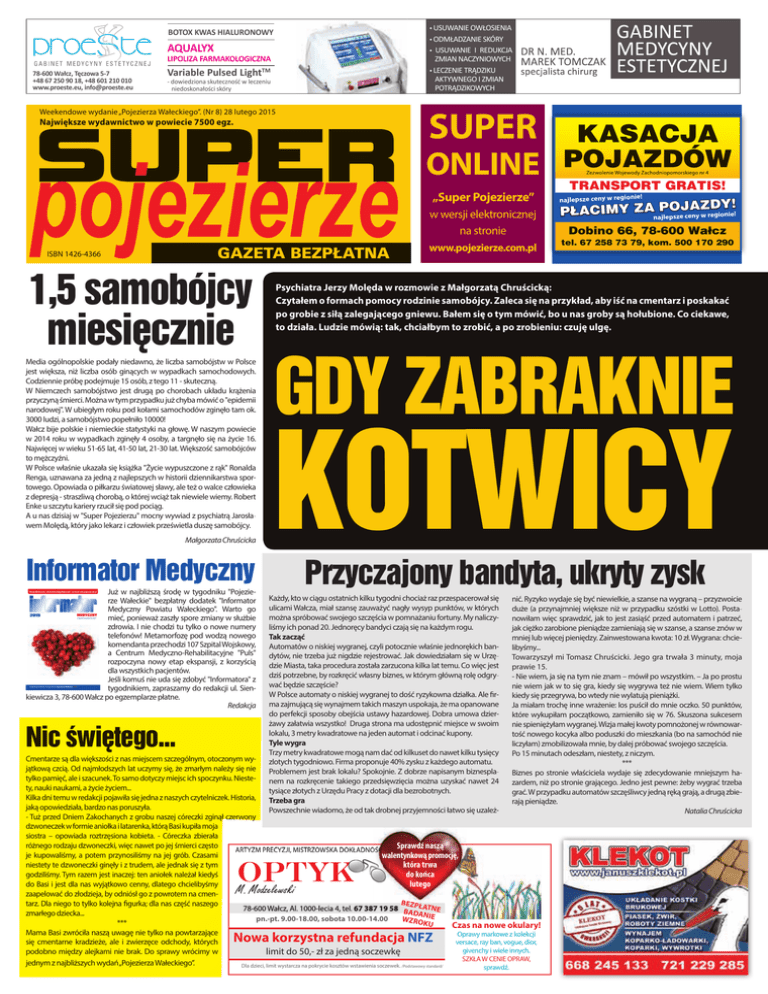 • USUWANIE OWŁOSIENIA • ODMŁADZANIE SKÓRY • USUWANIE I REDUKCJA ZMIAN NACZYNIOWYCH • LECZENIE TRĄDZIKU AKTYWNEGO I ZMIAN POTRĄDZIKOWYCH BOTOX KWAS HIALURONOWY AQUALYX LIPOLIZA FARMAKOLOGICZNA 78-600 Wałcz, Tęczowa 5-7 +48 67 250 90 18, +48 601 210 010 www.proeste.eu, [email protected] Variable Pulsed LightTM - dowiedziona skuteczność w leczeniu niedoskonałości skóry Weekendowe wydanie „Pojezierza Wałeckiego”. (Nr 8) 28 lutego 2015 SUPER Największe wydawnictwo w powiecie 7500 egz. SUPER ONLINE „Super Pojezierze” w wersji elektronicznej na stronie ISBN 1426-4366 GAZETA BEZPŁATNA 1,5 samobójcy miesięcznie Media ogólnopolskie podały niedawno, że liczba samobójstw w Polsce jest większa, niż liczba osób ginących w wypadkach samochodowych. Codziennie próbę podejmuje 15 osób, z tego 11 - skuteczną. W Niemczech samobójstwo jest drugą po chorobach układu krążenia przyczyną śmierci. Można w tym przypadku już chyba mówić o "epidemii narodowej". W ubiegłym roku pod kołami samochodów zginęło tam ok. 3000 ludzi, a samobójstwo popełniło 10000! Wałcz bije polskie i niemieckie statystyki na głowę. W naszym powiecie w 2014 roku w wypadkach zginęły 4 osoby, a targnęło się na życie 16. Najwięcej w wieku 51-65 lat, 41-50 lat, 21-30 lat. Większość samobójców to mężczyźni. W Polsce właśnie ukazała się książka "Życie wypuszczone z rąk" Ronalda Renga, uznawana za jedną z najlepszych w historii dziennikarstwa sportowego. Opowiada o piłkarzu światowej sławy, ale też o walce człowieka z depresją - straszliwą chorobą, o której wciąż tak niewiele wiemy. Robert Enke u szczytu kariery rzucił się pod pociąg. A u nas dzisiaj w "Super Pojezierzu" mocny wywiad z psychiatrą Jarosławem Molędą, który jako lekarz i człowiek prześwietla duszę samobójcy. Małgorzata Chruścicka Informator Medyczny Już w najbliższą środę w tygodniku "Pojezierze Wałeckie" bezpłatny dodatek "Informator Medyczny Powiatu Wałeckiego". Warto go 2015 mieć, ponieważ zaszły spore zmiany w służbie zdrowia. I nie chodzi tu tylko o nowe numery telefonów! Metamorfozę pod wodzą nowego komendanta przechodzi 107 Szpital Wojskowy, a Centrum Medyczno-Rehabilitacyjne "Puls" rozpoczyna nowy etap ekspansji, z korzyścią dla wszystkich pacjentów. Jeśli komuś nie uda się zdobyć "Informatora" z tygodnikiem, zapraszamy do redakcji ul. Sienkiewicza 3, 78-600 Wałcz po egzemplarze płatne. Redakcja Wersja elektroniczna „Informatora Usług Medycznych” na stronie www.pojezerze.com.pl MEDYCZNY POWIATU WAŁECKIEGO bezpłatny dodatek do tygodnika Pojezierze Wałeckie ●●● 1 Nic świętego... www.pojezierze.com.pl KASACJA POJAZDÓW Zezwolenie Wojewody Zachodniopomorskiego nr 4 TRANSPORT GRATIS! ie! najlepsze ceny w region JAZDY! PŁACIMY ZAnajPlepO sze ceny w regionie! Dobino 66, 78-600 Wałcz tel. 67 258 73 79, kom. 500 170 290 Psychiatra Jerzy Molęda w rozmowie z Małgorzatą Chruścicką: Czytałem o formach pomocy rodzinie samobójcy. Zaleca się na przykład, aby iść na cmentarz i poskakać po grobie z siłą zalegającego gniewu. Bałem się o tym mówić, bo u nas groby są hołubione. Co ciekawe, to działa. Ludzie mówią: tak, chciałbym to zrobić, a po zrobieniu: czuję ulgę. GDY ZABRAKNIE KOTWICY Przyczajony bandyta, ukryty zysk Każdy, kto w ciągu ostatnich kilku tygodni chociaż raz przespacerował się ulicami Wałcza, miał szansę zauważyć nagły wysyp punktów, w których można spróbować swojego szczęścia w pomnażaniu fortuny. My naliczyliśmy ich ponad 20. Jednoręcy bandyci czają się na każdym rogu. Tak zacząć Automatów o niskiej wygranej, czyli potocznie właśnie jednorękich bandytów, nie trzeba już nigdzie rejestrować. Jak dowiedziałam się w Urzędzie Miasta, taka procedura została zarzucona kilka lat temu. Co więc jest dziś potrzebne, by rozkręcić własny biznes, w którym główną rolę odgrywać będzie szczęście? W Polsce automaty o niskiej wygranej to dość ryzykowna działka. Ale firma zajmującą się wynajmem takich maszyn uspokaja, że ma opanowane do perfekcji sposoby obejścia ustawy hazardowej. Dobra umowa dzierżawy załatwia wszystko! Druga strona ma udostępnić miejsce w swoim lokalu, 3 metry kwadratowe na jeden automat i odcinać kupony. Tyle wygra Trzy metry kwadratowe mogą nam dać od kilkuset do nawet kilku tysięcy zlotych tygodniowo. Firma proponuje 40% zysku z każdego automatu. Problemem jest brak lokalu? Spokojnie. Z dobrze napisanym biznesplanem na rozkręcenie takiego przedsięwzięcia można uzyskać nawet 24 tysiące złotych z Urzędu Pracy z dotacji dla bezrobotnych. Trzeba gra Powszechnie wiadomo, że od tak drobnej przyjemności łatwo się uzależ- nić. Ryzyko wydaje się być niewielkie, a szanse na wygraną – przyzwoicie duże (a przynajmniej większe niż w przypadku szóstki w Lotto). Postanowiłam więc sprawdzić, jak to jest zasiąść przed automatem i patrzeć, jak ciężko zarobione pieniądze zamieniają się w szanse, a szanse znów w mniej lub więcej pieniędzy. Zainwestowana kwota: 10 zł. Wygrana: chcielibyśmy... Towarzyszył mi Tomasz Chruścicki. Jego gra trwała 3 minuty, moja prawie 15. - Nie wiem, ja się na tym nie znam – mówił po wszystkim. – Ja po prostu nie wiem jak w to się gra, kiedy się wygrywa też nie wiem. Wiem tylko kiedy się przegrywa, bo wtedy nie wylatują pieniążki. Ja miałam trochę inne wrażenie: los puścił do mnie oczko. 50 punktów, które wykupiłam początkowo, zamieniło się w 76. Skuszona sukcesem nie spieniężyłam wygranej. Wizja małej kwoty pomnożonej w równowartość nowego kocyka albo poduszki do mieszkania (bo na samochód nie liczyłam) zmobilizowała mnie, by dalej próbować swojego szczęścia. Po 15 minutach odeszłam, niestety, z niczym. *** Biznes po stronie właściciela wydaje się zdecydowanie mniejszym hazardem, niż po stronie grającego. Jedno jest pewne: żeby