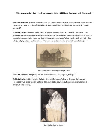 Wspomnienia z lat szkolnych mojej babci Elżbiety Szubert z d. Tomczyk Julita Mielczarek: Babciu, czy chodziłaś do szkoły podstawowej prowadzonej przez siostry zakonne w Lipce przy Parafii Kościoła Starokatolickiego Mariawitów, w budynku starej plebanii? Elżbieta Szubert: Niestety nie, za moich czasów szkoły już tam nie było. Po roku 1950 mariawicką szkołę podstawową przeniesiono do Niesułkowa na miejsce obecnej szkoły. Ja chodziłam tam od pierwszej do ósmej klasy. W domu parafialnym odbywały się już tylko lekcje religii, dzieci wystawiały jasełka i inne przedstawienia o tematyce religijnej. Fot. archiwalna: Kościół z plebanią w Lipce Julita Mielczarek: Mogłabyś mi powiedzieć Babciu kto Cię uczył religii? Elżbieta Szubert: Oczywiście. Była to siostra Marianna Pełka, s. Sewera Kieliszczyk i s. Lubosława, oraz kapłan Gabriel Kamer. Siostra Sewera była wcześniej długoletnią kierowniczką szkoły. Fot. Kapłan Gabriel Kamer Julita Mielczarek: W którym roku to było ? Elżbieta Szubert: W 1957 roku zapisała mnie mama na lekcje religii, byłam wówczas w I klasie. W II klasie przystąpiłam do Pierwszej Komunii Świętej, do której przygotowywały mnie siostry Marianna i Sewera. Fot. Siostry: Marianna i Sewera. Julita Mielczarek: Do którego roku Siostry uczyły jeszcze religii w parafii ? Elżbieta Szubert: Po ukończeniu ósmej klasy w 1964 roku przestałam już uczęszczać na religię, siostry nadal uczyły, nie pamiętam do którego roku. Siostra Sewera wyjechała do Płocka, a Siostra Marianna została w Parafii i służyła aż do śmierci. Została pochowana na cmentarzu w Niesułkowie. Julita Mielczarek: Babciu może wiesz coś na temat tej szkoły podstawowej od swoich rodziców lub dziadków ? Elżbieta Szubert: Wiem, że za ich młodych lat była to szkoła 4 klasowa. Sale lekcyjne znajdowały się na pierwszym piętrze. Mówili o pięciu siostrach nauczycielkach tj. s. Sara, s. Benicja, s. Michaela, s. Marianna i s. Sewera. Tak jak wcześniej wspominałam religii uczyła mnie siostra Marianna i s. Sewera. Julita Mielczarek: Obecnie na miejscu dawnej plebanii stoi nowy Dom Parafialny. Elżbieta Szubert: Stary budynek otrzymał drugie życie. Znajduje się obecnie w Skansenie w Nagawkach. Plebania jest odtworzona razem z przylegającym kościołem czyli tak jak było to pierwotnie. Rozmawiały: Julita Mielczarek uczennica III kl. Technikum Ekonomicznego w Bratoszewicach ze swoja babcią ze strony mamy Elżbietą Szubert, parafianką z Lipki. Niesułków Kolonia 2013 r. W dn. 28 października 2013 r. pojechałam do Nagawek. Z informacji uzyskanych od pracowników skansenu dowiedziałam się, że dawna neogotycka plebania mariawicka została przeznaczona na recepcję oraz pomieszczenia biurowe. Mieszczą się tutaj także 4 apartamenty i 2 pokoje. Plebania oryginalnie połączona była z drewnianym kościołem na planie krzyża. Bryła kościoła została odtworzona przez projektantów na podstawie starych rycin i zaadoptowana na zimową salę kinowo - teatralną z widownią (ok. 200 miejsc) oraz sceną. W Sali kinowej odbywają się koncerty, pokazy taneczne, oraz konferencje i szkolenia. Julita Mielczarek