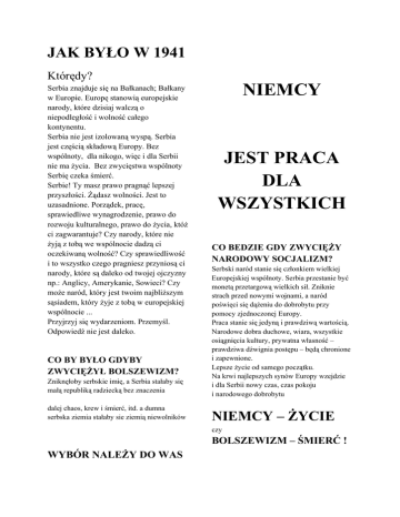 JAK BYŁO W 1941 Którędy? Serbia znajduje się na Bałkanach; Bałkany w Europie. Europę stanowią europejskie narody, które dzisiaj walczą o niepodległość i wolność całego kontynentu. Serbia nie jest izolowaną wyspą. Serbia jest częścią składową Europy. Bez wspólnoty, dla nikogo, więc i dla Serbii nie ma życia. Bez zwycięstwa wspólnoty Serbię czeka śmierć. Serbie! Ty masz prawo pragnąć lepszej przyszłości. Żądasz wolności. Jest to uzasadnione. Porządek, pracę, sprawiedliwe wynagrodzenie, prawo do rozwoju kulturalnego, prawo do życia, któż ci zagwarantuje? Czy narody, które nie żyją z tobą we wspólnocie dadzą ci oczekiwaną wolność? Czy sprawiedliwość i to wszystko czego pragniesz przyniosą ci narody, które są daleko od twojej ojczyzny np.: Anglicy, Amerykanie, Sowieci? Czy może naród, który jest twoim najbliższym sąsiadem, który żyje z tobą w europejskiej wspólnocie ... Przyjrzyj się wydarzeniom. Przemyśl. Odpowiedź nie jest daleko. CO BY BYŁO GDYBY ZWYCIĘŻYŁ BOLSZEWIZM? Zniknęłoby serbskie imię, a Serbia stałaby się małą republiką radziecką bez znaczenia dalej chaos, krew i śmierć, itd. a dumna serbska ziemia stałaby sie ziemią niewolników NIEMCY JEST PRACA DLA WSZYSTKICH CO BEDZIE GDY ZWYCIĘŻY NARODOWY SOCJALIZM? Serbski naród stanie się członkiem wielkiej Europejskiej wspólnoty. Serbia przestanie być monetą przetargową wielkich sił. Zniknie strach przed nowymi wojnami, a naród poświęci się dążeniu do dobrobytu przy pomocy zjednoczonej Europy. Praca stanie się jedyną i prawdziwą wartością. Narodowe dobra duchowe, wiara, wszystkie osiągnięcia kultury, prywatna własność – prawdziwa dźwignia postępu – będą chronione i zapewnione. Lepsze życie od samego początku. Na krwi najlepszych synów Europy wzejdzie i dla Serbii nowy czas, czas pokoju i narodowego dobrobytu NIEMCY – ŻYCIE czy BOLSZEWIZM – ŚMIERĆ ! WYBÓR NALEŻY DO WAS
