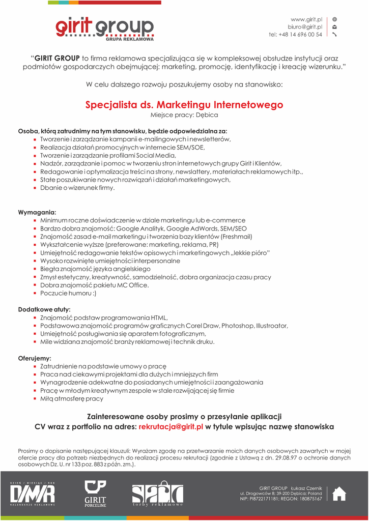 “GIRIT GROUP to firma reklamowa specjalizująca się w kompleksowej obsłudze instytucji oraz podmiotów gospodarczych obejmującej: marketing, promocję, identyfikację i kreację wizerunku.” W celu dalszego rozwoju poszukujemy osoby na stanowisko: Specjalista ds. Marketingu Internetowego Miejsce pracy: Dębica Osoba, którą zatrudnimy na tym stanowisku, będzie odpowiedzialna za: Tworzenie i zarządzanie kampanii e-mailingowych i newsletterów, Realizacja działań promocyjnych w internecie SEM/SOE, Tworzenie i zarządzanie profilami Social Media, Nadzór, zarządzanie i pomoc w tworzeniu stron internetowych grupy Girit i Klientów, Redagowanie i optymalizacja treści na strony, newslattery, materiałach reklamowych itp., Stałe poszukiwanie nowych rozwiązań i działań marketingowych, Dbanie o wizerunek firmy. Wymagania: Minimum roczne doświadczenie w dziale marketingu lub e-commerce Bardzo dobra znajomość: Google Analityk, Google AdWords, SEM/SEO Znajomość zasad e-mail marketingu i tworzenia bazy klientów (Freshmail) Wykształcenie wyższe (preferowane: marketing, reklama, PR) Umiejętność redagowanie tekstów opisowych i marketingowych „lekkie pióro” Wysoko rozwinięte umiejętności interpersonalne Biegła znajomość języka angielskiego Zmysł estetyczny, kreatywność, samodzielność, dobra organizacja czasu pracy Dobra znajomość pakietu MC Office. Poczucie humoru :) Dodatkowe atuty: Znajomość podstaw programowania HTML, Podstawowa znajomość programów graficznych Corel Draw, Photoshop, Illustroator, Umiejętność posługiwania się aparatem fotograficznym, Mile widziana znajomość branży reklamowej i technik druku. Oferujemy: Zatrudnienie na podstawie umowy o pracę Praca nad ciekawymi projektami dla dużych i mniejszych firm Wynagrodzenie adekwatne do posiadanych umiejętności i zaangażowania Pracę w młodym kreatywnym zespole w stale rozwijającej się firmie Miłą atmosferę pracy Zainteresowane osoby prosimy o przesyłanie aplikacji CV wraz z portfolio na adres: [email protected] w tytule wpisując nazwę stanowiska Prosimy o dopisanie następującej klauzuli: Wyrażam zgodę na przetwarzanie moich danych osobowych zawartych w mojej ofercie pracy dla potrzeb niezbędnych do realizacji procesu rekrutacji (zgodnie z Ustawą z dn. 29.08.97 o ochronie danych osobowych Dz. U. nr 133 poz. 883 z późn. zm.).