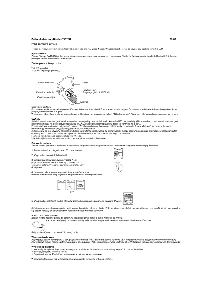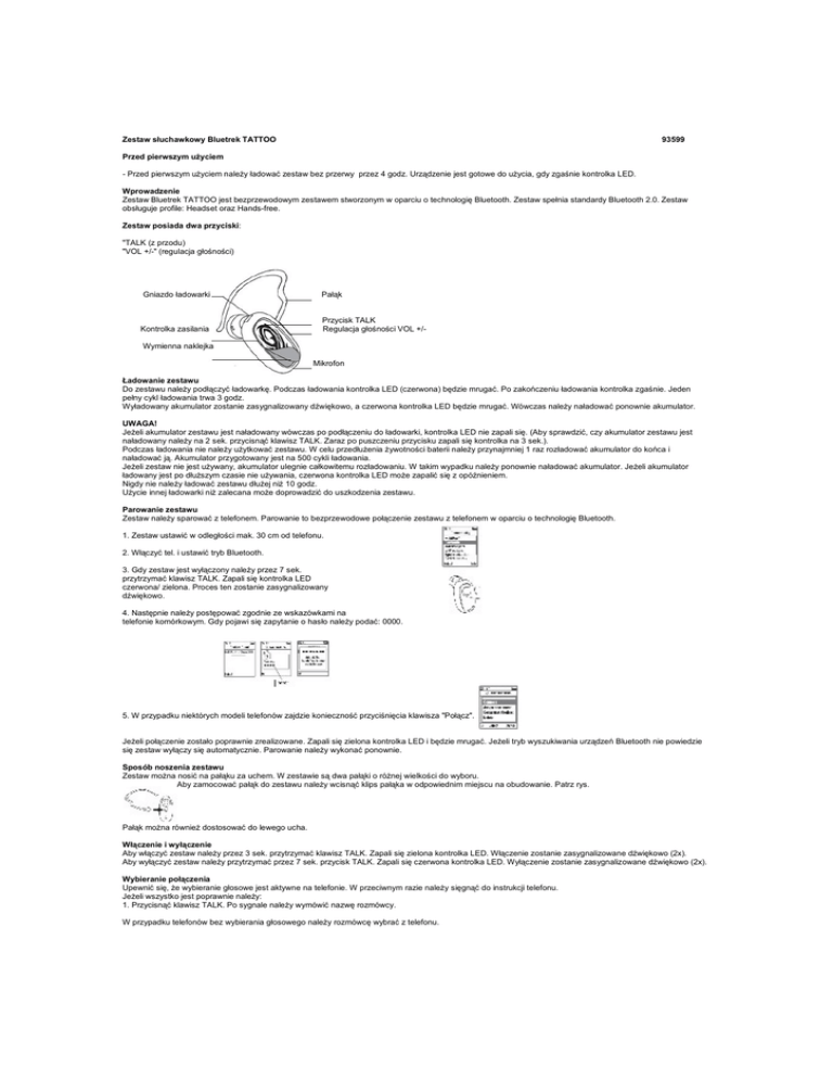 Zestaw słuchawkowy Bluetrek TATTOO 93599 Przed pierwszym uŜyciem - Przed pierwszym uŜyciem naleŜy ładować zestaw bez przerwy przez 4 godz. Urządzenie jest gotowe do uŜycia, gdy zgaśnie kontrolka LED. Wprowadzenie Zestaw Bluetrek TATTOO jest bezprzewodowym zestawem stworzonym w oparciu o technologię Bluetooth. Zestaw spełnia standardy Bluetooth 2.0. Zestaw obsługuje profile: Headset oraz Hands-free. Zestaw posiada dwa przyciski: "TALK (z przodu) "VOL +/-" (regulacja głośności) Gniazdo ładowarki Kontrolka zasilania Pałąk Przycisk TALK Regulacja głośności VOL +/- Wymienna naklejka Mikrofon Ładowanie zestawu Do zestawu naleŜy podłączyć ładowarkę. Podczas ładowania kontrolka LED (czerwona) będzie mrugać. Po zakończeniu ładowania kontrolka zgaśnie. Jeden pełny cykl ładowania trwa 3 godz. Wyładowany akumulator zostanie zasygnalizowany dźwiękowo, a czerwona kontrolka LED będzie mrugać. Wówczas naleŜy naładować ponownie akumulator. UWAGA! JeŜeli akumulator zestawu jest naładowany wówczas po podłączeniu do ładowarki, kontrolka LED nie zapali się. (Aby sprawdzić, czy akumulator zestawu jest naładowany naleŜy na 2 sek. przycisnąć klawisz TALK. Zaraz po puszczeniu przycisku zapali się kontrolka na 3 sek.). Podczas ładowania nie naleŜy uŜytkować zestawu. W celu przedłuŜenia Ŝywotności baterii naleŜy przynajmniej 1 raz rozładować akumulator do końca i naładować ją. Akumulator przygotowany jest na 500 cykli ładowania. JeŜeli zestaw nie jest uŜywany, akumulator ulegnie całkowitemu rozładowaniu. W takim wypadku naleŜy ponownie naładować akumulator. JeŜeli akumulator ładowany jest po dłuŜszym czasie nie uŜywania, czerwona kontrolka LED moŜe zapalić się z opóźnieniem. Nigdy nie naleŜy ładować zestawu dłuŜej niŜ 10 godz. UŜycie innej ładowarki niŜ zalecana moŜe doprowadzić do uszkodzenia zestawu. Parowanie zestawu Zestaw naleŜy sparować z telefonem. Parowanie to bezprzewodowe połączenie zestawu z telefonem w oparciu o technologię Bluetooth. 1. Zestaw ustawić w odległości mak. 30 cm od telefonu. 2. Włączyć tel. i ustawić tryb Bluetooth. 3. Gdy zestaw jest wyłączony naleŜy przez 7 sek. przytrzymać klawisz TALK. Zapali się kontrolka LED czerwona/ zielona. Proces ten zostanie zasygnalizowany dźwiękowo. 4. Następnie naleŜy postępować zgodnie ze wskazówkami na telefonie komórkowym. Gdy pojawi się zapytanie o hasło naleŜy podać: 0000. 5. W przypadku niektórych modeli telefonów zajdzie konieczność przyciśnięcia klawisza "Połącz". JeŜeli połączenie zostało poprawnie zrealizowane. Zapali się zielona kontrolka LED i będzie mrugać. JeŜeli tryb wyszukiwania urządzeń Bluetooth nie powiedzie się zestaw wyłączy się automatycznie. Parowanie naleŜy wykonać ponownie. Sposób noszenia zestawu Zestaw moŜna nosić na pałąku za uchem. W zestawie są dwa pałąki o róŜnej wielkości do wyboru. Aby zamocować pałąk do zestawu naleŜy wcisnąć klips pałąka w odpowiednim miejscu na obudowanie. Patrz rys. Pałąk moŜna równieŜ dostosować do lewego ucha. Włączenie i wyłączenie Aby włączyć zestaw naleŜy przez 3 sek. przytrzymać klawisz TALK. Zapali się zielona kontrolka LED. Włączenie zostanie zasygnalizowane dźwiękowo (2x). Aby wyłączyć zestaw naleŜy przytrzymać przez 7 sek. przycisk TALK. Zapali się czerwona kontrolka LED. Wyłączenie zostanie zasygnalizowane dźwiękowo (2x). Wybieranie połączenia Upewnić się, Ŝe wybieranie głosowe jest aktywne na telefonie. W przeciwnym razie naleŜy sięgnąć do instrukcji telefonu. JeŜeli wszystko jest poprawnie naleŜy: 1. Przycisnąć klawisz TALK. Po sygnale naleŜy wymówić nazwę rozmówcy. W przypadku telefonów bez wybierania głosowego naleŜy rozmówcę wybrać z telefonu. Odbieranie połączenia Aby odebrać połączenie naleŜy przycisnąć klawisz TALK. Kończenie połączenia Aby zakończyć połączenie naleŜy przycisnąć klawisz TALK. Ustawienie głośności Aby ustawić głośność naleŜy uŜyć przycisku VOL +/-. Wyłączenie mikrofonu Aby wyłączyć mikrofon podczas prowadzenia rozmowy naleŜy przycisnąć klawisz VOL +/- przez 2 sek. Wyłączenie dźwięku będzie sygnalizowane powtarzającym się dźwiękiem. Włączenie mikrofonu Aby włączyć mikrofon naleŜy krótko przycisnąć klawisz VOL+. Przekierowanie rozmowy z zestawu na telefon Aby przekazać rozmowę z zestawu na telefon naleŜy przycisnąć klawisz TALK przez 2 sek. (Obsługiwane przez profil Heands Free). Przekierowanie rozmowy z telefonu na zestaw Aby przekazać rozmowę z telefonu na zestaw naleŜy 1x przycisnąć klawisz TALK. Nakładki ERGOBUD W zestawie znajdują się 3 nakładki ERGOBUD w róŜnych wielkościach, S, M, L. Nakładkę na leŜy dopasować do własnego ucha, tak by zapewnić maks. komfort podczas prowadzenia rozmów. Nakładki naleŜy delikatnie nałoŜyć na słuchawkę. UwaŜać aby nie uszkodzić nakładki. Dodatkowo w zestawie znajdują się kolorowe naklejki na obudowę zestawu. Do dyspozycji jest kilka wersji kolorystycznych. Naklejki są samoprzylepne. Nakładać ostroŜnie, aby nie było zagięć ani pęcherzy. Połączenie oczekujące JeŜeli podczas prowadzenia rozmowy, nadejdzie połączenie moŜna przytrzymać klawisz TALK przez 3 sek. i odebrać drugie połączenie, nie przerywając poprzedniego. Aby przeskakiwać między poszczególnymi rozmowami naleŜy przycisnąć klawisz TALK. Aby zakończyć jedno z połączeń naleŜy przycisnąć krótko klawisz TALK. JeŜeli powyŜsza funkcja nie będzie dostępna w telefonie, zawsze moŜna odebrać połączenie klawiszem na telefonie. Funkcje obsługiwane tylko przez niektóre modele telefonów Odrzucenie połączenia Aby odrzucić połączenie naleŜy przycisnąć klawisz TALK przez 2 sek. Powtórzenie wybierania ostatniego numeru Aby ponownie wybrać ostatni numer naleŜy przez 2 sek. przycisnąć klawisz TALK. W przypadku błędów W pr