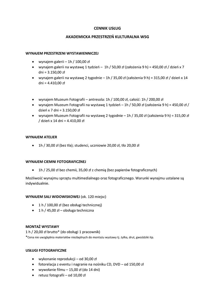 CENNIK USŁUG AKADEMICKA PRZESTRZEŃ KULTURALNA WSG WYNAJEM PRZESTRZENI WYSTAWIENNICZEJ wynajem galerii – 1h / 100,00 zł wynajem galerii na wystawę 1 tydzień – 1h / 50,00 zł (założenia 9 h) = 450,00 zł / dzień x 7 dni = 3.150,00 zł wynajem galerii na wystawę 2 tygodnie – 1h / 35,00 zł (założenia 9 h) = 315,00 zł / dzień x 14 dni = 4.410,00 zł wynajem Muzeum Fotografii – antresola: 1h / 100,00 zł, całość: 1h / 200,00 zł wynajem Muzeum Fotografii na wystawę 1 tydzień – 1h / 50,00 zł (założenia 9 h) = 450,00 zł / dzień x 7 dni = 3.150,00 zł wynajem Muzeum Fotografii na wystawę 2 tygodnie – 1h / 35,00 zł (założenia 9 h) = 315,00 zł / dzień x 14 dni = 4.410,00 zł WYNAJEM ATELIER 1h / 30,00 zł (bez tła); studenci, uczniowie 20,00 zł, tło 20,00 zł WYNAJEM CIEMNI FOTOGRAFICZNEJ 1h / 25,00 zł bez chemii, 35,00 zł z chemią (bez papierów fotograficznych) Możliwość wynajmu sprzętu multimedialnego oraz fotograficznego. Warunki wynajmu ustalane są indywidualnie. WYNAJEM SALI WIDOWISKOWEJ (ok. 120 miejsc) 1 h / 100,00 zł (bez obsługi technicznej) 1 h / 45,00 zł – obsługa techniczna MONTAŻ WYSTAWY 1 h / 20,00 zł brutto* (do obsługi 1 pracownik) *Cena nie uwzględnia materiałów niezbędnych do montażu wystawy tj. żyłka, drut, gwoździki itp. USŁUGI FOTOGRAFICZNE wykonanie reprodukcji – od 30,00 zł fotorelacja z eventu i nagranie na nośniku CD, DVD – od 150,00 zł wywołanie filmu – 15,00 zł (do 14 dni) retusz fotografii – od 10,00 zł Wykonanie zdjęcia: portret – 30,00 zł zdjęcie grupowe – 40,00 zł zdjęcie plenerowe – 30,00 zł polaroid – 15,00 zł sesja rodzinna (4 ujęcia) – 60,00 zł STUDIO NAGRAŃ mix utworów – 100,00-180,00 zł (wycena indywidualna w zależności od ilości ścieżek) mastering utworów – 100,00 zł / utwór mix / mastering utworów – 150,00-250,00 zł / utwór (wycena indywidualna w zależności od ilości ścieżek) nagrania wokalne / instrumentalne – 1h / 40,00-50,00 zł jingle radiowe (mastering) – 50,00-100,00 zł* jingle radiowe (z profesjonalnym lektorem)* udźwiękowienie stron www i reklam TV* pozostałe multimedia (w zależności od długości materiału oraz ilości ścieżek)* *Cena do ustalenia indywidualnie USŁUGI POLIGRAFICZNE zaproszenie – format DL, gruby papier, jednostronne – 0,33 zł katalog – format A4 łamany do A5 – 1 kartka, druk dwustronny – 2,00 zł plakat A3 – papier zwykły, druk jednostronny – 1,40 zł poster 50x70 – 35,00 zł poster 100x70 – 70,00 zł Koszty projektowania: baner na stronę internetową – 100,00 zł plakat + zaproszenie – 450,00 zł katalog – 500,00 zł USŁUGI CATERINGOWE (w ramach eventu w APK) Opcja na 40 osób: kawa, herbata, śmietanka, cukier – łącznie: 6,00 zł / os. (standard: naczynia jednorazowe) kawa, herbata, śmietanka, cukier, patera ciastek - łącznie: 9,00 zł / os. (standard: naczynia jednorazowe) napoje zimne do wyboru (standard: naczynia jednorazowe): woda mineralna – łącznie: 2,00 zł / os. soki – łącznie: 4,00 zł / os. Wypożyczenie sprzętu gastronomicznego filiżanki ze spodkiem – 0,60 zł / 1 szt. łyżeczki – 0,35 zł brutto / 1 szt. szklanki – 0,30 zł / 1 szt. kieliszki do wina, szampana – 0,30 zł / 1 szt. patery – 2,00 zł / 1 szt. pokrowce na krzesła – 6,00 zł / 1 szt. obsługa cateringowa: 1h / 20,00 zł (obsługuje 1 osoba) Uwaga: Istnieje możliwość przygotowania indywidualnej oferty po określeniu zakresu Wypożyczamy również inny sprzęt gastronomiczny (warniki, talerze, bemary itp.). Ceny wypożyczenia ustalane są indywidualne z klientem. Ceny nie uwzględniają transportu, w przypadku wypożyczenia sprzętu gastronomicznego powyżej 40 osób – cena za transport wynosi 50,00 zł. TRANSPORT wyłącznie na terenie Polski – 1,80 zł / 1 km Uwaga: Ubezpieczenie prac staraniem i na koszt wystawcy / klienta zabezpieczenie prac do transportu do uzgodnienia w zależności od ilości, wielkości i techniki zabezpieczenia prac Uwaga! Wszystkie ceny podane w cenniku są kwotami brutto.