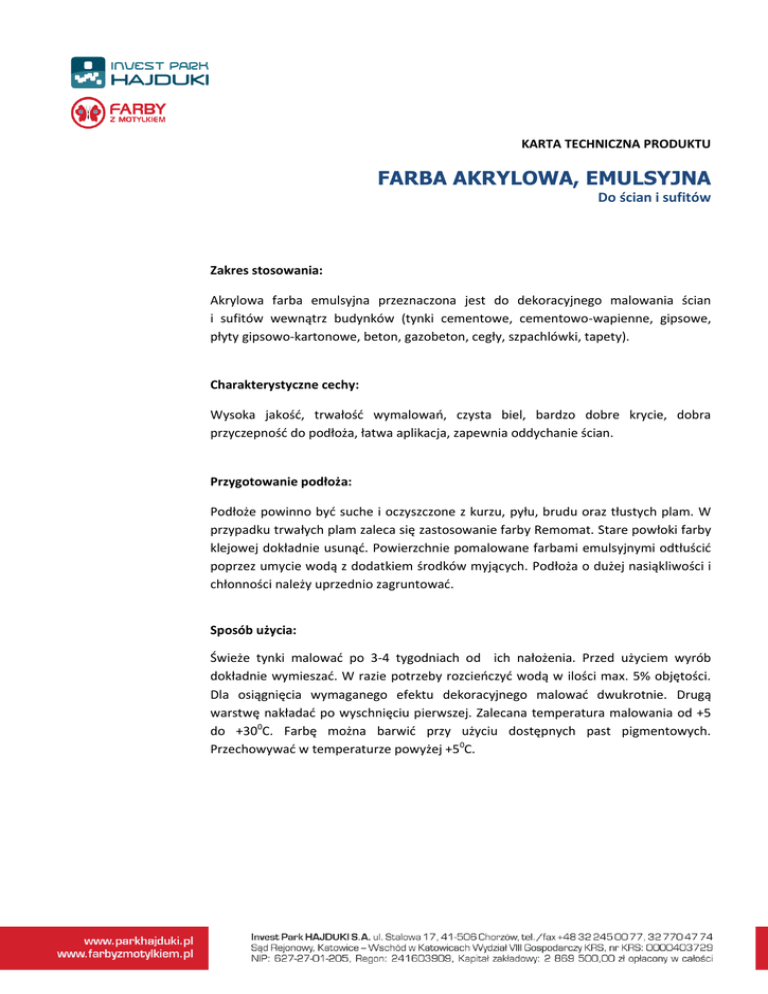 KARTA TECHNICZNA PRODUKTU FARBA AKRYLOWA, EMULSYJNA Do ścian i sufitów Zakres stosowania: Akrylowa farba emulsyjna przeznaczona jest do dekoracyjnego malowania ścian i sufitów wewnątrz budynków (tynki cementowe, cementowo-wapienne, gipsowe, płyty gipsowo-kartonowe, beton, gazobeton, cegły, szpachlówki, tapety). Charakterystyczne cechy: Wysoka jakość, trwałość wymalowań, czysta biel, bardzo dobre krycie, dobra przyczepność do podłoża, łatwa aplikacja, zapewnia oddychanie ścian. Przygotowanie podłoża: Podłoże powinno być suche i oczyszczone z kurzu, pyłu, brudu oraz tłustych plam. W przypadku trwałych plam zaleca się zastosowanie farby Remomat. Stare powłoki farby klejowej dokładnie usunąć. Powierzchnie pomalowane farbami emulsyjnymi odtłuścić poprzez umycie wodą z dodatkiem środków myjących. Podłoża o dużej nasiąkliwości i chłonności należy uprzednio zagruntować. Sposób użycia: Świeże tynki malować po 3-4 tygodniach od ich nałożenia. Przed użyciem wyrób dokładnie wymieszać. W razie potrzeby rozcieńczyć wodą w ilości max. 5% objętości. Dla osiągnięcia wymaganego efektu dekoracyjnego malować dwukrotnie. Drugą warstwę nakładać po wyschnięciu pierwszej. Zalecana temperatura malowania od +5 do +300C. Farbę można barwić przy użyciu dostępnych past pigmentowych. Przechowywać w temperaturze powyżej +50C. Parametry techniczne: Konsystencja ciecz Zapach charakterystyczny Gęstość 1,40 - 1,60 g/cm3 Wartość PH 8,7 Rozcieńczalnik woda Czyszczenie narzędzi wodą Wydajność do 12,5 m2/litr Czas schnięcia 2h Temperatura składowania 0ºC - 30ºC Temperatura stosowania 5ºC - 30ºC Sposób nanoszenia Pędzel, wałek, natrysk Zalecana ilość warstw 2 Nałożenie kolejne warstwy po 2h Okres gwarancji 24 miesiące od daty produkcji Wskazówki BHP i przeciwpożarowe: Produkt zastosowany zgodnie z przeznaczeniem nie stwarza zagrożenia dla zdrowia i środowiska. Nie jest sklasyfikowany jako niebezpieczny w myśl obowiązujących przepisów. Chronić przed dziećmi. Pomieszczenia po wymalowaniu wietrzyć do zaniku charakterystycznego zapachu. W razie połknięcia niezwłocznie zasięgnąć porady lekarza – pokazać opakowanie lub etykietę.