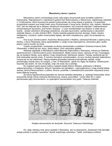 Mieszkańcy dworu i goście Mieszkańcy dworu moniackiego przez całą wojnę utrzymywali żywe kontakty rodzinne i towarzyskie. Najczęstszymi i najmilszymi gośćmi byli Świerczewscy z Mazanowa, oddalonego zaledwie o 12 kilometrów, które bryczką lub saniami pokonywało się mniej więcej w godzinę. Z Łopiennika przyjeżdżał czasami wuj mojej matki Jerzy Kochanowski z żoną Ireną i dziećmi: Izią, Jasiem i Markiem. Izia i Jaś nie włączali się w zabawy młodszych krewniaków, byli znacznie dojrzalsi i zaabsorbowani poważniejszymi sprawami, pod koniec okupacji - o czym dowiedziałam się dopiero w wiele lat po wojnie - zostali członkami zbrojnego podziemia, ona jako łączniczka i sanitariuszka w akowskim oddziale Zapory, on jako żołnierz BCh. Chyba rzadziej pojawiał się brat Jerzego, Adam, bardzo inteligentny, oczytany i pełen towarzyskiej ogłady, ale dość nieapetyczny, gdyż nie przepadał za myciem. Inny kuzyn Zembrzuskich, Kazimierz Boduszyński z Radlina, odwiedzał Moniaki z piękną żoną Hanką, z domu Rojowską, którą zapamiętałam z uwagi na jej nieprzyjemny, drewniany głos i jeden jedyny czarny loczek na czole. Często przyjeżdżała i zostawała na dłużej zamieszkała w pobliskim Godowie krewna Zofia Olszewska, a także jej syn Jerzy, dobry lekarz, choć nieznośny gaduła. Wakacje spędzała w Moniakach ciotka Marynka Dąbrowska z Warszawy, wdowa po Stefanie, spokrewnionym z Zembrzuskimi przez Gosiewskich. Miała czworo dzieci, starszą od nas i trzymającą się na dystans Hankę, syna Jędrka i moje rówieśniczki, bliźniaczki Jadzię i Teresę, podobnie jak ich brat niezwykłej wprost urody. Z rozmów dorosłych wnioskowałam, że są w trudnej sytuacji materialnej i muszą się na wsi odkarmiać. Naszą wiejską gromadkę irytował przemądrzały Jędrek, wciąż porównujący każdą rzecz do czegoś „u nas, w Warszawie”, gdzie my nigdy nie byliśmy. Dziewczynki trzymały się razem, do nas nie lgnęły, więc nie wryły się w pamięć. Do częstych gości spoza rodziny należeli ksiądz Marcin Ślósarz, proboszcz z Bobów, weterynarzostwo z Urzędowa, których nazwiska nie pamiętam, i zaprzyjaźniona z moją zmarłą babką wdowa Janina Pleszczyńska z Lublina, śliczna, przemiła, z niewiadomych powodów nazywana przez dzieci Babcią Grypcią. Ze sporą regularnością pojawiała we dworze lubelska dentystka, p. Jadwiga Dziewulska, która przywoziła swoją nożną maszynę dentystyczną, zwaną „pszczółką”, i przez kilka dni z rzędu plombowała zęby domownikom, co upamiętnił rysuneczkiem inny gość, Tadeusz Zieliński. Kolejka domowników do dentystki. Rysunek Tadeusza Zielińskiego On i jego młodszy brat Jerzy wpadali z Warszawy, też na dożywienie. Zostawiali miłe pamiątki swego pobytu w postaci rysunków i laurek wspólnego autorstwa. Tadek, późniejszy profesor warszawskiej ASP, tworzył szatę graficzną, Jurek pisał zabawne okolicznościowe wierszyki. Chyba raz odwiedził Moniaki ich najstarszy brat Antoni z żoną i raz siostra Barbara, późniejsza karmelitanka bosa. 27 stycznia 1941 roku tak o tych wizytach pisze Maria z Zielińskich Lutosławska do syna Zbigniewa: „Basia pojechała do Moniak i jak to czyni cała jej rodzina, tam utknęła, wszyscy oni tak dobrze się w Moniakach czują”. Pamiątkę o wiele większej wartości artystycznej pozostawiła po sobie Maja Berezowska, która ukrywała się przed Niemcami w 1941 roku w Mazanowie i w Moniakach. Wdzięczna za gościnę namalowała akwarelami 10 portrecików dziedziczek i ich dzieci. W lecie 1942 roku ukrywali się też u nas państwo Ossowscy (?), jak mówiono po wojnie, komuniści. Dość długo odpoczywał i odżywiał się na wsi jezuita, ojciec Anderson, współpracownik mojego ojca z RGO, człowiek tryskający humorem i chętnie włączający się w nasze szalone zabawy. On to latem 1942 roku przygotował Krzyśka i mnie do pierwszej komunii, do której przystąpiliśmy w kościele parafialnym w Bobach z grupą dzieci wiejskich, wyróżnieni tylko tym, że siedzieliśmy w pierwszej ławce, ja w kusiutkiej, przerobionej z czegoś sukience, Krzysiek w krótkich spodenkach. Pamiętam również przelotną wizytę zaprzyjaźnionej z ciotką Olszowską ks. Marii Puzyniny, bo wydała mi się prześliczna w pelerynce z białej angory. Z jej trochę ode mnie młodszym synem Józiem w ogóle nie chcieliśmy się bawić. Do bardzo młodego i towarzyskiego rządcy, Juranda Plucińskiego, zjeżdżało liczne towarzystwo: jego siostra Nina, z Wałowic Dzita (Teresa) Hempel, jej bratowa Ilona, wdowa po poległym w 1939 roku Zdzisławie, oraz rządca, Michał Rudowski, za którego później wyszła za mąż. W czasie tych wizyt wciąż mówiono o siostrze Dzity, p. Halinie Czarnockiej, wywiezionej przez bolszewików z majątku na Kresach do Kazachstanu, gdzie z wycieńczenia zmarł jej maleńki synek. Przyjeżdżała też czasem do Moniak babcia Anielcia Dąbrowska i czytywała nam na głos „Małego lorda”. Chyba tylko ze słyszenia i ze zdjęć znałam wielką przyjaciółkę sióstr Zembrzuskich, Halkę Luchtównę, wielokrotnie w Moniakach wspominaną, która jeszcze przed wojną wyszła za Niemca, a w czasie wojny zmarła po porodzie, bo straciła siły i chęć do życia. Lata, upływające w Moniakach w kręgu wymienionych osób, nie rysują mi się w pamięci wyraziście, stanowią jeden ciąg dni, spędzanych na zabawach i nauce, psotach, różnych pracach, do których w przeciwieństwie do Krzyśka ja się garnęłam, i na jedzeniu, które nigdy żadnemu z nas, łakomczuchów, nie było obojętne. Tylko pewne zdarzenia nie wywietrzały z głowy, ale dzisiaj z trudnością umieszczam je w czasie, więc tylko po kolei wyliczam, te ważne obok całkiem błahych. Zaraz po przyjeździe z Lublina w grudniu 1939 roku musieliśmy wyczuwać w Moniakach atmosferę przygnębienia, wywołanego okupacją, co po swojemu złośliwie wykorzystywaliśmy. 