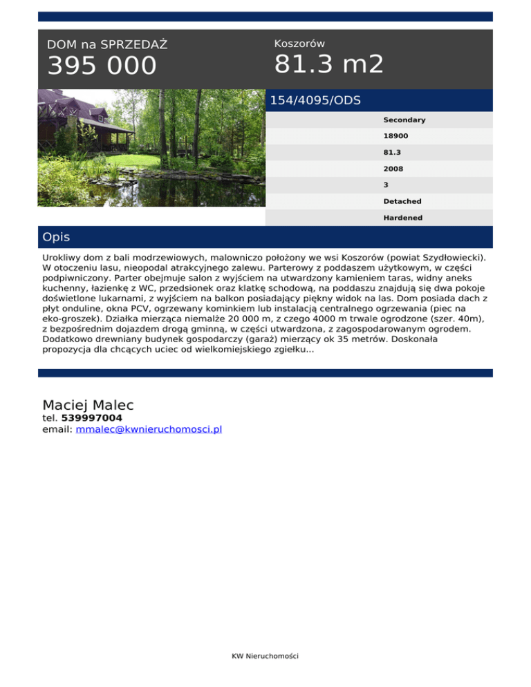 DOM na SPRZEDAŻ 395 000 Koszorów 81.3 m2 154/4095/ODS Secondary 18900 81.3 2008 3 Detached Hardened Opis Urokliwy dom z bali modrzewiowych, malowniczo położony we wsi Koszorów (powiat Szydłowiecki). W otoczeniu lasu, nieopodal atrakcyjnego zalewu. Parterowy z poddaszem użytkowym, w części podpiwniczony. Parter obejmuje salon z wyjściem na utwardzony kamieniem taras, widny aneks kuchenny, łazienkę z WC, przedsionek oraz klatkę schodową, na poddaszu znajdują się dwa pokoje doświetlone lukarnami, z wyjściem na balkon posiadający piękny widok na las. Dom posiada dach z płyt onduline, okna PCV, ogrzewany kominkiem lub instalacją centralnego ogrzewania (piec na eko-groszek). Działka mierząca niemalże 20 000 m, z czego 4000 m trwale ogrodzone (szer. 40m), z bezpośrednim dojazdem drogą gminną, w części utwardzona, z zagospodarowanym ogrodem. Dodatkowo drewniany budynek gospodarczy (garaż) mierzący ok 35 metrów. Doskonała propozycja dla chcących uciec od wielkomiejskiego zgiełku... Maciej Malec tel. 539997004 email: [email protected] KW Nieruchomości Powered by TCPDF (www.tcpdf.org)