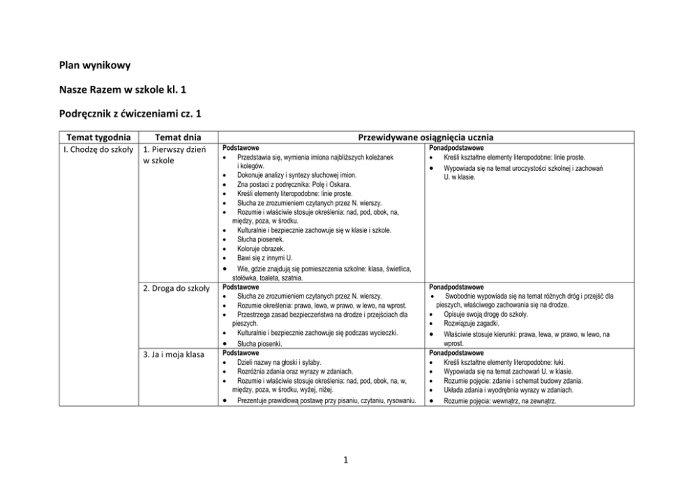 Plan wynikowy Nasze Razem w szkole kl. 1 Podręcznik z ćwiczeniami cz. 1 Temat tygodnia I. Chodzę do szkoły Temat dnia 1. Pierwszy dzień w szkole 2. Droga do szkoły 3. Ja i moja klasa Przewidywane osiągnięcia ucznia Podstawowe Przedstawia się, wymienia imiona najbliższych koleżanek i kolegów. Dokonuje analizy i syntezy słuchowej imion. Zna postaci z podręcznika: Polę i Oskara. Kreśli elementy literopodobne: linie proste. Słucha ze zrozumieniem czytanych przez N. wierszy. Rozumie i właściwie stosuje określenia: nad, pod, obok, na, między, poza, w środku. Kulturalnie i bezpiecznie zachowuje się w klasie i szkole. Słucha piosenek. Koloruje obrazek. Bawi się z innymi U. Wie, gdzie znajdują się pomieszczenia szkolne: klasa, świetlica, stołówka, toaleta, szatnia. Podstawowe Słucha ze zrozumieniem czytanych przez N. wierszy. Rozumie określenia: prawa, lewa, w prawo, w lewo, na wprost. Przestrzega zasad bezpieczeństwa na drodze i przejściach dla pieszych. Kulturalnie i bezpiecznie zachowuje się podczas wycieczki. Słucha piosenki. Podstawowe Dzieli nazwy na głoski i sylaby. Rozróżnia zdania oraz wyrazy w zdaniach. Rozumie i właściwie stosuje określenia: nad, pod, obok, na, w, między, poza, w środku, wyżej, niżej. Prezentuje prawidłową postawę przy pisaniu, czytaniu, rysowaniu. 1 Ponadpodstawowe Kreśli kształtne elementy literopodobne: linie proste. Wypowiada się na temat uroczystości szkolnej i zachowań U. w klasie. Ponadpodstawowe Swobodnie wypowiada się na temat różnych dróg i przejść dla pieszych, właściwego zachowania się na drodze. Opisuje swoją drogę do szkoły. Rozwiązuje zagadki. Właściwie stosuje kierunki: prawa, lewa, w prawo, w lewo, na wprost. Ponadpodstawowe Kreśli kształtne elementy literopodobne: łuki. Wypowiada się na temat zachowań U. w klasie. Rozumie pojęcie: zdanie i schemat budowy zdania. Układa zdania i wyodrębnia wyrazy w zdaniach. Rozumie pojęcia: wewnątrz, na zewnątrz. 4. Pracownicy szkoły 5. Przybory szkolne II. Moja szkoła 6. Moje prawa i obowiązki Podstawowe Czyta globalnie proste wyrazy. Przelicza elementy zbioru. Klasyfikuje przedmioty według podanej cechy lub określonego warunku. Wyodrębnia zbiory, grupując przedmioty według określonej cechy lub warunku. Nazywa osoby pracujące w szkole. Uczy się śpiewać piosenki. Koloruje obrazek. Podstawowe Kreśli elementy literopodobne: owale. Dzieli nazwy na głoski i sylaby. Słucha ze zrozumieniem czytanych przez N. opowiadań. Rozpoznaje i nazywa figury geometryczne. Określa cechy wielkościowe. Wyodrębnia zbiory, grupując przedmioty według określonej cechy lub warunku. Rozumie konieczność poszanowania sprzętu szkolnego i przyborów szkolnych. Prezentuje prawidłowy sposób noszenia tornistra. Śpiewa piosenki. Podstawowe Kreśli elementy literopodobne: ślimaki. Dzieli nazwy na głoski, sylaby. Układa zdania i pytania. Czyta globalnie. Odpowiada na pytania. Określa cechy wielkościowe. Zna i wypełnia obowiązki dyżurnego. Współdziała z innym U. i w grupie. Bawi się z innymi U. Respektuje przyjęte zasady w grach i zabawach. Bierze aktywny udział w grach i zabawach ruchowych i właściwie reaguje na polecenia. 2 Ponadpodstawowe Nazywa niektóre cechy figur geometrycznych. Szanuje pracę innych. Ponadpodstawowe Kreśli kształtne elementy literopodobne: owale. Rozwiązuje zagadki. Klasyfikuje przedmioty według jednej lub dwóch cech jakościowych. Porównuje przedmioty pod względem ich długości i szerokości. Wyodrębnia podzbiory, część wspólną. Ponadpodstawowe Kreśli kształtnie i estetycznie elementy literopodobne: ślimaki. Wypowiada się na temat zachowań U. w szkole i w klasie. Rozwiązuje zagadki. Prawidłowo i w przemyślany sposób rozmieszcza elementy na rysunku. 7. Jak zachowujemy się w szkole i poza nią 8. Szkoła – ciekawe miejsce 9. Komputer – jego przydatność Podstawowe Układa zdania i pytania. Słucha ze zrozumieniem czytanych przez N. informacji. Wyodrębnia zbiory. Wyodrębnia zbiory, grupując przedmioty według określonej cechy. Wycina wzdłuż linii i skleja samochód policyjny. Śpiewa piosenkę. Współdziała z innym U. i w grupie. Bawi się z innymi U. Respektuje przyjęte zasady w grach i zabawach. Bierze aktywny udział w grach i zabawach ruchowych i właściwie reaguje na polecenia. Podstawowe Kreśli elementy literopodobne: faliste, łuki. Dzieli nazwy na sylaby. Układa zdania i pytania. Czyta globalnie. Słucha ze zrozumieniem czytanych przez N. opowiadań. Odpowiada na pytania. Wyodrębnia zbiory i podzbiory. Wyodrębnia zbiory, grupując przedmioty według określonej cechy lub warunku. Śpiewa piosenki. Współdziała z innym U. i w grupie. Bawi się z innymi U. Respektuje przyjęte zasady w grach i zabawach. Bierze aktywny udział w grach i zabawach ruchowych i właściwie reaguje na polecenia. Podstawowe Kreśli elementy literopodobne: pętelki. Układa zdania i pytania. Czyta globalnie. Słucha ze zrozumieniem czytanych przez N. wierszy. Odpowiada na pytania. Wyodrębnia zbiory i podzbiory. Współdziała z innym U. i w grupie. Bawi się z innymi U. Respektuje przyjęte zasady w grach i zabawach. Bierze aktywny udział w grach i zabawach ruchowych i właściwie reaguje na polecenia. 3 Ponadpodstawowe Wypowiada się na temat zachowań U. w szkole i w klasie. Ponadpodstawowe Kreśli kształtnie i estetycznie elementy literopodobne: faliste, łuki. Wypowiada się na temat zachowań U. w szkole i w klasie. Przelicza elementy w zbiorze w zakresie 10 i porównuje ich liczbę. Wyodrębnia część wspólną. Ponadpodstawowe Kreśli kształtnie i estetycznie elementy literopodobne: pętelki. Wyodrębnia część wspólną zbiorów. 10. Głowa – mój cudowny komputer III. Wspominamy wakacje 11. Wakacyjne przygody 12. Wakacyjne wspomnienia Podstawowe Kreśli elementy literopodobne: owale. Układa zdania i pytania. Przelicza elementy. Zna i nazywa zmysły. Prawidłowo rozm