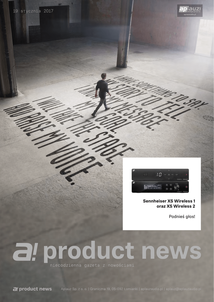 19 stycznia 2017 Sennheiser XS Wireless 1 oraz XS Wireless 2 Podnieś głos! Opierając się na dziedzictwie i doświadczeniu w tworzeniu systemów bezprzewodowych dla profesjonalnych i przyszłych artystów, firma Sennheiser opracowała dwie nowe linie mikrofonów i systemów bezprzewodowych. To produkty dla użytkowników, którzy pragną rozpocząć korzystanie z zalet łączności bezprzewodowej, jak i osób gotowych zrobić kolejny krok w tej dziedzinie. XS WIRELESS 1 został zaprojektowany dla początkujących i okazjonalnych użytkowników systemów bezprzewodowych, którzy cenią prostotę, szybką konfigurację oraz brak utrudnień podczas użytkowania. Dzięki intuicyjnej, bazującej na ikonach obsłudze i synchronizacji pracy za pomocą jednego dotknięcia, system XS WIRELESS 1 jest rozwiązaniem bezprzewodowym dostępnym w możliwie najprostszej postaci i działaniu. XS WIRELESS 2 przeznaczony jest dla użytkowników systemów bezprzewodowych, którzy potrzebują większej kontroli pracy i elastyczności w zastosowaniach. Ta ulepszona wersja oferuje metalową obudowę, gotową sprostać trudom tras koncertowych, odbiór sygnału w technologii różnicowej (True Diversity) oraz wyświetlacz LCD informujący o wielu funkcjach. XS WIRELESS 2 jest godnym następcą oryginalnej linii XS WIRELESS i posiada możliwość pełnego strojenia w szerokim zakresie pasma częstotliwości UHF. Obie linie XS WIRLESS doskonale sprawdzają się podczas pracy z dźwiękiem na żywo. Są one wyposażone w renomowane kapsuły mikrofonowe z serii evolution. W zestawach XSW1 znajdziemy kapsułę e825 lub będącą branżowym standardem dynamiczną kapsułę kardioidalną e835. XSW2 posiada kapsułę dynamiczną e835 lub pojemnościową e865, która pozwala uchwycić nawet najdrobniejsze detale występu. Nowy członek rodziny XSW - zestaw dla instrumentów dętych XSW 1-908 Brass Set wyposażony jest w nowoczesny mikrofon na gęsiej szyjce e908. XSW2-835/XSW2-865 XSW2-ME3 XSW2-ME2 XSW2-Cl1 Wszystkie zestawy XSW są kompatybilne ze sobą i niezwykle łatwe w użyciu. Seria XSW jest doskonałym połączeniem doświadczenia Sennheisera w dziedzinie dźwięku scenicznego z oczekiwaniami współczesnych klientów w zakresie bezproblemowej obsługi, a także nowoczesnego wyglądu. Jeśli jesteś wokalistą, instrumentalistą, prezenterem, moderatorem lub innego typu artystą estradowym, oczekujesz niezawodnej transmisji i doskonałego dźwięku na żywo. Produkty XS WIRELESS spełnią te wymagania. Jedyne, co musisz zrobić, to PODNIEŚĆ GŁOS. XSW1-825/XSW1-835 •Odbiór różnicowy sygnału z dwóch anten •Zintegrowane anteny •Automatyczne zarządzanie częstotliwościami transmisji i ich synchronizacja za pośrednictwem zdalnego kanału w celu zapewnienia szybkiej i łatwej konfiguracji •Przełączalne częstotliwości UHF w szerokim zakresie pasma transmisji •Do 10 kompatybilnych kanałów XSW1-ME3 Dostępne zestawy •Zestawy wokalowe: XSW1-825, XSW1-835 •Zestawy instrumentalne: XSW1-Cl1 (gitara i bas), XSW1-908 (instrumenty dęte) •Zestawy z mikrofonem nagłownym: XSW1-ME3 •Zestawy z mikrofonem typu lavalier: XSW1-ME2 Najważniejsze cechy serii XS WIRELESS 2 •Odbiornik różnicowy (true diversity) z metalową obudową •Zewnętrzne anteny •Automatyczne zarządzanie częstotliwościami transmisji i ich synchronizacja za pośrednictwem zdalnego kanału w celu zapewnienia szybkiej i łatwej konfiguracji •Możliwość strojenia w szerokim zakresie częstotliwości UHF •Dołączony zestaw do montażu w obudowach rack •Do 12 kompatybilnych kanałów XSW1-908 XSW1-ME2 Dostępne zestawy •Zestawy wokalowe: XSW2-835, XSW2-865 •Zestaw instrumentalny: XSW2-Cl1 •Zestaw z mikrofonem nagłownym: XSW2-ME3 •Zestaw z mikrofonem typu lavalier: XSW2-ME2 Więcej szczegółów: sennheiser.pl/xsw XSW1-Cl1 Firmy Aplauz oraz Sennheiser udostępniają niniejsze zdjęcia wyłącznie do publikacji prasowych. Jakiekolwiek inne użycie jest naruszeniem prawa. Przekazanie zdjęć osobom trzecim jest możliwe jedynie za zgodą firm Aplauz i Sennheiser. Najważniejsze cechy serii XS WIRELESS 1