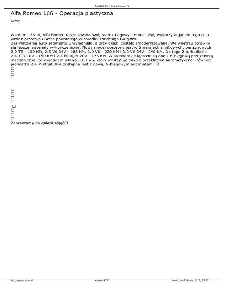 AutoRok.PL / DesignForum.PL Alfa Romeo 166 - Operacja plastyczna Autor: Wzorem 156-ki, Alfa Romeo restylizowała swój statek flagowy - model 166, wykorzystując do tego celu wzór z prototypu Brera powstałego w ośrodku Italdesign Giugiaro. Bez wątpienia auto segmentu E wyładniało, a przy okazji zostało zmodernizowane. We wnętrzu pojawiły się lepsze materiały wykończeniowe. Nowy model dostępny jest w 6 wersjach silnikowych; benzynowych 2.0 TS - 150 KM, 2.5 V6 24V - 188 KM, 3.0 V6 - 220 KM i 3.2 V6 24V - 240 KM. Do tego 2 turbodiesle 2.4 JTD 10V - 150 KM i 2.4 Multijet 20V - 175 KM. W standardzie łączone są one z 6-biegową przekładnią mechaniczną, za wyjątkiem silnika 3.0-l-V6, który występuje tylko z przekładnią automatyczną. Również jednostka 2.4 Multijet 20V dostępna jest z nową, 5-biegowym automatem. Zapraszamy do galerii zdjęć http://mas.auto.pl Kreator PDF Utworzono 2 March, 2017, 17:22