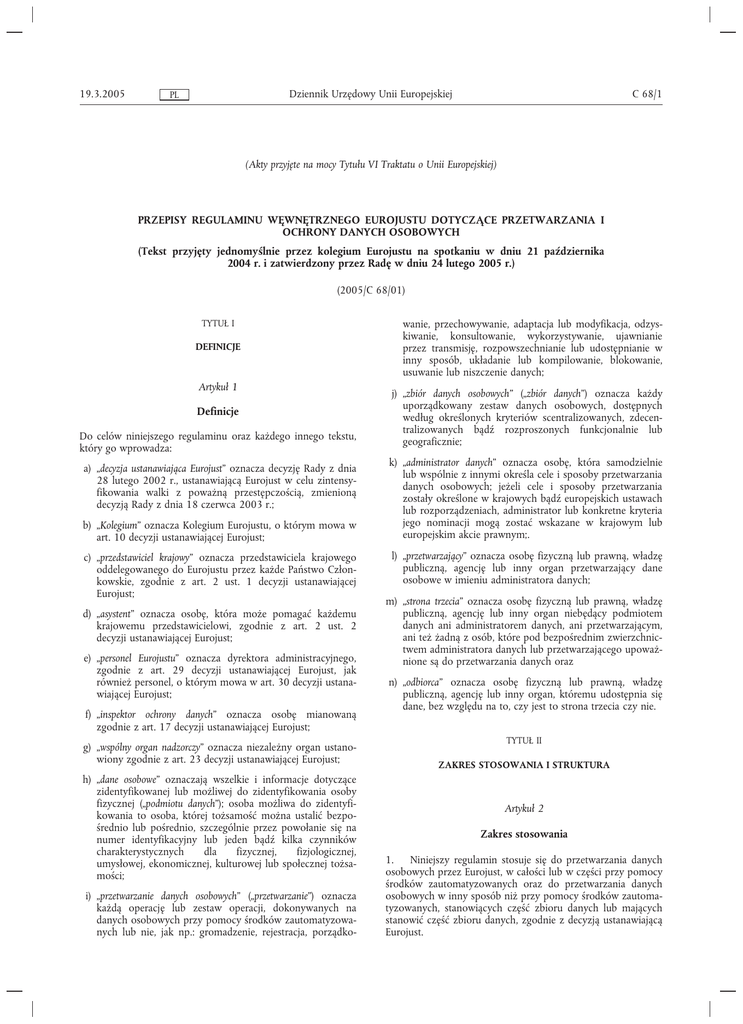 19.3.2005 Dziennik Urzędowy Unii Europejskiej PL C 68/1 (Akty przyjęte na mocy Tytułu VI Traktatu o Unii Europejskiej) PRZEPISY REGULAMINU WĘWNĘTRZNEGO EUROJUSTU DOTYCZĄCE PRZETWARZANIA I OCHRONY DANYCH OSOBOWYCH (Tekst przyjęty jednomyślnie przez kolegium Eurojustu na spotkaniu w dniu 21 października 2004 r. i zatwierdzony przez Radę w dniu 24 lutego 2005 r.) (2005/C 68/01) TYTUŁ I DEFINICJE Artykuł 1 Definicje Do celów niniejszego regulaminu oraz każdego innego tekstu, który go wprowadza: a) „decyzja ustanawiająca Eurojust” oznacza decyzję Rady z dnia 28 lutego 2002 r., ustanawiającą Eurojust w celu zintensyfikowania walki z poważną przestępczością, zmienioną decyzją Rady z dnia 18 czerwca 2003 r.; b) „Kolegium” oznacza Kolegium Eurojustu, o którym mowa w art. 10 decyzji ustanawiającej Eurojust; c) „przedstawiciel krajowy” oznacza przedstawiciela krajowego oddelegowanego do Eurojustu przez każde Państwo Członkowskie, zgodnie z art. 2 ust. 1 decyzji ustanawiającej Eurojust; d) „asystent” oznacza osobę, która może pomagać każdemu krajowemu przedstawicielowi, zgodnie z art. 2 ust. 2 decyzji ustanawiającej Eurojust; e) „personel Eurojustu” oznacza dyrektora administracyjnego, zgodnie z art. 29 decyzji ustanawiającej Eurojust, jak również personel, o którym mowa w art. 30 decyzji ustanawiającej Eurojust; f) „inspektor ochrony danych” oznacza osobę mianowaną zgodnie z art. 17 decyzji ustanawiającej Eurojust; g) „wspólny organ nadzorczy” oznacza niezależny organ ustanowiony zgodnie z art. 23 decyzji ustanawiającej Eurojust; h) „dane osobowe” oznaczają wszelkie i informacje dotyczące zidentyfikowanej lub możliwej do zidentyfikowania osoby fizycznej („podmiotu danych”); osoba możliwa do zidentyfikowania to osoba, której tożsamość można ustalić bezpośrednio lub pośrednio, szczególnie przez powołanie się na numer identyfikacyjny lub jeden bądź kilka czynników charakterystycznych dla fizycznej, fizjologicznej, umysłowej, ekonomicznej, kulturowej lub społecznej tożsamości; i) „przetwarzanie danych osobowych” („przetwarzanie”) oznacza każdą operację lub zestaw operacji, dokonywanych na danych osobowych przy pomocy środków zautomatyzowanych lub nie, jak np.: gromadzenie, rejestracja, porządko- wanie, przechowywanie, adaptacja lub modyfikacja, odzyskiwanie, konsultowanie, wykorzystywanie, ujawnianie przez transmisję, rozpowszechnianie lub udostępnianie w inny sposób, układanie lub kompilowanie, blokowanie, usuwanie lub niszczenie danych; j) „zbiór danych osobowych” („zbiór danych”) oznacza każdy uporządkowany zestaw danych osobowych, dostępnych według określonych kryteriów scentralizowanych, zdecentralizowanych bądź rozproszonych funkcjonalnie lub geograficznie; k) „administrator danych” oznacza osobę, która samodzielnie lub wspólnie z innymi określa cele i sposoby przetwarzania danych osobowych; jeżeli cele i sposoby przetwarzania zostały określone w krajowych bądź europejskich ustawach lub rozporządzeniach, administrator lub konkretne kryteria jego nominacji mogą zostać wskazane w krajowym lub europejskim akcie prawnym;. l) „przetwarzający” oznacza osobę fizyczną lub prawną, władzę publiczną, agencję lub inny organ przetwarzający dane osobowe w imieniu administratora danych; m) „strona trzecia” oznacza osobę fizyczną lub prawną, władzę publiczną, agencję lub inny organ niebędący podmiotem danych ani administratorem danych, ani przetwarzającym, ani też żadną z osób, które pod bezpośrednim zwierzchnictwem administratora danych lub przetwarzającego upoważnione są do przetwarzania danych oraz n) „odbiorca” oznacza osobę fizyczną lub prawną, władzę publiczną, agencję lub inny organ, któremu udostępnia się dane, bez względu na to, czy jest to strona trzecia czy nie. TYTUŁ II ZAKRES STOSOWANIA I STRUKTURA Artykuł 2 Zakres stosowania 1. Niniejszy regulamin stosuje się do przetwarzania danych osobowych przez Eurojust, w całości lub w części przy pomocy środków zautomatyzowanych oraz do przetwarzania danych osobowych w inny sposób niż przy pomocy środków zautomatyzowanych, stanowiących część zbioru danych lub mających stanowić część zbioru danych, zgodnie z decyzją ustanawiającą Eurojust. C 68/2 Dziennik Urzędowy Unii Europejskiej PL 2. Regulamin ten stosuje się do wszystkich informacji gromadzonych i następnie przetwarzanych przez Eurojust, to jest do informacji zgromadzonych lub otrzymanych przez Eurojust i znajdujących się w jego posiadaniu, dotyczących kwestii odnoszących się do polityk, działań i decyzji wchodzących w zakres kompetencji Eurojustu. 19.3.2005 cel przetwarzania i fakt, że wysiłek włożony w te działania mieści się w granicach rozsądku. Artykuł 6 3. Regulamin nie stosuje się do informacji, które zostały przekazane krajowemu przedstawicielowi Eurojustu wyłącznie w kontekście jego kompetencji sądowych, zgodnie z art. 9 ust. 3 decyzji ustanawiającej Eurojust. Jakość danych Artykuł 3 1. Eurojust gwarantuje, że dane osobowe są poprawne, a w razie konieczności uaktualniane; należy podjąć wszelkie stosowne kroki, aby zapewnić usunięcie lub poprawienie błędnych lub niekompletnych danych, mając na uwadze cele, w jakich były one gromadzone i w jakich są w dalszym ciągu przetwarzane. Struktura 1. Wszelkie dane osobowe uważa się za dane związane z daną sprawą albo dane niezwiązane z daną sprawą. Dane osobowe uważa się za dane związane z daną sprawą, jeżeli wiążą się one z zadaniami operacyjnymi Eurojustu, zgodnie z art. 5-7 decyzji ustanawiającej Eurojust. 2. Dane osobowe przechowywane są w formie, która pozwala na identyfikację podmiotów danych, tylko tak długo jak jest to niezbędne do celów, w jakich dane te były gromadzone lub w jakich są one w dalszym ciągu przetwarzane, zgodnie z art. 5 ust. 2. 2