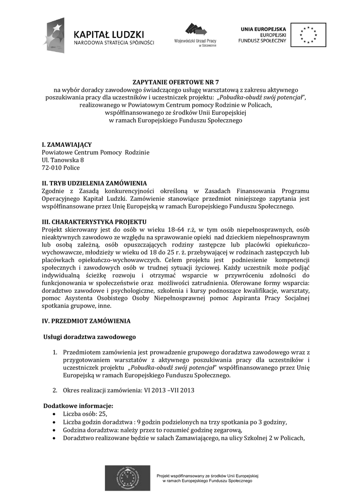 ZAPYTANIE OFERTOWE NR 7 na wybór doradcy zawodowego świadczącego usługę warsztatową z zakresu aktywnego poszukiwania pracy dla uczestników i uczestniczek projektu: „Pobudka-obudź swój potencjał”, realizowanego w Powiatowym Centrum pomocy Rodzinie w Policach, współfinansowanego ze środków Unii Europejskiej w ramach Europejskiego Funduszu Społecznego I. ZAMAWIAJĄCY Powiatowe Centrum Pomocy Rodzinie Ul. Tanowska 8 72-010 Police II. TRYB UDZIELENIA ZAMÓWIENIA Zgodnie z Zasadą konkurencyjności określoną w Zasadach Finansowania Programu Operacyjnego Kapitał Ludzki. Zamówienie stanowiące przedmiot niniejszego zapytania jest współfinansowane przez Unię Europejską w ramach Europejskiego Funduszu Społecznego. III. CHARAKTERYSTYKA PROJEKTU Projekt skierowany jest do osób w wieku 18-64 r.ż, w tym osób niepełnosprawnych, osób nieaktywnych zawodowo ze względu na sprawowanie opieki nad dzieckiem niepełnosprawnym lub osobą zależną, osób opuszczających rodziny zastępcze lub placówki opiekuńczowychowawcze, młodzieży w wieku od 18 do 25 r. ż. przebywającej w rodzinach zastępczych lub placówkach opiekuńczo-wychowawczych. Celem projektu jest podniesienie kompetencji społecznych i zawodowych osób w trudnej sytuacji życiowej. Każdy uczestnik może podjąć indywidualną ścieżkę rozwoju i otrzymać wsparcie w przywróceniu zdolności do funkcjonowania w społeczeństwie oraz możliwości zatrudnienia. Oferowane formy wsparcia: doradztwo zawodowe i psychologiczne, szkolenia i kursy podnoszące kwalifikacje, warsztaty, pomoc Asystenta Osobistego Osoby Niepełnosprawnej pomoc Aspiranta Pracy Socjalnej spotkania grupowe, inne. IV. PRZEDMIOT ZAMÓWIENIA Usługi doradztwa zawodowego 1. Przedmiotem zamówienia jest prowadzenie grupowego doradztwa zawodowego wraz z przygotowaniem warsztatów z aktywnego poszukiwania pracy dla uczestników i uczestniczek projektu „Pobudka-obudź swój potencjał” współfinansowanego przez Unię Europejską w ramach Europejskiego Funduszu Społecznego. 2. Okres realizacji zamówienia: VI 2013 –VII 2013 Dodatkowe informacje: Liczba osób: 25, Liczba godzin doradztwa : 9 godzin podzielonych na trzy spotkania po 3 godziny, Godzina doradztwa: należy przez to rozumieć godzinę zegarową, Doradztwo realizowane będzie w salach Zamawiającego, na ulicy Szkolnej 2 w Policach, Projekt współfinansowany ze środków Unii Europejskiej w ramach Europejskiego Funduszu Społecznego Przewiduje się przeprowadzeni warsztatów w dni powszednie w godzinach popołudniowych ok. 16.00 – 20.00 Oferent pokrywa koszty: dojazdu na miejsce przeprowadzenia doradztwa i warsztatów w tym materiałów szkoleniowych. VI. OPIS PRZEDMIOTU ZAPYTANIA Przedmiotem zapytania jest grupowe doradztwo zawodowe mające na celu zdiagnozowanie potencjału i predyspozycji zawodowych uczestników, wstępną analizę sytuacji zawodowej oraz pomoc przy wyborze dalszego kierunku kształcenia i poruszaniu się na rynku pracy. Zajęcia mają zwiększyć świadomość uczestników w zakresie możliwości aplikowania na określone stanowiska pracy. Warsztaty mają wskazywać praktyczne wskazówki z zakresu poszukiwania pracy, wskazywać obecne tendencje rynkowe jeżeli chodzi o możliwości podjęcia pracy uwzględniające specyfikę rynku pracy dla osób niepełnosprawnych. W wyniku warsztatów uczestnik powinien nabyć praktyczne umiejętności: 1) Sporządzenia odpowiednich dokumentów w celu przedstawienia pracodawcy, 2) Umiejętnego dostosowywania oferty pracy do swojego wykształcenia, możliwości psychoruchowych (osoby niepełnosprawne) i doświadczenia, 3) Potrafić wymienić instytucje zajmujące się wsparciem osób bezrobotnych i osób poszukujących zatrudnienia, 4) Potrafić wskazać źródła pozyskiwania informacji o ofertach pracy (nie tylko Internet). Oferent zobowiązuje się: prowadzić doradztwo zgodnie z zasadą równych szans, prowadzić dokumentację zgodnie z wymogami Zamawiającego (m.in. harmonogram spotkań, lista obecności ), prowadzić doradztwo w ustalonym terminie, uczestniczyć w co najmniej 1 spotkaniu z Personelem Projektu w terminach wyznaczonych przez Koordynatora Projektu, Zamawiający zagwarantuje salę na realizację doradztwa. VII. KRYTERIA OCENY O udzielenie zamówienia mogą ubiegać się Wykonawcy, którzy: 1. Posiadają uprawnienia do wykonywania określonej działalności lub czynności, jeżeli ustawy nakładają obowiązek posiadania takich uprawnień. 2. Znajdują się w sytuacji ekonomicznej, finansowej i organizacyjnej zapewniającej wykonanie zamówienia. 3. Posiadają tytuł doradcy zawodowego I stopnia lub doradcy zawodowego II stopnia 4. Doświadczenie w realizowaniu doradztwa w ramach EFS - tj. wykażą się przeprowadzeniem przynajmniej 1 usługi w zakresie doradztwa zawodowego dla osób niepełnosprawnych potwierdzone referencjami Przesłanie oferty w odpowiedzi na niniejsze zapytanie ofertowe jest jednoznaczne ze złożeniem oświadczenia, że Wykonawca spełnia powyższe kryteria. Kryterium wyboru oferty: Projekt współfinansowany ze środków Unii Europejskiej w ramach Europejskiego Funduszu Społecznego Przy ocenie i porównaniu ofert zastosowane będą następujące kryteria: 1. Cena przeprowadzenia 1 godziny doradztwa – waga 80% Sposób oceny ofert w tym kryterium: K1 = x 100 x 80% K1 – liczba punktów w kryterium „cena” 2. Doświadczenie zawodowe oferenta (osoby przeprowadzającej warsztaty) w realizacji podobnych zamówień; każda udokumentowana usługa wskazująca na takie doświadczenie, w postaci zaświadczenia, certyfikatu, referencji itp. ma wartość 1-go punktu – waga 20 % K2 = x 100 x 20% K2 – liczba punktów w kryterium „doświadczenie zawodowe oferenta” Cena przeprowadzenia 1 godziny doradztwa uwzględnia koszty: wynagrodzenie doradcy za przeprowadzenie warsztatów, przygotowanie wymaganej dokumentacji, materiały potrzebne do przeprowadzenia warsztatów. Dojazd doradcy we w