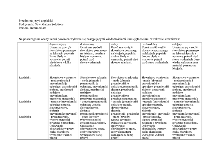 Przedmiot: język angielski Podręcznik: New Matura Solutions Poziom: Intermediate Na poszczególne oceny uczeń powinien wykazać się następującymi wiadomościami i umiejętnościami w zakresie słownictwa: Rozdział 1 Rozdział 2 Rozdział 3 dopuszczający Uczeń zna 30-49% słownictwa poznanego na lekcjach, popełnia liczne błędy w wymowie, potrafi użyć słowa w kilku zdaniach. dostateczny Uczeń zna 49-69% słownictwa poznanego na lekcjach, popełnia błędy w wymowie, potrafi użyć słowa w zdaniach. dobry Uczeń zna 70-85% słownictwa poznanego na lekcjach, popełnia drobne błędy w wymowie, potrafi użyć słowa w zdaniach. bardzo dobry Uczeń zna 86 – 98% słownictwa poznanego na lekcjach, popełnia drobne błędy w wymowie, potrafi użyć słowa w zdaniach. celujący Uczeń zna 99 – 100% słownictwa poznanego na lekcjach łącznie z wymową, potrafi użyć słowa w zdaniach. Jego wiedza wykracza poza materiał poznany na lekcjach. Słownictwo w zakresie: - moda (ubrania i przymiotniki je opisujące, przymiotniki złożone, przedrostki nadające przymiotnikom przeciwne znaczenie); - uczucia (przymiotniki opisujące uczucia, słowotwórstwo, złożenia przymiotnik+przyimek) - praca (zawody, typowe czynności związane z zawodami, Opisywanie obowiązków w pracy, cechy charakteru wymagane w danej pracy) Słownictwo w zakresie: - moda (ubrania i przymiotniki je opisujące, przymiotniki złożone, przedrostki nadające przymiotnikom przeciwne znaczenie); - uczucia (przymiotniki opisujące uczucia, słowotwórstwo, złożenia przymiotnik+przyimek) - praca (zawody, typowe czynności związane z zawodami, Opisywanie obowiązków w pracy, cechy charakteru wymagane w danej pracy) Słownictwo w zakresie: - moda (ubrania i przymiotniki je opisujące, przymiotniki złożone, przedrostki nadające przymiotnikom przeciwne znaczenie); - uczucia (przymiotniki opisujące uczucia, słowotwórstwo, złożenia przymiotnik+przyimek) - praca (zawody, typowe czynności związane z zawodami, Opisywanie obowiązków w pracy, cechy charakteru wymagane w danej pracy) Słownictwo w zakresie: - moda (ubrania i przymiotniki je opisujące, przymiotniki złożone, przedrostki nadające przymiotnikom przeciwne znaczenie); - uczucia (przymiotniki opisujące uczucia, słowotwórstwo, złożenia przymiotnik+przyimek) - praca (zawody, typowe czynności związane z zawodami, Opisywanie obowiązków w pracy, cechy charakteru wymagane w danej pracy) Słownictwo w zakresie: - moda (ubrania i przymiotniki je opisujące, przymiotniki złożone, przedrostki nadające przymiotnikom przeciwne znaczenie); - uczucia (przymiotniki opisujące uczucia, słowotwórstwo, złożenia przymiotnik+przyimek) - praca (zawody, typowe czynności związane z zawodami, Opisywanie obowiązków w pracy, cechy charakteru wymagane w danej pracy) Rozdział 4 Rozdział 5 Rozdział 6 Rozdział 7 Rozdział 8 - wyrażanie opinii, zgadzanie się i niezgadzanie się z kimś/z opinią, czasowniki złożone; - ciało człowieka (części ciała, urazy i zranienia, problemy zdrowotne, choroby i ich symptomy, typowe zwroty używane u lekarza) - homonimy i homofony - technologia i komputery; - przedrostki przed rzeczownikami; - czynności czasu wolnego (sugerowanie spędzania wolnego czasu i zgadzanie się na sugestie); - dom (rzeczowniki złożone opisujące wnętrze domu); - słowa powszechnie mylone przez uczniów (np. say i tell); - związki międzyludzkie (wyrażenia związane z uczuciami i z umawianiem się, związki online); - wyrażanie kolejności wydarzeń; – podróżowanie (środki transportu, rzeczowniki złożone, wyrażenia - wyrażanie opinii, zgadzanie się i niezgadzanie się z kimś/z opinią, czasowniki złożone; - ciało człowieka (części ciała, urazy i zranienia, problemy zdrowotne, choroby i ich symptomy, typowe zwroty używane u lekarza) - homonimy i homofony - technologia i komputery; - przedrostki przed rzeczownikami; - czynności czasu wolnego (sugerowanie spędzania wolnego czasu i zgadzanie się na sugestie); - dom (rzeczowniki złożone opisujące wnętrze domu); - słowa powszechnie mylone przez uczniów (np. say i tell); - związki międzyludzkie (wyrażenia związane z uczuciami i z umawianiem się, związki online); - wyrażanie kolejności wydarzeń; – podróżowanie (środki transportu, rzeczowniki złożone, wyrażenia - wyrażanie opinii, zgadzanie się i niezgadzanie się z kimś/z opinią, czasowniki złożone; - ciało człowieka (części ciała, urazy i zranienia, problemy zdrowotne, choroby i ich symptomy, typowe zwroty używane u lekarza) - homonimy i homofony - technologia i komputery; - przedrostki przed rzeczownikami; - czynności czasu wolnego (sugerowanie spędzania wolnego czasu i zgadzanie się na sugestie); - dom (rzeczowniki złożone opisujące wnętrze domu); - słowa powszechnie mylone przez uczniów (np. say i tell); - związki międzyludzkie (wyrażenia związane z uczuciami i z umawianiem się, związki online); - wyrażanie kolejności wydarzeń; – podróżowanie (środki transportu, rzeczowniki złożone, wyrażenia - wyrażanie opinii, zgadzanie się i niezgadzanie się z kimś/z opinią, czasowniki złożone; - ciało człowieka (części ciała, urazy i zranienia, problemy zdrowotne, choroby i ich symptomy, typowe zwroty używane u lekarza) - homonimy i homofony - technologia i komputery; - przedrostki przed rzeczownikami; - czynności czasu wolnego (sugerowanie spędzania wolnego czasu i zgadzanie się na sugestie); - dom (rzeczowniki złożone opisujące wnętrze domu); - słowa powszechnie mylone przez uczniów (np. say i tell); - związki międzyludzkie (wyrażenia związane z uczuciami i z umawianiem się, związki online); - wyrażanie kolejności wydarzeń; – podróżowanie (środki transportu, rzeczowniki złożone, wyrażenia - wyrażanie opinii, zgadzanie się i niezgadzanie się z kimś/z opinią, czasowniki złożone; - ciało człowieka (części ciała, u
