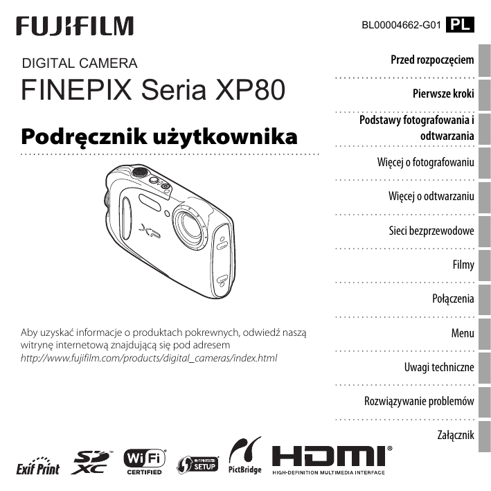 BL00004662-G01 DIGITAL CAMERA FINEPIX Seria XP80 Podręcznik użytkownika PL Przed rozpoczęciem Pierwsze kroki Podstawy fotografowania i odtwarzania Więcej o fotografowaniu Więcej o odtwarzaniu Sieci bezprzewodowe Filmy Połączenia Aby uzyskać informacje o produktach pokrewnych, odwiedź naszą witrynę internetową znajdującą się pod adresem http://www.fujifilm.com/products/digital_cameras/index.html Menu Uwagi techniczne Rozwiązywanie problemów Załącznik Dla własnego bezpieczeństwa Przed rozpoczęciem użytkowania koniecznie przeczytaj poniższe uwagi OSTRZEŻENIE Uwagi dotyczące bezpieczeństwa • Upewnij się, że aparat jest obsługiwany poprawnie. Przed rozpoczęciem użytkowania przeczytaj uważnie niniejsze uwagi dotyczące bezpieczeństwa oraz Podręcznik użytkownika. • Po przeczytaniu niniejszych uwag dotyczących bezpieczeństwa przechowuj je w bezpiecznym miejscu. Odłącz od gniazda zasilania Informacje o oznaczeniach Przedstawione poniżej oznaczenia są używane w niniejszym dokumencie do wskazania stopnia obrażeń lub uszkodzeń, które mogą wynikać ze zignorowania towarzyszących im informacji i niepoprawnego użycia urządzenia. Oznaczenie wskazuje prawdopodobieństwo wystąpienia śmierci lub poważnych obrażeń w przypadku zignorowania informacji. Nie wolno używać w łazience lub pod prysznicem OSTRZEŻENIE Oznaczenie wskazuje prawdopodobieństwo wystąpienia obrażeń ciała lub uszkodzenia mienia w przypadku zignorowania PRZESTROGA informacji. Nie wolno demontować Przedstawione poniżej oznaczenia są używane do wskazania rodzaju instrukcji, których należy przestrzegać. Trójkątne oznaczenia informują o konieczności zwrócenia uwagi na daną informację („Ważne”). Okrągłe oznaczenia z przekreśleniem informują o zakazie wykonywania danej czynności („Zabronione”). Wypełnione koła ze znakiem wykrzyknika informują o konieczności wykonania danej czynności („Wymagane”). Uwagi dotyczące produktów wodoodpornych • Gdy ten aparat nie jest używany, należy go przechowywać w suchym miejscu. • Jeśli na aparat zostanie wylany płyn inny niż świeża woda lub woda morska, należy go wytrzeć niestrzępiącą się ściereczką, tuż po wypłukaniu w świeżej wodzie. W przypadku braku pewności należy skontaktować się z lokalnym centrum serwisowym. • Produkty wodoodporne/kurzoodporne nie są objęte zakazem narażania na działanie wody/kurzu. Należy mieć to na uwadze podczas czytania poniższych uwag i przestróg. ii Nie dotykać części wewnętrznych W przypadku wystąpienia problemu należy wyłączyć aparat, wyjąć akumulator i odłączyć zasilacz sieciowy od aparatu i gniazda zasilania. Jeśli z aparatu wydostaje się dym lub dziwny zapach, lub jeśli aparat jest w innym nietypowym stanie, jego dalsze użytkowanie może spowodować pożar lub porażenie prądem. Skontaktuj się ze sprzedawcą firmy FUJIFILM. Należy uważać, aby do aparatu nie dostała się ciecz lub ciała obce. W przypadku dostania się cieczy lub ciała obcego do aparatu należy wyłączyć aparat, wyjąć akumulator i odłączyć zasilacz sieciowy od aparatu i gniazda zasilania. Dalsze używanie aparatu może spowodować pożar lub porażenie prądem. Skontaktuj się ze sprzedawcą firmy FUJIFILM. Nie wolno używać aparatu w łazience ani pod prysznicem (z wyjątkiem produktów wodoodpornych). Może to spowodować pożar lub porażenie prądem. Nigdy nie rozmontowywać ani nie modyfikować aparatu (nigdy nie otwierać obudowy). Nieprzestrzeganie tego zalecenia może prowadzić do pożaru lub porażenia prądem. W przypadku gdy obudowa pęknie, na przykład w wyniku upadku, nie dotykać odkrytych części. Nieprzestrzeganie tego zalecenia może prowadzić do porażenia prądem lub uszkodzenia ciała spowodowanych dotknięciem uszkodzonych części. Natychmiast wyjąć akumulator, zachowując ostrożność w celu uniknięcia porażenia prądem lub zranienia, a następnie zanieść produkt do miejsca zakupu po poradę. Dla własnego bezpieczeństwa OSTRZEŻENIE OSTRZEŻENIE Nie należy wymieniać, nagrzewać, zbytnio zawijać ani wyciągać przewodu zasilania, ani umieszczać na nim ciężkich przedmiotów. Czynności te mogą uszkodzić przewód i spowodować pożar lub porażenie prądem. Jeśli przewód uległ uszkodzeniu, skontaktuj się ze sprzedawcą firmy FUJIFILM. Niebezpieczeństwo wybuchu w przypadku nieprawidłowej wymiany baterii. Wymieniać wyłącznie na baterie tego samego typu. Nie umieszczaj aparatu na niestabilnej powierzchni. W przeciwnym razie aparat może spaść lub przechylić się i spowodować obrażenia. Akumulator należy przenosić w aparacie cyfrowym lub w sztywnym opakowaniu. Akumulator należy przechowywać w sztywnym opakowaniu. Przed wyrzuceniem akumulatora zaklej jego styki taśmą izolacyjną. Zetknięcie akumulatora z innymi metalowymi przedmiotami lub innym akumulatorem/baterią może spowodować zapłon bądź wybuch. Przechowuj karty pamięci w miejscach niedostępnych dla dzieci. Ponieważ karty pamięci są małe, może dojść do ich połknięcia przez dziecko. Przechowuj karty pamięci w miejscach niedostępnych dla dzieci. Jeśli dziecko połknie kartę pamięci, uzyskaj pomoc lekarską lub zadzwoń na numer alarmowy. Nie należy robić zdjęć, będąc w ruchu. Nie należy używać aparatu podczas chodzenia ani prowadzenia pojazdu. Może to spowodować upadek użytkownika lub wypadek drogowy. Nie wolno dotykać metalowych części aparatu w czasie burzy. Może to spowodować porażenie prądem wywołane przez ładunek elektryczny piorunu. Nie używaj akumulatora w sposób inny niż opisany. Włóż akumulator, dostosowując oznaczenia na akumulatorze do odpowiednich oznaczeń w aparacie. Nie przegrzewaj, nie modyfikuj ani nie demontuj akumulatora. Nie upuszczaj akumulatora ani nie narażaj go na wstrząsy. Nie przechowuj akumulatora z metalowymi przedmiotami. Każde z tych działań moż