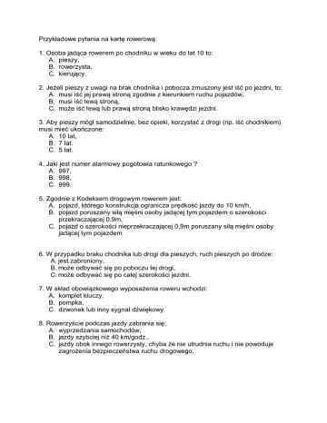 Przykładowe pytania na kartę rowerową: 1. Osoba jadąca rowerem po chodniku w wieku do lat 10 to: A. pieszy, B. rowerzysta, C. kierujący. 2. Jeżeli pieszy z uwagi na brak chodnika i pobocza zmuszony jest iść po jezdni, to: A. musi iść jej prawą stroną zgodnie z kierunkiem ruchu pojazdów, B. musi iść lewą stroną, C. może iść lewą lub prawą stroną blisko krawędzi jezdni. 3. Aby pieszy mógł samodzielnie, bez opieki, korzystać z drogi (np. iść chodnikiem) musi mieć ukończone: A. 10 lat, B. 7 lat. C. 5 lat. 4. Jaki jest numer alarmowy pogotowia ratunkowego ? A. 997, B. 998, C. 999. 5. Zgodnie z Kodeksem drogowym rowerem jest: A. pojazd, którego konstrukcja ogranicza prędkość jazdy do 10 km/h, B. pojazd poruszany siłą mięśni osoby jadącej tym pojazdem o szerokości przekraczającej 0,9m, C. pojazd o szerokości nieprzekraczającej 0,9m poruszany siłą mięśni osoby jadącej tym pojazdem 6. W przypadku braku chodnika lub drogi dla pieszych, ruch pieszych po drodze: A. jest zabroniony, B. może odbywać się po poboczu tej drogi, C. może odbywać się po całej szerokości jezdni. 7. W skład obowiązkowego wyposażenia roweru wchodzi: A. komplet kluczy, B. pompka, C. dzwonek lub inny sygnał dźwiękowy. 8. Rowerzyście podczas jazdy zabrania się: A. wyprzedzania samochodów, B. jazdy szybciej niż 40 km/godz., C. jazdy obok innego rowerzysty, chyba że nie utrudnia ruchu i nie powoduje zagrożenia bezpieczeństwa ruchu drogowego. 9. Do kierowania rowerem po drodze publicznej osobę w wieku 11 lat uprawnia: A. tylko karta rowerowa, B. pisemna zgoda rodziców, C. zgoda wychowawcy podczas wycieczki klasowej, jeżeli połowa uczniów posiada karty rowerowe. 10. Wyprzedzanie to: A. przejeżdżanie rowerem obok pieszego idącego w tym samym kierunku, B. przejeżdżanie rowerem obok innego rowery jadącego z przeciwka, C. przejeżdżanie rowerem obok unieruchomionego samochodu. 11. Podczas wyprzedzania innego rowerzysty należy zachować odstęp: A. minimum 0,5 metra, B. minimum 1 metr, C. bezpieczny, ale przepisy nie określają minimalnej odległości. 12. Ile maksymalnie rowerów jednośladowych może poruszać się w zorganizowanej kolumnie ? A. 5, B. 10, C. 15. 13. Dziecko w wieku 6lat może być przewożone rowerem: A. na kierownicy, tyłem do kierunku jazdy, B. na kierownicy, przodem do kierunku jazdy, C. tylko na dodatkowym siodełku. 14. Włączając się do ruchu rowerzysta jest zobowiązany ustąpić pierwszeństwa: A. tylko kierującym pojazdami, B. wszystkim uczestnikom ruchu, C. tylko pieszym oraz pojazdom nadjeżdżającym z prawej strony. 15. Wyprzedzanie innego rowerzysty na przejściu dla pieszych jest: A. dozwolone wyłącznie na przejściach o ruchu kierowanym, B. zawsze zabronione, C. dozwolone bez ograniczeń. 16. Pojazd uprzywilejowany to: A. każdy pojazd Policji, B. pojazd wysyłający niebieskie światło błyskowe i sygnał dźwiękowy o zmiennym tonie, C. tramwaj wjeżdżający na skrzyżowanie. 17. Kierujący rowerem powinien sygnalizować zamiar zmiany pasa ruchu: A. zawczasu, B. w trakcie manewru, C. po uprzednim użyciu dzwonka. 18. Kierujący rowerem powinien w kolejności stosować się do: A. sygnalizacji świetlnej, poleceń policjanta kierującego ruchem, znaków drogowych, B. poleceń policjanta kierującego ruchem, sygnalizacji świetlnej, znaków drogowych C. poleceń policjanta kierującego ruchem, znaków drogowych, sygnalizacji świetlnej, 19. W razie konieczności unieruchomienia złamanej kończyny należy unieruchomić: A. miejsce złamania i najbliższe stawy, B. tylko najbliższy złamany staw, C. tylko samo miejsce złamania. 20.Ten znak nazywa się A. „droga z pierwszeństwem”, B. „ustąp pierwszeństwa ”, C. „uwaga skrzyżowanie”. 21. Ten znak zabrania A. parkowania, B. ruchu, C. wjazdu. 22. Znak ten oznacza A. na skrzyżowaniu ruch odbywa się dookoła wyspy, B. możliwy jest postój na tym skrzyżowaniu C. zabrania zawracania. 23. Który znak nakazuje ustąpić pierwszeństwa przejazdu ? A B C 24. Podaj kolejność na skrzyżowaniu A. 1, 2, 3 B. 2,1, 3 C. 3,2, 1. 25. Podaj kolejność na skrzyżowaniu A. 3, 1, 2 B. 2, 1, 3 C. 3, 2, 1. 1 3 26. Podaj kolejność na skrzyżowaniu A. 3, 1, 2 B 1, 3, 2 C. 3, 2, 1. 27. Włączając się do ruchu, kierujący pojazdem powinien: a) zachować ostrożność b) ustąpić pierwszeństwa pojazdom już będącym w ruchu c) ustąpić pierwszeństwa pieszym tylko wówczas, gdy skręca w lewo. 2 28. Cofanie pojazdu jest: A) zabronione w tunelu, B) dozwolone na moście lub wiadukcie C) dozwolone na drodze ekspresowej 29. Po skręceniu w lewo, kierujący pojazdem: A) może zająć dowolny pas ruchu na prawej połowie jezdni dwukierunkowej B) powinien zająć lewy skrajny pas ruchu na jezdni jednokierunkowej, C) powinien zająć najbliższy osi jezdni pas ruchu na drodze dwukierunkowej 30. Ten znak: A) zabrania skrętu w prawo na skrzyżowaniu B) zezwala na jazdę w lewo na najbliższym skrzyżowaniu C) oznacza początek ruchu jednokierunkowego na jezdni 31. Te znaki: A) ostrzegają o 4 niebezpiecznych zakrętach B) ostrzegają, że pierwszy zakręt jest w prawo, a drugi w lewo C) ostrzegają w sumie o sześciu zakrętach 32. Dojeżdżając do przystanku tramwajowego bez wysepki na którym stoi tramwaj, kierujący rowerem powinien zatrzymać pojazd: A) tuż przed przejściem dla pieszych przy przystanku, B) w takim miejscu, aby zapewnić pieszym dojście do tramwaju, C) na wysokości znaku oznaczającego przystanek. 33. Który z tych znaków zabrania wjazdu rowerem?: A) B) C) 34. Wyprzedzany rowerzysta: A) może przyspieszyć B) zawsze musi zatrzymać się aby ułatwić wyprzedzanie C) powinien zjechać jak najbardziej na prawo 35. Znak ten: A) nakazuje jazdę w lewo B) zabrania skręcania w lewo C) nie dotyczy rowerzystów 36. Wyprzedzanie pojazdu uprzywilejowanego jest: A) zawsze dozwolone B) niedozwolone C) dozwolone poza obszarem zabudowanym 37. W tej sytuacji 