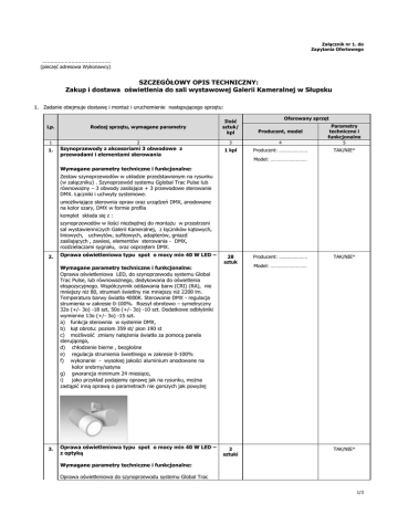 Załącznik nr 1. do Zapytania Ofertowego …………………………………… (pieczęć adresowa Wykonawcy) SZCZEGÓŁOWY OPIS TECHNICZNY: Zakup i dostawa oświetlenia do sali wystawowej Galerii Kameralnej w Słupsku 1. Zadanie obejmuje dostawę i montaż i uruchomienie następującego sprzętu: Lp. Ilość sztuk/ kpl Producent, model Parametry techniczne i funkcjonalne 2 3 4 5 1 kpl Producent: ………………… TAK/NIE* 1 1. Oferowany sprzęt Rodzaj sprzętu, wymagane parametry Szynoprzewody z akcesoriami 3 obwodowe z przewodami i elementami sterowania Model: ……………………… Wymagane parametry techniczne i funkcjonalne: Zestaw szynoprzewodów w układzie przedstawionym na rysunku (w załączniku) . Szynoprzewód systemu Gglobal Trac Pulse lub równoważny – 3 obwody zasilające + 3 przewodowe sterowanie DMX. Łączniki i uchwyty systemowe. umożliwiające sterownia opraw oraz urządzeń DMX, anodowane na kolor szary, DMX w formie profila komplet składa się z : szynoprzewodów w ilości niezbędnej do montażu w przestrzeni sal wystawienniczych Galerii Kameralnej, z łączników kątowych, liniowych, uchwytów, sufitowych, adapterów, gniazd zasilających , zawiesi, elementów sterowania - DMX, rozdzielaczami sygnału, oraz osprzętem DMX. 2. Oprawa oświetleniowa typu spot o mocy min 40 W LED – Wymagane parametry techniczne i funkcjonalne: Oprawa oświetleniowa LED, do szynoprzewodu systemu Global Trac Pulse, lub równoważnego, dedykowana do oświetlenia ekspozycyjnego. Współczynnik oddawania barw (CRI) (RA), nie mniejszy niż 80, strumień świetlny nie mniejszy niż 2200 lm. Temperatura barwy światła 4000K. Sterowanie DMX - regulacja strumienia w zakresie 0-100%. Rozsył obrotowo – symetryczny 32o (+/- 3o) -18 szt, 50o (+/- 3o) -10 szt. Dodatkowe odbłyśniki wymienne 13o (+/- 3o) -15 szt. a) funkcja sterownia w systemie DMX, b) kąt obrotu: poziom 359 st/ pion 190 st c) możliwość zmiany natężenia światła za pomocą panela sterującego, d) chłodzenie bierne , bezgłośne e) regulacja strumienia świetlnego w zakresie 0-100% f) wykonanie - wysokiej jakości aluminium anodowane na kolor srebrny/satyna g) gwarancja minimum 24 miesiące, i) jako przykład podajemy oprawę jak na rysunku, można zastąpić inną oprawą o parametrach nie gorszych jak powyżej 3. Oprawa oświetleniowa typu spot o mocy min 40 W LED – z optyką 28 sztuk 2 sztuki Producent: ………………… TAK/NIE* Model: ……………………… TAK/NIE* Wymagane parametry techniczne i funkcjonalne: Oprawa oświetleniowa do szynoprzewodu systemu Global Trac 1/3 Pulse, lub równoważnego, dedykowana do oświetlenia ekspozycyjnego. Współczynnik oddawania barw (CRI) (RA), nie mniejszy niż 80, strumień świetlny nie mniejszy niż 2000 lm. Temperatura barwy światła 4000K. Sterowanie DMX - regulacja strumienia w zakresie 0-100%. Układ optyczny kadrujący z nożami w układzie prostokątnym z możliwością montażu GOBO. a) b) c) d) e) f) g) funkcja sterownia w systemie DMX, kąt obrotu: poziom 359 st/ pion 190 st, możliwość zmiany natężenia światła za pomocą panela sterującego, chłodzenie bierne, bezgłośne, regulacja strumienia świetlnego w zakresie 0-100%, wykonanie - wysokiej jakości aluminium anodowane na kolor srebrny/satyna h) gwarancja minimum 24 miesiące. 4. Sterowniki rozdzielacze sygnału (tzw. splitter) do sterowania dźwiękiem 3 sztuki Wymagane parametry techniczne i funkcjonalne: Rozdzielacz i wzmacniacz sygnału DMX do montażu w szynoprzewodzie systemu Global Trac Pulse, lub równoważnym umożliwia podłączenie do magistrali DMX urządzeń zewnętrznych (odtwarzacze AV, efekty świetlne itd.) sterowanych DMX. Linie wejściowe/wyjściowe – 1/3, kanały wejściowe/wyjściowe DMX – 512/512, zasilanie 230V AC – z szynoprzewodu. Gwarancja minimum 24 miesiące 5. Sterowniki grupowe do zarządzania oświetleniem 3 sztuki Producent: ………………… 3 sztuki Producent: ………………… 1 sztuka Producent: ………………… Wymagane parametry techniczne i funkcjonalne: Model: ……………………… Sterownik Splitter, czyli rozdzielacz DMX, możliwość tworzenia rozgałęzień w rozbudowanych instalacjach DMX, możliwość tworzenia rozgałęzień toru DMX przy pomocy splittera Rozdzielacz i wzmacniacz sygnału DMX do montażu w rozdzielnicy na szynie DMX . Linie wejściowe/wyjściowe – 1/6, kanały wejściowe/wyjściowe DMX – 512/512, napięcie przebicia izolacji wejścia/wyjścia – 1000V, zasilanie 12- 24V DC Gwarancja minimum 24 miesiące 6. 7. Sterowniki centralne do zarządzania oświetleniem Wymagane parametry techniczne i funkcjonalne: Programowalny sterownik oświetlenia do rozbudowanych instalacji. Programowanie z komputera PC za pośrednictwem złącza USB lub LAN. Sterowanie zewnętrzne przyciskami, czujnikami ruchu, wyłącznikami zmierzchowymi. Współpraca z panelem dotykowym. a) Zasilanie 12 V DC, b) Max. pobór prądu 400 mA, c) kanały wyjściowe DMX 512 d) kanały wejściowe DMA 512 e) Wejścia sterujące – min. 20 f) Wbudowany zegar czasu rzeczywistego g) Sceny min - 600 h) Programy min – 100 i) Timery min – 100 j) Sekwencje – min 100 k) Opóźnienia min – 100 l) Maski min – 100 m) Gwarancja minimum 24 miesiące Panel dotykowy sterujący odtwarzaniem programów zapisanych w sterownikach Model: ……………………… Model: ……………………… Wymagane parametry techniczne i funkcjonalne: Panel dotykowy do zaawansowanego zarządzania scenami i programami zapisanymi w sterowniku. Ciekłokrystaliczny wyświetlacz LCD 5,7", 65.000 kolorów. W pełni programowane funkcje zarządzania sterownikiem, definiowana ilość i wygląd przycisków/ suwaków . Dedykowany do współpracy z dostarczonym sterownikiem. materiał obudowy Stal/Aluminium anodowane przekątna ekranu 5,7'' zasilanie 12V DC (przekrój przewodu min. 0,5 mm2) 2/3 Gwarancja minimum 24 miesiące 8. Montaż całego sy