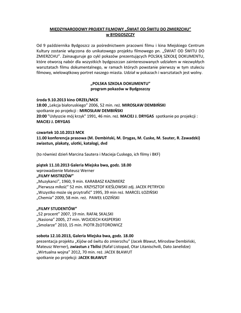 MIĘDZYNARODOWY PROJEKT FILMOWY „ŚWIAT OD ŚWITU DO ZMIERZCHU” w BYDGOSZCZY Od 9 października Bydgoszcz za pośrednictwem pracowni filmu i kina Miejskiego Centrum Kultury zostanie włączona do unikatowego projektu filmowego pn. „ŚWIAT OD ŚWITU DO ZMIERZCHU”. Zainauguruje go cykl pokazów prezentujących POLSKĄ SZKOŁĘ DOKUMENTU, które otworzą nabór dla wszystkich bydgoszczan zainteresowanych udziałem w niezwykłych warsztatach filmu dokumentalnego, w ramach których powstanie pierwszy w tym stuleciu filmowy, wielowątkowy portret naszego miasta. Udział w pokazach i warsztatach jest wolny. „POLSKA SZKOŁA DOKUMENTU” program pokazów w Bydgoszczy środa 9.10.2013 kino ORZEŁ/MCK 18:00 „Lekcja białoruskiego” 2006, 52 min. reż. MIROSŁAW DEMBIŃSKI spotkanie po projekcji : MIROSŁAW DEMBIŃSKI 20:00 "Usłyszcie mój krzyk" 1991, 46 min. reż. MACIEJ J. DRYGAS spotkanie po projekcji : MACIEJ J. DRYGAS czwartek 10.10.2013 MCK 11.00 konferencja prasowa (M. Dembiński, M. Drygas, M. Cuske, M. Sauter, R. Zawadzki) zwiastun, plakaty, ulotki, katalogi, dvd (to również dzień Marcina Sautera i Macieja Cuskego, ich filmy i BKF) piątek 11.10.2013 Galeria Miejska bwa, godz. 18.00 wprowadzenie Mateusz Werner „FILMY MISTRZÓW” „Muzykanci”, 1960, 9 min. KARABASZ KAZIMIERZ „Pierwsza miłość” 52 min. KRZYSZTOF KIEŚLOWSKI zdj. JACEK PETRYCKI „Wszystko może się przytrafić” 1995, 39 min reż. MARCEL ŁOZIŃSKI „Chemia“ 2009, 58 min. reż. PAWEŁ ŁOZIŃSKI „FILMY STUDENTÓW” „52 procent” 2007, 19 min. RAFAŁ SKALSKI „Nasiona” 2005, 27 min. WOJCIECH KASPERSKI „Smolarze” 2010, 15 min. PIOTR ZŁOTOROWICZ sobota 12.10.2013, Galeria Miejska bwa, godz. 18.00 prezentacja projektu „Kijów od świtu do zmierzchu” (Jacek Bławut, Mirosław Dembiński, Mateusz Werner), zwiastun z Tbilisi (Rafał Listopad, Otar Litanischvili, Dato Janelidze) „Wirtualna wojna” 2012, 70 min. reż. JACEK BŁAWUT spotkanie po projekcji: JACEK BŁAWUT ŚWIAT OD ŚWITU DO ZMIERZCHU – o projekcie: Fundacja DOKUMENT i ŚWIAT z Warszawy, doceniając szczególną rolę i znaczenie Miejskiego Centrum Kultury w Bydgoszczy jako instytucji wyróżniającej się w skali ogólnopolskiej, a przede wszystkim instytucji odzwierciedlającej zachodzące zmiany w systemie zarządzania kulturą, wybrała w roku 2012 miasto Bydgoszcz i podczas Festiwalu Sztuki Reportażu CAMNERA OBSCURA 2012 zaprosiła do udziału w międzynarodowym projekcie filmowotelewizyjnym pt. „Świat od świtu do zmierzchu“. Jest to wyjątkowe w światowej skali przedsięwzięcie edukacyjno-filmowe, w którym wybitni polscy dokumentaliści prowadzą warsztaty filmowe w różnych miastach na świecie. W wyniku tych warsztatów powstają dokumentalne portrety miast prezentowane później w cyklu specjalnych pokazów w kinach i emitowane w różnych stacjach telewizyjnych na całym świecie. W większości miast projekt opiera się na współpracy środowisk lokalnych szkół filmowych z najlepszymi z polskich twórców filmów dokumentalnych. Ponieważ w Bydgoszczy nie ma uczelni filmowej, realizacja części dotyczącej naszego miasta opiera się na idei partycypacji, co w praktyce przekłada się na otwarte zaproszenie do wszystkich mieszkańców, którzy chcieliby się podzielić opowieściami o swoim mieście i zainspirować w ten sposób młodych filmowców z działających i aktywnych w Bydgoszczy grup takich jak m. in.: Bydgoska Kronika Filmowa, Stowarzyszenie KolorOFFON, Fundacja ART-HOUSE i absolwenci warsztatów Letniej Szkoły Filmu i Reportażu. Do udziału w projekcie zapraszamy również studentów UKW. Autorzy 10 spośród zgłoszonych w postaci treatmentów pomysłów na etiudy dokumentalne otrzymają możliwość pracy nad rozwijaniem swoich pomysłów w filmy podczas w warsztatu. Po pokazach inauguracyjnych od 9 do 12.10. nastąpi proces rekrutacji chętnych na warsztaty i do praktycznej realizacji etiud dokumentalnych, z których zmontowany zostanie 60-minutowy film dokumentalny opisujący Bydgoszcz „od świtu do zmierzchu”. Warsztaty i realizacja odbędą się w przedziale od 18 października do 12 listopada br. Bazą będzie MCK. Premiera zmontowanych 4 filmowych portretów miast zarejestrowanych w roku 2013 będzie miała miejsce w kinie ORZEŁ na przełomie stycznia i lutego 2014. W ten sposób, nawiązując do bogatej tradycji filmu dokumentalnego w naszym mieście projekt ten wpisuje się również w program Bydgoska Tożsamość Filmowa. Zainteresowani mogą wysyłać treatment (ok. 1 strony) z pomysłem na filmową dokumentalną opowieść o Bydgoszczy na adres: [email protected] do 12 października. Do tej pory zrealizowano projekt w 5 zagranicznych metropoliach: Mińsku, Kijowie, Moskwie, Pekinie i Tokio. Spotkał się on z wyjątkowym uznaniem wszystkich uczestniczących w nim instytucji i osób. Partnerami projektu są: Ministerstwo Kultury i Dziedzictwa Narodowego, Instytut Adama Mickiewicza, Polski Instytut Sztuki Filmowej, Ministerstwo Spraw Zagranicznych, TVP, Belsat TV po stronie polskiej a także szkoły filmowe, instytucje społeczne i kulturalne, na Białorusi, na Ukrainie, w Rosji, w Chinach i w Japonii. Wszystkie 5 gotowych filmów wyemitowała kilkukrotnie Telewizja Polska w Polsce i Belsat TV na Białorusi. W Japonii filmy miały regularną dystrybucję kinową, co jest ewenementem w wypadku filmów dokumentalnych. W roku 2013 organizator projektu – Fundacja Dokument i Świat przystąpiła do realizacji kolejnej jego edycji, tym razem w Mołdawii, Gruzji, Armenii i Polsce. Oficjalnymi partnerami pozostały te same instytucje co w edycji 2012. Zagwarantowana jest też już emisja w TVP i Belsat TV oraz pokazy w kinach Kiszyniowa, Istambułu, Tbilisi. Spośród polskich miast wybrano właśnie Bydgoszcz ze względu na dynamicznie rozwijające się środowisko filmowe, szczególnie to dokumentalne, skupione wokół Miejskiego Centrum Kultury. Praca edukacyjn
