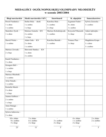 MEDALIŚCI OGÓLNOPOLSKIEJ OLIMPIADY MŁODZIEŻY w sezonie 2003/2004 Biegi narciarskie Skoki narciarskie i KN Snowboard K. alpejskie Saneczkarstwo Paweł Fundanicz – Stefan Hula – skoki Karolina Hula – Zygmunt Fiedor – Sylwia Zarzecka – 1 x złoto 1 x srebro 1 x srebro 4 x złoto 1 x srebro 1 x srebro 1 x brąz 2 x brąz 1 x srebro Stanisław Żyrek – Mariusz Gomola – KN Mariusz Kołodziejczak- Krzysztof Mazurek- Adam Jędrzejko – 1 x złoto 2 x srebro 1 x srebro 1 x brąz 2 x złoto 1 x brąz Dawid Waluś – Adam Gała – KN Karolina Bieniek – Tomasz Plan – Magdalena Krupa – 1 x srebro 2 x złoto 1 x srebro 1 x brąz 1 x złoto 1 x srebro Mariusz Zowada – Sławomir Hankus – KN 2 x brąz 1 x złoto 1 x srebro 2 x srebro Kamil Fundanicz – 3 x złoto Grzegorz Bril – 1 x srebro 1 x brąz Mariusz Hluchnik – 1 x srebro Artur Smuda – 1 x srebro Kornelia Marek – 2 x złoto 1 x brąz Joanna Gulbierz – 2 x srebro 1 x brąz Anna Staręga – 1 x srebro Sylwia Jaśkowiec – 3 x złoto 10 x złoto 8 x srebro 5 x brąz _________ 23 3 x złoto 6 x srebro 2 x brąz _________ 11 3 x srebro 2 x brąz ________ 5 4 x złoto 1 x srebro 2 x brąz ________ 7 3 x złoto 2 x srebro ________ 5 UCZNIOWIE, KTÓRZY W SEZONIE 2003/2004 OSIĄGNĘLI NAJLEPSZE WYNIKI SPORTOWE Biegi narciarskie: 1. Jaśkowiec Sylwia – 2 miejsce – 5km CL - MPS, 2 miejsce - sprint 1000 m – MPS, 3 miejsce – Czechy Zawody FIS, 3 miejsce – Austria Zawody FIS 4 miejsce – Mistrzostwa Czech Seniorów. 2. Marek Kornelia – 2 miejsce – MPS, 6 miejsce – Austria Zawody FIS. 3. Fundanicz Kamil – 3 miejsce – sprint 1000 m – MPS. 4. Małyjurek Arkadiusz – 3 miejsce – MPS. Skoki narciarskie: 1. Hula Stefan – 2 miejsce – MŚJ – drużyna, 13 miejsce – MŚJ – indywidualnie. Kombinacja norweska: 1. Gała Adam – 4 miejsce – MPS. 2. Gomola Mariusz, Gała Adam, Hankus Sławomir – starty w Pucharze Świata „B”. Snowboard: 1. Hula Karolina – 17 miejsce – MŚJ, 3 i 4 miejsce – MMP FIS, 1 i 2 miejsce – Zawody FIS Czechy, 9 miejsce – PE FIS. 2. Kołodziejczak Mariusz – 10 miejsce - MMP FIS, 1 miejsce – Zawody FIS Czechy. Konkurencje alpejskie: 1. Zagórski Wojciech – 2 miejsce SL – MPS, 25 miejsce SL – MŚJ, 2 miejsce SL – Zawody UNI FIS. 2. Fiedor Zygmunt – 5 miejsce SL specjalny – Zawody FIS Słowacja. 3. Plan Tomasz – 9 miejsce GS – Zawody FIS Czechy. 4. Ilewicz Jakub – 13 miejsce GS – Zawody FIS Czechy. Saneczkarstwo: 1. Waniczek Damian – 1 miejsce – jedynki – MPS, 1 miejsce – dwójki – MPS, 4 miejsce – punktacja generalna Pucharu Świata, 7 miejsce – Mistrzostwa Europy. 2. Jędrzejko Adam – 2 miejsce – jedynki – MPS, 3 miejsce – dwójki – MPS. 3. Zawada Magdalena – 11 miejsce – MŚJ. UCZNIOWIE, KTÓRZY W SEZONIE 2003/2004 OSIĄGNĘLI NAJLEPSZE WYNIKI SPORTOWE Gimnazjum SMS Snowboard: 1. Hula Natalia – 8 miejsce – MMP FIS, 1 i 3 miejsce – Zawody FIS Czechy. Konkurencje alpejskie: 1. Bydliński Maciej – 13 miejsce GS – Zawody FIS Czechy. Saneczkarstwo: 1. Pogwizd Danuta – 1 brązowy medal – OOM. 2. Kobielus Marzena – 1 złoty medal – OOM. 3. Kobza Piotr – 1 srebrny medal – OOM, 1 brązowy medal – MPS.