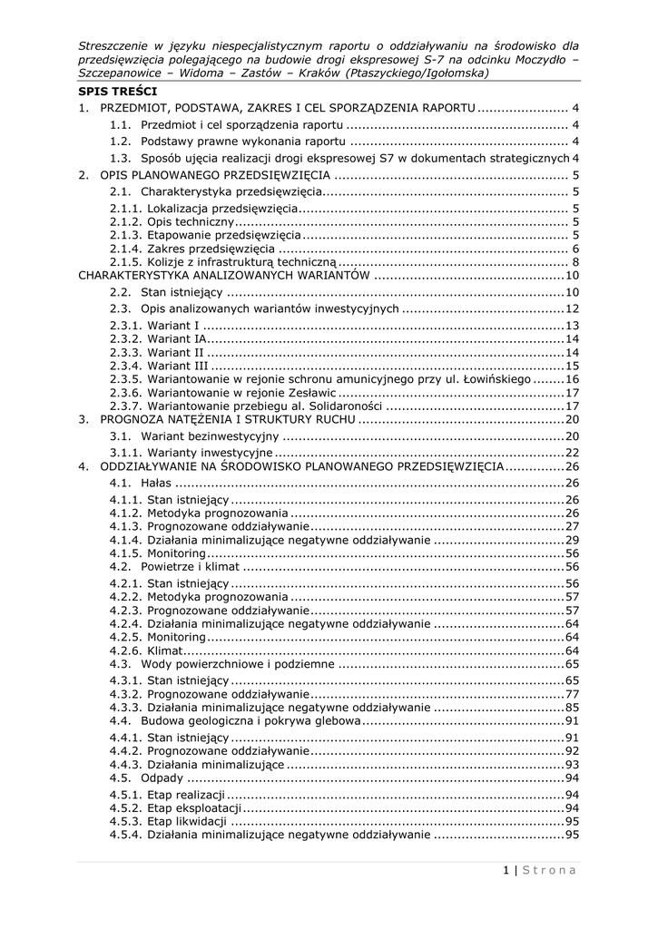 Streszczenie w języku niespecjalistycznym raportu o oddziaływaniu na środowisko dla przedsięwzięcia polegającego na budowie drogi ekspresowej S-7 na odcinku Moczydło – Szczepanowice – Widoma – Zastów – Kraków (Ptaszyckiego/Igołomska) SPIS TREŚCI 1. PRZEDMIOT, PODSTAWA, ZAKRES I CEL SPORZĄDZENIA RAPORTU ....................... 4 1.1. Przedmiot i cel sporządzenia raportu ........................................................ 4 1.2. Podstawy prawne wykonania raportu ....................................................... 4 1.3. Sposób ujęcia realizacji drogi ekspresowej S7 w dokumentach strategicznych 4 2. OPIS PLANOWANEGO PRZEDSIĘWZIĘCIA ........................................................... 5 2.1. Charakterystyka przedsięwzięcia.............................................................. 5 2.1.1. Lokalizacja przedsięwzięcia.................................................................... 5 2.1.2. Opis techniczny .................................................................................... 5 2.1.3. Etapowanie przedsięwzięcia ................................................................... 5 2.1.4. Zakres przedsięwzięcia ......................................................................... 6 2.1.5. Kolizje z infrastrukturą techniczną .......................................................... 8 CHARAKTERYSTYKA ANALIZOWANYCH WARIANTÓW ................................................ 10 2.2. Stan istniejący ..................................................................................... 10 2.3. Opis analizowanych wariantów inwestycyjnych ......................................... 12 2.3.1. Wariant I ........................................................................................... 13 2.3.2. Wariant IA.......................................................................................... 14 2.3.3. Wariant II .......................................................................................... 14 2.3.4. Wariant III ......................................................................................... 15 2.3.5. Wariantowanie w rejonie schronu amunicyjnego przy ul. Łowińskiego ........ 16 2.3.6. Wariantowanie w rejonie Zesławic ......................................................... 17 2.3.7. Wariantowanie przebiegu al. Solidaroności ............................................. 17 3. PROGNOZA NATĘŻENIA I STRUKTURY RUCHU .................................................... 20 3.1. Wariant bezinwestycyjny ....................................................................... 20 3.1.1. Warianty inwestycyjne ......................................................................... 22 4. ODDZIAŁYWANIE NA ŚRODOWISKO PLANOWANEGO PRZEDSIĘWZIĘCIA ............... 26 4.1. Hałas .................................................................................................. 26 4.1.1. Stan istniejący .................................................................................... 26 4.1.2. Metodyka prognozowania ..................................................................... 26 4.1.3. Prognozowane oddziaływanie ................................................................ 27 4.1.4. Działania minimalizujące negatywne oddziaływanie ................................. 29 4.1.5. Monitoring .......................................................................................... 56 4.2. Powietrze i klimat ................................................................................. 56 4.2.1. Stan istniejący .................................................................................... 56 4.2.2. Metodyka prognozowania ..................................................................... 57 4.2.3. Prognozowane oddziaływanie ................................................................ 57 4.2.4. Działania minimalizujące negatywne oddziaływanie ................................. 64 4.2.5. Monitoring .......................................................................................... 64 4.2.6. Klimat................................................................................................ 64 4.3. Wody powierzchniowe i podziemne ......................................................... 65 4.3.1. Stan istniejący .................................................................................... 65 4.3.2. Prognozowane oddziaływanie ................................................................ 77 4.3.3. Działania minimalizujące negatywne oddziaływanie ................................. 85 4.4. Budowa geologiczna i pokrywa glebowa ................................................... 91 4.4.1. Stan istniejący .................................................................................... 91 4.4.2. Prognozowane oddziaływanie ................................................................ 92 4.4.3. Działania minimalizujące ...................................................................... 93 4.5. Odpady ............................................................................................... 94 4.5.1. 4.5.2. 4.5.3. 4.5.4. Etap realizacji ..................................................................................... 94 Etap eksploatacji ................................................................................. 94 Etap likwidacji .................................................................................... 95 Działania minimalizujące negatywne oddziaływanie ................................. 95 1|Strona Streszczenie w języku niespecjalistycznym raportu o oddziaływaniu na środowisko dla przedsięwzięcia polegającego na budowie drogi ekspresowej S-7 na odcinku Moczydło – Szczepanowice – Widoma – Zastów – Kraków (Ptaszyckiego/Igołomska) 4.6. Krajobraz ............................................................................................. 96 4.6.1. Stan istniejący .................................................