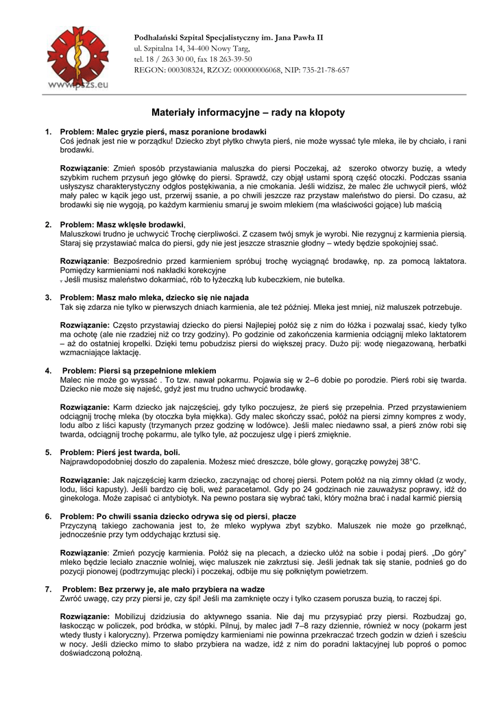 Podhalański Szpital Specjalistyczny im. Jana Pawła II ul. Szpitalna 14, 34-400 Nowy Targ, tel. 18 / 263 30 00, fax 18 263-39-50 REGON: 000308324, RZOZ: 000000006068, NIP: 735-21-78-657 Materiały informacyjne – rady na kłopoty 1. Problem: Malec gryzie pierś, masz poranione brodawki Coś jednak jest nie w porządku! Dziecko zbyt płytko chwyta pierś, nie może wyssać tyle mleka, ile by chciało, i rani brodawki. Rozwiązanie: Zmień sposób przystawiania maluszka do piersi Poczekaj, aż szeroko otworzy buzię, a wtedy szybkim ruchem przysuń jego główkę do piersi. Sprawdź, czy objął ustami sporą część otoczki. Podczas ssania usłyszysz charakterystyczny odgłos postękiwania, a nie cmokania. Jeśli widzisz, że malec źle uchwycił pierś, włóż mały palec w kącik jego ust, przerwij ssanie, a po chwili jeszcze raz przystaw maleństwo do piersi. Do czasu, aż brodawki się nie wygoją, po każdym karmieniu smaruj je swoim mlekiem (ma właściwości gojące) lub maścią 2. Problem: Masz wklęsłe brodawki, Maluszkowi trudno je uchwycić Trochę cierpliwości. Z czasem twój smyk je wyrobi. Nie rezygnuj z karmienia piersią. Staraj się przystawiać malca do piersi, gdy nie jest jeszcze strasznie głodny – wtedy będzie spokojniej ssać. Rozwiązanie: Bezpośrednio przed karmieniem spróbuj trochę wyciągnąć brodawkę, np. za pomocą laktatora. Pomiędzy karmieniami noś nakładki korekcyjne . Jeśli musisz maleństwo dokarmiać, rób to łyżeczką lub kubeczkiem, nie butelka. 3. Problem: Masz mało mleka, dziecko się nie najada Tak się zdarza nie tylko w pierwszych dniach karmienia, ale też później. Mleka jest mniej, niż maluszek potrzebuje. Rozwiązanie: Często przystawiaj dziecko do piersi Najlepiej połóż się z nim do łóżka i pozwalaj ssać, kiedy tylko ma ochotę (ale nie rzadziej niż co trzy godziny). Po godzinie od zakończenia karmienia odciągnij mleko laktatorem – aż do ostatniej kropelki. Dzięki temu pobudzisz piersi do większej pracy. Dużo pij: wodę niegazowaną, herbatki wzmacniające laktację. 4. Problem: Piersi są przepełnione mlekiem Malec nie może go wyssać . To tzw. nawał pokarmu. Pojawia się w 2–6 dobie po porodzie. Pierś robi się twarda. Dziecko nie może się najeść, gdyż jest mu trudno uchwycić brodawkę. Rozwiązanie: Karm dziecko jak najczęściej, gdy tylko poczujesz, że pierś się przepełnia. Przed przystawieniem odciągnij trochę mleka (by otoczka była miękka). Gdy malec skończy ssać, połóż na piersi zimny kompres z wody, lodu albo z liści kapusty (trzymanych przez godzinę w lodówce). Jeśli malec niedawno ssał, a pierś znów robi się twarda, odciągnij trochę pokarmu, ale tylko tyle, aż poczujesz ulgę i pierś zmięknie. 5. Problem: Pierś jest twarda, boli. Najprawdopodobniej doszło do zapalenia. Możesz mieć dreszcze, bóle głowy, gorączkę powyżej 38°C. Rozwiązanie: Jak najczęściej karm dziecko, zaczynając od chorej piersi. Potem połóż na nią zimny okład (z wody, lodu, liści kapusty). Jeśli bardzo cię boli, weź paracetamol. Gdy po 24 godzinach nie zauważysz poprawy, idź do ginekologa. Może zapisać ci antybiotyk. Na pewno postara się wybrać taki, który można brać i nadal karmić piersią 6. Problem: Po chwili ssania dziecko odrywa się od piersi, płacze Przyczyną takiego zachowania jest to, że mleko wypływa zbyt szybko. Maluszek nie może go przełknąć, jednocześnie przy tym oddychając krztusi się. Rozwiązanie: Zmień pozycję karmienia. Połóż się na plecach, a dziecko ułóż na sobie i podaj pierś. „Do góry” mleko będzie leciało znacznie wolniej, więc maluszek nie zakrztusi się. Jeśli jednak tak się stanie, podnieś go do pozycji pionowej (podtrzymując plecki) i poczekaj, odbije mu się połkniętym powietrzem. 7. Problem: Bez przerwy je, ale mało przybiera na wadze Zwróć uwagę, czy przy piersi je, czy śpi! Jeśli ma zamknięte oczy i tylko czasem porusza buzią, to raczej śpi. Rozwiązanie: Mobilizuj dzidziusia do aktywnego ssania. Nie daj mu przysypiać przy piersi. Rozbudzaj go, łaskocząc w policzek, pod bródka, w stópki. Pilnuj, by malec jadł 7–8 razy dziennie, również w nocy (pokarm jest wtedy tłusty i kaloryczny). Przerwa pomiędzy karmieniami nie powinna przekraczać trzech godzin w dzień i sześciu w nocy. Jeśli dziecko mimo to słabo przybiera na wadze, idź z nim do poradni laktacyjnej lub poproś o pomoc doświadczoną położną.