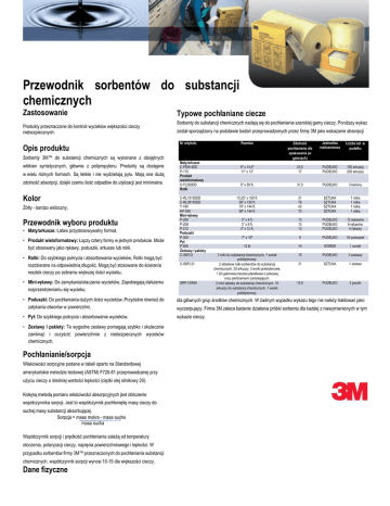 Przewodnik sorbentów do substancji chemicznych Zastosowanie Produkty przeznaczone do kontroli wycieków większości cieczy niebezpiecznych. Opis produktu Sorbenty 3M™ do substancji chemicznych są wykonane z obojętnych włókien syntetycznych, głównie z polipropylenu. Produkty są dostępne w wielu różnych formach. Są lekkie i nie wydzielają pyłu. Mają one dużą zdolność absorpcji, dzięki czemu ilość odpadów do utylizacji jest minimalna. Kolor Żółty - bardzo widoczny, Przewodnik wyboru produktu • Maty/arkusze: Łatwo przystosowywalny format, • Produkt wieloformatowy: Łączy cztery formy w jednym produkcie. Może być stosowany jako rękawy, poduszki, arkusze lub rolki. • Rolki: Do szybkiego pokrycia i absorbowania wycieków, Rolki mogą być rozdzierane na odpowiednią długość, Mogą być stosowane do ścierania resztek cieczy po zebraniu większej ilości wycieku, • Mini-rękawy: Do zamykania/otaczania wycieków, Zapobiegają dalszemu rozprzestrzenianiu się wycieku, Typowe pochłaniane ciecze Sorbenty do substancji chemicznych nadają się do pochłaniania szerokiej gamy cieczy. Poniższy wykaz został sporządzony na podstawie badań przeprowadzonych przez firmę 3M jako wskazanie absorpcji Nr artykułu Maty/arkusze C-PD914DD P-110 Produkt wieloformatowy C-FL550DD Rolki C-RL15150DD C-RL38150DD T-190 HP-500 Mini-rękawy P-200 P-208 P-212 Poduszki P-300 Pył P-500 Zestawy i pakiety C-SKFL5 C-SKFL31 SRP-CHEM Rozmiar Zdolność pochłaniania dla opakowania (w galonach) Jednostka rozliczeniowa Liczba szt. w pudełku 9" x 14,5" 11" x 13" 23,5 17 PUDEŁKO PUDEŁKO 150 arkuszy 200 arkuszy 5" x 50 ft. 31,5 PUDEŁKO 3 kartony 15,25" x 150 ft. 38" x 150 ft. 19" x 144 ft. 38" x 144 ft. 31 76 42 73 SZTUKA SZTUKA SZTUKA SZTUKA 1 rolka 1 rolka 1 rolka 1 rolka 3" x 4 ft. 3" x 8 ft. 3" x 12 ft. 12 12 12 PUDEŁKO PUDEŁKO PUDEŁKO 12 rękawów 6 rękawów 4 rękawy 7" x 15" 8 PUDEŁKO 16 poduszek 12 lb 14 WOREK 1 worek 3 rolki do substancji chemicznych, 1 worek polietylenowy. 2 składane rolki sorbentów do substancji chemicznych, 30 arkuszy, 3 worki polietylenowe, 1 20-galonowa beczka plastikowa z pokrywą oraz pierścieniem zamykającym. 3 mini-rękawy do substancji chemicznych, 10 arkuszy do substancji chemicznych, 1 worek polietylenowy. 15 PUDEŁKO 3 zestawy 31 SZTUKA 1 zestaw 10,5 PUDEŁKO 3 paczki • Poduszki: Do pochłaniania dużych ilości wycieków, Przydatne również do zatykania otworów w powierzchni, dla głównych grup środków chemicznych. W żadnym wypadku wykazu tego nie należy traktować jako • Pył: Do szybkiego pokrycia i absorbowania wycieków, wykazie cieczy. • Zestawy i pakiety: Te wygodne zestawy pomagają szybko i skutecznie zamknąć i oczyścić powierzchnie z niebezpiecznych wycieków chemicznych, Pochłanianie/sorpcja Właściwości sorpcyjne podane w tabeli oparto na Standardowej amerykańskie metodzie testowej (ASTM) F726-81 przeprowadzanej przy użyciu cieczy o średniej wartości lepkości (ciężki olej silnikowy 20). Kolejną metodą pomiaru właściwości absorpcyjnych jest obliczenie współczynnika sorpcji. Jest to współczynnik pochłoniętej masy cieczy do suchej masy substancji absorbującej. Sorpcja = masa mokra - masa sucha masa sucha Współczynnik sorpcji i prędkość pochłaniania zależą od temperatury otoczenia, polaryzacji cieczy, napięcia powierzchniowego i lepkości. W przypadku sorbentów firmy 3M™ przeznaczonych do pochłaniania substancji chemicznych, współczynnik sorpcji wynosi 10-15 dla większości cieczy. Dane fizyczne wyczerpujący. Firma 3M zaleca badanie działania próbki sorbentu dla każdej z niewymienionych w tym Ograniczenia stosowania Sorbentów chemicznych 3M nie należy stosować z następującymi stężonymi substancjami chemicznymi z powodu występowania ryzyka rozkładu: oleum, kwas chlorosulfonowy, ciekły brom, kwas azotowy dymiący, kwas chromowy, kwas siarkowy i nadtlenek wodoru. Przed użyciem sorbentu firma 3M zaleca przeprowadzenie badania zgodności na cieczy, która ma zostać usunięta. W przypadku stosowania w temperaturze ponad 60 °C konieczne jest, aby przed użyciem koniecznie przeprowadzić takie badanie zgodności. Środki ostrożności Sorbenty firmy 3M™ do substancji chemicznych same w sobie nie są produktami niebezpiecznymi, jednak przyjmują one właściwości cieczy, które pochłaniają. Podczas postępowania z i przechowywania materiałów niebezpiecznych / łatwopalnych należy stosować odpowiednie środki ostrożności oraz środki ochrony indywidualnej. Użytkownicy powinni być informowani na temat ryzyka związanego ze stosowanie, magazynowaniem i utylizacją sorbentów. Usuwanie Zużyte sorbenty należy usuwać wyłącznie zgodnie z przepisami lokalnymi i krajowymi. W zależności od pochłanianej substancji chemicznej, w celu uzyskania zaleceń odnośnie do utylizacji należy skontaktować się z firmami zajmującymi się odpadami. Minimalizacji odpadów Jeśli możliwe, firma 3M zaleca ograniczenie strumieni odpadów do minimum. Sorbenty 3M promują minimalizację odpadów, stanowiąc jedynie niewielką część odpadów całkowitych. Dodatkowo, jeśli pozwalają na to przepisy, sorbenty firmy 3M™ do substancji chemicznych mogą być unieszkodliwiane poprzez spalanie, generując przy tym jedynie 0,02 % popiołu (ASTM D-482). Wysoka wartość energetyczna sorbentów (46 000 kJ/kg) jest również korzystna dla układów spalania i przetwarzania odpadów w paliwo. Ponadto sorbenty firmy 3M mogą być wyżymane i ponownie wykorzystywane (odzysk 90% materiału przy zastosowaniu wyżymarki mechanicznej zgodnie z normą ASTM F726-81). Samą odzyskaną ciecz można następnie ponownie wykorzystać lub zutylizować. Palność Sorbenty 3M™ zostały przetestowane przez niezależne laboratorium pod kątem właściwości palnych. Badania przeprowadzono pod kątem długotrwałego przechowywania, gromadzenia ciepła i zapalności w wyniku działania trzech