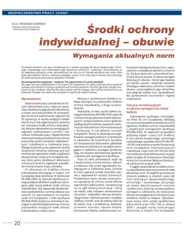 BEZPIECZEŃSTWO PRACY 12/2007 dr in¿. WIES£AWA KAMIÑSKA Środki ochrony indywidualnej – obuwie Centralny Instytut Ochrony Pracy – Pañstwowy Instytut Badawczy Wymagania aktualnych norm W artykule omówiono stan prac normalizacyjnych w zakresie wymagañ dla obuwia bezpiecznego, ochronnego i zawodowego oraz metod badania jego w³aściwości ochronnych i u¿ytkowych. Ustosunkowano siê do najbardziej znacz¹cych zmian wprowadzonych do norm po ich ostatniej aktualizacji oraz zmian, które bêd¹ wprowadzone wkrótce. Dokonano przegl¹du nowych norm dotycz¹cych obuwia przeznaczonego do u¿ytkowania przy wykonywaniu specjalnych zawodów. Personal protective equipment – footwear. The requirements of current standards This paper discusses standardization in the scope of the requirements for safety, protective and occupational footwear and methods for testing its protective and functional properties. The most significant changes introduced into the standards, following their latest revision and the changes, which will be introduced soon are presented. The paper also reviews new standards for specific job-related footwear. Wprowadzenie Wykonywanie pracy zawodowej na ró¿nych stanowiskach pracy wi¹¿e siê najczêściej z określonymi zagro¿eniami dla zdrowia, a nawet ¿ycia pracowników. W sytuacjach, gdy nie mo¿na wyeliminowaæ zagro¿eñ lub ich ograniczyæ w wyniku podjêtych dzia³añ technicznych lub organizacyjnych, powinny byæ stosowane środki ochrony indywidualnej, dobrane odpowiednio do wystêpuj¹cych zagro¿eñ, wykonywanych czynności i warunków środowiska pracy. Niejednokrotnie stanowi¹ one jedyn¹ mo¿liw¹ formê ochrony pracownika przed czynnikami niebezpiecznymi i szkodliwymi w środowisku pracy. Dlatego te¿ powinny one zapewniaæ wysok¹ skutecznośæ ochronn¹, stanowi¹c przy tym mo¿liwie jak najmniejsze źród³o uci¹¿liwości dla pracownika. Dotyczy to szczególnie obuwia, które oprócz określonych w³aściwości ochronnych powinno zapewniaæ prawid³owe funkcjonowanie stopy cz³owieka. W odniesieniu do środków ochrony indywidualnej obowi¹zuj¹ w krajach Unii Europejskiej dwie dyrektywy. W dyrektywie 89/686/EWG [1], która jest dyrektyw¹ nowego podejścia określono zasadnicze wymagania, jakie musz¹ spe³niaæ środki ochrony indywidualnej, aby zapewnia³y bezpieczeñstwo u¿ytkowników i ochronê zdrowia oraz warunki ich wprowadzania na wspólny rynek Unii Europejskiej. Z kolei dyrektywa 89/656/EWG [2] dotyczy minimalnych wymagañ w zakresie bezpieczeñstwa i ochrony pracowników stosuj¹cych środki ochrony indywidualnej w miejscu pracy. 20 Pierwsza z wymienionych dyrektyw nak³ada obowi¹zki na producentów środków ochrony indywidualnej, a druga na pracodawców. Wykazanie, ¿e dany wyrób spe³nia wymagania dyrektywy 89/686/EWG wi¹¿e siê z konieczności¹ wykonania badañ laboratoryjnych i przeprowadzenia oceny zgodności wed³ug metod i kryteriów zawartych w technicznych dokumentach zharmonizowanych z dyrektyw¹, w tym g³ównie normach europejskich. Normy te zawieraj¹ uszczegó³owienie wymagañ podanych w dyrektywie w odniesieniu do konkretnych wyrobów. Ich stosowanie jest dobrowolne, jakkolwiek stanowi¹ one po¿yteczne narzêdzie pomagaj¹ce w spe³nieniu wymagañ dyrektywy. Daj¹ one bowiem domniemanie zgodności z zasadniczymi wymaganiami dyrektywy. Praca na wielu stanowiskach wi¹¿e siê z konieczności¹ ochrony koñczyn dolnych, a zw³aszcza stóp przed zagro¿eniami wystêpuj¹cymi w środowisku pracy. Ochronê tê mo¿e zapewniæ przede wszystkim obuwie o odpowiednich cechach ochronnych. Produkowane wzory obuwia, przeznaczone najczêściej do ochrony przed kilkoma zagro¿eniami jednocześnie, charakteryzuj¹ siê na ogó³ z³o¿on¹ konstrukcj¹ i ró¿ni¹ siê miêdzy sob¹ rodzajem zastosowanych surowców i materia³ów (obuwie skórzane, ca³ogumowe i ca³otworzywowe), modelem (pó³buty, trzewiki, buty do po³owy ³ydki lub do kolana, buty z przed³u¿on¹ cholewk¹), systemem monta¿u (obuwie klejone, przeszywano-klejone, wulkanizowane, wy- konywane metod¹ wtryskow¹ i inne), wyposa¿eniem w dodatkowe elementy ochronne itp. Tak du¿a z³o¿onośæ i ró¿norodnośæ konstrukcji obuwia sprawia, ¿e zakres wymagañ dotycz¹cych obuwia i metod jego badania jest bardzo szeroki i obejmuje wskaźniki określaj¹ce w³aściwości ochronne, trwa³ośæ obuwia i poszczególnych jego elementów oraz po³¹czeñ miêdzy nimi, nieszkodliwośæ dla u¿ytkowników oraz komfort i higienê u¿ytkowania. Stan prac normalizacyjnych w zakresie wymagañ oraz metod badania Zobowi¹zania wynikaj¹ce z przyst¹pienia Polski do Unii Europejskiej nak³adaj¹ na nasz kraj obowi¹zek prowadzenia oceny zgodności środków ochrony indywidualnej z zasadniczymi wymaganiami dyrektywy 89/686/EWG. W wiêkszości przypadków podstaw¹ badañ i oceny tych środków, w tym obuwia bezpiecznego, ochronnego i zawodowego, s¹ polskie normy PN-EN i PN-EN ISO ustanowione w wyniku t³umaczenia norm europejskich zharmonizowanych z dyrektyw¹. Czêśæ norm EN i EN ISO, które nie zosta³y jeszcze przet³umaczone na jêzyk polski, przyjêto do stosowania w Polsce jako normy tzw. uznaniowe. Bêd¹ one t³umaczone sukcesywnie na jêzyk polski. Z ci¹g³ym doskonaleniem środków ochrony indywidualnej wi¹¿e siê koniecznośæ sta³ej aktualizacji norm. Szczególnie gruntownym zmianom poddano w ostatnim czasie cykl norm dotycz¹cych obuwia bezpiecznego, ochronnego i zawodowego, poczynaj¹c od zmiany dotychczasowych numerów i tytu³ów norm, a koñcz¹c na wprowadzeniu wymagañ w odniesieniu do w³aściwości obuwia nie uwzglêdnianych do tej pory oraz określeniu metod ich badania. Zaktualizowane normy, które zosta³y opublikowane jednocześnie przez CEN i ISO w sierpniu 2004 r. zast¹pi³y normy funkcjonuj¹ce dotychczas w krajach Unii Europejskiej. BEZPIECZEŃSTWO PRACY 12/2007 Tabela 1 WYKAZ NORM ZHARMONIZOWANYCH Z DYREKTYW¥ 89/686/EWG DOTYCZ¥CYCH OBUWIA