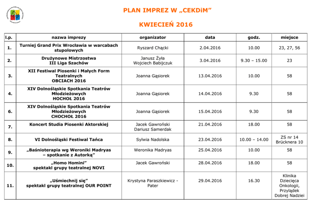 PLAN IMPREZ W „CEKDiM” KWIECIEŃ 2016 l.p. nazwa imprezy organizator data godz. miejsce 1. Turniej Grand Prix Wrocławia w warcabach stupolowych Ryszard Chącki 2.04.2016 10.00 23, 27, 56 2. Drużynowe Mistrzostwa III Liga Szachów Janusz Żyła Wojciech Babijczuk 3.04.2016 9.30 – 15.00 23 3. XII Festiwal Piosenki i Małych Form Teatralnych OBCIACH 2016 Joanna Gąsiorek 13.04.2016 10.00 58 4. XIV Dolnośląskie Spotkania Teatrów Młodzieżowych HOCHOŁ 2016 Joanna Gąsiorek 14.04.2016 9.30 58 6. XIV Dolnośląskie Spotkania Teatrów Młodzieżowych CHOCHOŁ 2016 Joanna Gąsiorek 15.04.2016 9.30 58 Koncert Studia Piosenki Aktorskiej Jacek Gawroński Dariusz Samerdak 21.04.2016 18.00 58 8. VI Dolnośląski Festiwal Tańca Sylwia Nadolska 23.04.2016 10.00 – 14.00 ZS nr 14 Brücknera 10 9. „Baśnioterapia wg Weroniki Madryas – spotkanie z Autorką” Weronika Madryas 25.04.2016 10.00 58 10. „Homo Homini” spektakl grupy teatralnej NOVI Jacek Gawroński 28.04.2016 18.00 58 „Uśmiechnij się” spektakl grupy teatralnej OUR POINT Krystyna Paraszkiewicz Pater 29.04.2016 16.30 7. 11. Klinika Dziecięca Onkologii, Przylądek Dobrej Nadziei PLAN WYSTAW KWIECIEŃ 2016 l.p. nazwa wystawy kurator wystawy miejsce czas ekspozycji 1. „Ceramika w oknie – gliniane cuda” wystawa indywidualna Marka Lazurka i Franciszka Bogulaka Marta Alenowicz okna 4.04 – 30.04.2016 2. Wystawa zbiorowa pracowni malarstwa i rysunku Małgorzata Michniak parter 6.04 – 30.04.2016 3. Wystawa ilustracji Izabeli Kaszy Izabela Kasza pasaż 11.04 – 31.04.2016 4. Wystawa pracowni grafiki i rękodzieła Beata Turska I piętro 8.04 – 30.04.2016 5. Wystawa grafiki komputerowej Elżbieta Ratajczyk II piętro 11.04 – 31.04.2016