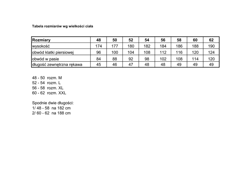 Tabela rozmiarów wg wielkości ciała Rozmiary wysokość 48 174 50 177 52 180 54 182 56 184 58 186 60 188 62 190 obwód klatki piersiowej 96 100 104 108 112 116 120 124 obwód w pasie długość zewnętrzna rękawa 84 45 88 46 92 47 98 48 102 48 108 49 114 49 120 49 48 - 50 52 - 54 56 - 58 60 - 62 rozm. M rozm. L rozm. XL rozm. XXL Spodnie dwie długości: 1/ 48 - 58 na 182 cm 2/ 60 - 62 na 188 cm