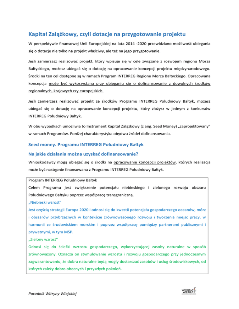 Kapitał Zalążkowy, czyli dotacje na przygotowanie projektu W perspektywie finansowej Unii Europejskiej na lata 2014 -2020 przewidziano możliwość ubiegania się o dotacje nie tylko na projekt właściwy, ale też na jego przygotowanie. Jeśli zamierzasz realizować projekt, który wpisuje się w cele związane z rozwojem regionu Morza Bałtyckiego, możesz ubiegać się o dotację na opracowanie koncepcji projektu międzynarodowego. Środki na ten cel dostępne są w ramach Program INTERREG Regionu Morza Bałtyckiego. Opracowana koncepcja może być wykorzystana przy ubieganiu się o dofinansowanie z dowolnych środków regionalnych, krajowych czy europejskich. Jeśli zamierzasz realizować projekt ze środków Programu INTERREG Południowy Bałtyk, możesz ubiegać się o dotację na opracowanie koncepcji projektu, który złożysz w jednym z konkursów INTERREG Południowy Bałtyk. W obu wypadkach umożliwia to Instrument Kapitał Zalążkowy (z ang. Seed Money) „zaprojektowany” w ramach Programów. Poniżej charakterystyka obydwu źródeł dofinansowania. Seed money. Programu INTERREG Południowy Bałtyk Na jakie działania można uzyskać dofinansowanie? Wnioskodawcy mogą ubiegać się o środki na opracowanie koncepcji projektów, których realizacja może być następnie finansowana z Programu INTERREG Południowy Bałtyk. Program INTERREG Południowy Bałtyk Celem Programu jest zwiększenie potencjału niebieskiego i zielonego rozwoju obszaru Południowego Bałtyku poprzez współpracę transgraniczną. „Niebieski wzrost” Jest częścią strategii Europa 2020 i odnosi się do kwestii potencjału gospodarczego oceanów, mórz i obszarów przybrzeżnych w kontekście zrównoważonego rozwoju i tworzenia miejsc pracy, w harmonii ze środowiskiem morskim i poprzez współpracę pomiędzy partnerami publicznymi i prywatnymi, w tym MŚP. „Zielony wzrost” Odnosi się do ścieżki wzrostu gospodarczego, wykorzystującej zasoby naturalne w sposób zrównoważony. Oznacza on stymulowanie wzrostu i rozwoju gospodarczego przy jednoczesnym zagwarantowaniu, że dobra naturalne będą mogły dostarczać zasobów i usług środowiskowych, od których zależy dobro obecnych i przyszłych pokoleń. Poradnik Witryny Wiejskiej W ramach projektu „seed money" można uzyskać wsparcie finansowe na wypracowanie właściwej koncepcji projektowej czy znalezienie partnerów projektowych zarówno za granicą, jak i w kraju. Seed Money jest małym programem, którego celem jest przygotowanie projektu w pełnej formie. Dzięki temu narzędziu będziecie mogli wypracować partnerstwo a także założenia swojego projektu, który będzie można zgłosić w jednym z naborów do Programu INTERREG Południowy Bałtyk. Uzyskane środki mogą zostać wykorzystanie na działania takie jak np.: poszukiwanie partnerów, wykonanie analiz rynku, zorganizowanie warsztatów w celu określenia wartości bazowych wskaźników lub oszacowania zainteresowania potencjalnej grupy docelowej itp. Koncepcja projektu musi dotyczyć jednego ze zdefiniowanych w Programie celów szczegółowych, takich jak m.in.: poprawa konkurencyjności MSP z zielonego i niebieskiego sektora na rynkach międzynarodowych, transfer innowacji na rzecz MSP z tych sektorów, wykorzystanie zielonych technologii do obniżenia poziomu zanieczyszczenia środowiska, wykorzystanie dziedzictwa kulturowego i naturalnego do rozwijania turystyki, poprawa jakości usług transportowych i technologie transportowe przyjazne środowisku, wymiana wykwalifikowanych pracowników w zielonym i niebieskim sektorze, wzmacnianie zdolności instytucjonalnych w zakresie współpracy międzynarodowej. Kto może ubiegać się o dotację? O dotację mogą ubiegać się przede wszystkim instytucje publiczne, organizacje pozarządowe, instytucje otoczenia biznesu, podmioty prywatne o charakterze non-profit (np. spółki non-profit), uczelnie, instytuty badawcze i badawczo-rozwojowe, klastry. Ze wsparcia nie mogą korzystać przedsiębiorstwa/ firmy nastawione na zysk o charakterze stricte przemysłowym lub handlowym. Projekt musi być wdrażany przez konsorcjum składające się z co najmniej dwóch partnerów pochodzących z dwóch różnych krajów. Program INTERREG Południowy Bałtyk obejmuje nadmorskie regiony 5 państw członkowskich UE: Danii, Litwy, Niemiec (Meklemburgii-Pomorza Przedniego), Polski, Poradnik Witryny Wiejskiej Szwecji. Jeśli chodzi o Polskę, w projektach mogą brać udział podmioty zarejestrowane w następujących jednostkach administracyjnych: Miasto Szczecin, powiaty: szczeciński, stargardzki, szczecineckopyrzycki, koszaliński, chojnicki, słupski, gdański, starogardzki, trójmiejski i elbląski. Ze względów praktycznych zaleca się, aby konsorcja nie były zbyt duże, tj. obejmowały maksymalnie 4-5 partnerów. Każdy partner musi posiadać budżet i zapewnić współfinansowanie projektu. Jaki jest maksymalny poziom dofinansowania? Całkowity budżet projektu nie może przekroczyć 40.000,00 Euro, w tym 85% dofinansowania z ERDF (w przypadku partnerów z Polski). Koszty kwalifikowalne obejmują zatrudnienie personelu, podróże i zakwaterowanie oraz zakup usług eksperckich. Koszt przygotowania wniosku o dofinansowanie właściwego projektu nie może przekroczyć 1 500 euro netto. Wkład własny nie może być finansowany ze środków Unii Europejskiej. Koszty administracyjne, koszty doposażenia stanowisk pracy, koszty materiałów biurowych itp. nie są kosztami kwalifikowalnymi. W jaki sposób ubiegać się o dotację? Wniosek o dotację składa lider konsorcjum w odpowiedzi na ogłoszony konkurs. W dokumentacji konkursowej udostępniany jest formularz wniosku o dofinansowanie. Wniosek o dofinansowanie oraz pozostałe wymagane dokumenty (w tym skany deklaracji konsorcjantów) należy przygotować i złożyć w języku angielskim – oficjalnym języku Programu INTERREG Południowy Bałtyk. Aplikacje przygotowane w innym język