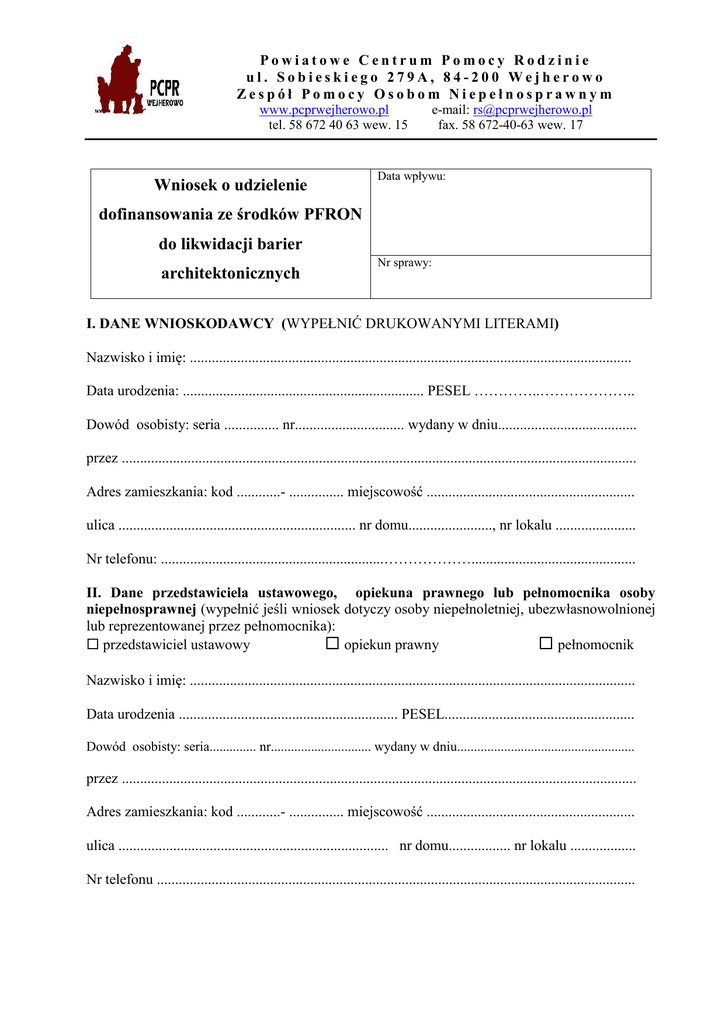 Powiatowe Centrum Pomocy Rodzinie ul. Sobieskiego 279A, 84-200 Wejherowo Zespół Pomocy Osobom Niepełnosprawnym www.pcprwejherowo.pl tel. 58 672 40 63 wew. 15 Wniosek o udzielenie e-mail: [email protected] fax. 58 672-40-63 wew. 17 Data wpływu: dofinansowania ze środków PFRON do likwidacji barier architektonicznych Nr sprawy: I. DANE WNIOSKODAWCY (WYPEŁNIĆ DRUKOWANYMI LITERAMI) Nazwisko i imię: ......................................................................................................................... Data urodzenia: .................................................................. PESEL …………..……………….. Dowód osobisty: seria ............... nr.............................. wydany w dniu...................................... przez ............................................................................................................................................. Adres zamieszkania: kod ............- ............... miejscowość ......................................................... ulica ................................................................. nr domu......................., nr lokalu ...................... Nr telefonu: .............................................................………………............................................. II. Dane przedstawiciela ustawowego, opiekuna prawnego lub pełnomocnika osoby niepełnosprawnej (wypełnić jeśli wniosek dotyczy osoby niepełnoletniej, ubezwłasnowolnionej lub reprezentowanej przez pełnomocnika): przedstawiciel ustawowy opiekun prawny pełnomocnik Nazwisko i imię: .......................................................................................................................... Data urodzenia ............................................................ PESEL.................................................... Dowód osobisty: seria.............. nr.............................. wydany w dniu..................................................... przez ............................................................................................................................................. Adres zamieszkania: kod ............- ............... miejscowość ......................................................... ulica .......................................................................... nr domu................. nr lokalu .................. Nr telefonu ................................................................................................................................... III. Informacje dotyczące przedmiotu dofinansowania: 1. Przedmiot dofinansowania (opis istniejącej bariery architektonicznej): ........................................................................................................................................................... ........................................................................................................................................................... ........................................................................................................................................................... ........................................................................................................................................................... ........................................................................................................................................................... ........................................................................................................................................................... ........................................................................................................................................................... ........................................................................................................................................................... ........................................................................................................................................................... ..................................................................................................................................................... 2. Miejsce realizacji zadania: ………………………………………………………………… ………………………………………………………………………………………………….. Sytuacja mieszkaniowa : a) mieszkanie w bloku / kamienicy /dom jednorodzinny/dom wielorodzinny** b) lokal na parterze / piętrze (jakim)………….. c) przybliżony wiek budynku lub rok budowy …………………… 3. Cel dofinansowania (wskazać planowane przedsięwzięcia do wykonania w celu likwidacji istniejących barier): ........................................................................................................................................................... ........................................................................................................................................................... ........................................................................................................................................................... ........................................................................................................................................................... ........................................................................................................................................................... ........................................................................................................................................................... ........................................................................................................................................................... .............................................................................................................