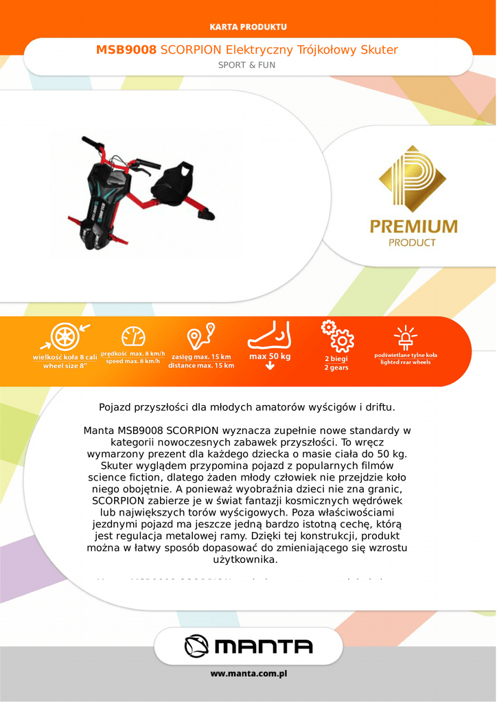 MSB9008SCORPIONElektrycznyTrójkołowySkuter SPORT&FUN Pojazdprzyszłościdlamłodychamatorówwyścigówidriftu. MantaMSB9008SCORPIONwyznaczazupełnienowestandardyw kategoriinowoczesnychzabawekprzyszłości.Towręcz wymarzonyprezentdlakażdegodzieckaomasieciałado50kg. Skuterwyglądemprzypominapojazdzpopularnychfilmów sciencefiction,dlategożadenmłodyczłowieknieprzejdziekoło niegoobojętnie.Aponieważwyobraźniadziecinieznagranic, SCORPIONzabierzejewświatfantazjikosmicznychwędrówek lubnajwiększychtorówwyścigowych.Pozawłaściwościami jezdnymipojazdmajeszczejednąbardzoistotnącechę,którą jestregulacjametalowejramy.Dziękitejkonstrukcji,produkt możnawłatwysposóbdopasowaćdozmieniającegosięwzrostu użytkownika. MantaMSB9008SCORPIONposiadagumoweprzedniekołoo MSB9008SCORPIONElektrycznyTrójkołowySkuter SPORT&FUN Specyfikacja Zapraszamydoświata produktówpremium! Najwyższejjakościwykonanieiwyselekcjonowane materiałysągwarancjąsatysfakcjizużytkowania. Jużterazzapoznajsięzcałągamąnaszych PremiumProduct! Dodatkowefunkcje przyciskregulatoraprędkości,2biegi Bateria 8Ah Maksymalneobciążenie 50kg Maksymalnaprędkość 8km/h Zasięgnajednymładowaniu 15km Maksymalnazdolnośćpokonywania wzniesień 15° Mocsilnika 100W Materiałkół guma Rozmiarkołaprzedniego 8" http://www.manta.com.pl/pl/msb9008 EAN:5902510604080