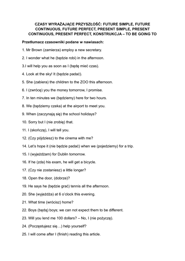 CZASY WYRAŻAJĄCE PRZYSZŁOŚĆ: FUTURE SIMPLE, FUTURE CONTINUOUS, FUTURE PERFECT, PRESENT SIMPLE, PRESENT CONTINUOUS, PRESENT PERFECT, KONSTRUKCJA – TO BE GOING TO Przetłumacz czasowniki podane w nawiasach: 1. Mr Brown (zamierza) employ a new secretary. 2. I wonder what he (będzie robi) in the afternoon. 3.I will help you as soon as I (będę mieć czas). 4. Look at the sky! It (będzie padać). 5. She (zabiera) the children to the ZOO this afternoon. 6. I (zwrócę) you the money tomorrow, I promise. 7. In ten minutes we (będziemy) here for two hours. 8. We (będziemy czeka) at the airport to meet you. 9. When (zaczynają się) the school holidays? 10. Sorry but I (nie zrobię) that. 11. I (skończę), I will tell you. 12. (Czy pójdziesz) to the cinema with me? 14. Let’s hope it (nie będzie padać) when we (pojedziemy) for a trip. 15. I (wyjeżdżam) for Dublin tomorrow. 16. If he (zda) his exam, he will get a bicycle. 17. (Czy nie zostaniesz) a little longer? 18. Open the door, (dobrze)? 19. He says he (będzie grać) tennis all the afternoon. 20. She (wyjeżdża) at 6 o’clock this evening. 21. What time (wrócisz) home? 22. Boys (będą) boys; we can not expect them to be different. 23. Will you lend me 100 dollars? – No, I (nie pożyczę). 24. (Poczęstujesz się…) help yourself? 25. I will come after I (finish) reading this article. Przetłumacz czasowniki podane w nawiasach: 1. My brother (zamierza kupić) a new house at the seaside. 2. By July you (nauczycie się) a lot of new English words. 3. At this time next week (będziemy lecieć) to America. 4. What (będzie robił) at this time tomorrow. 5. As soon as you come, I (przyniosę) you some coffee. 6. I (przeczytam) all these magazines by Friday. 7. I think that they (zamierzają spędzić) the weekend in Rome. 8. I hope she (napisze) to me soon. 9. As usual (zamierzamy wspinać się) the mountains in autumn. 10. Tonight at nine (będę się kąpać). 11. By September we (sprzedamy) all the summer dresses as we (zamierzamy obniżyć) their prices. 12. If he goes for a walk, he certainly (zabierze) the dog with him. 13. If she does not wear warm clothes, she (przeziębi się). 14. We (będziemy się uczy) hard at this time next month. Adapted from M. Bębenek, Z. Kucharczyk Zbiór testów gramatycznych z języka angielskiego. Przedsiębiorstwo Wydawnicze “Elipsa”, Katowice 1995