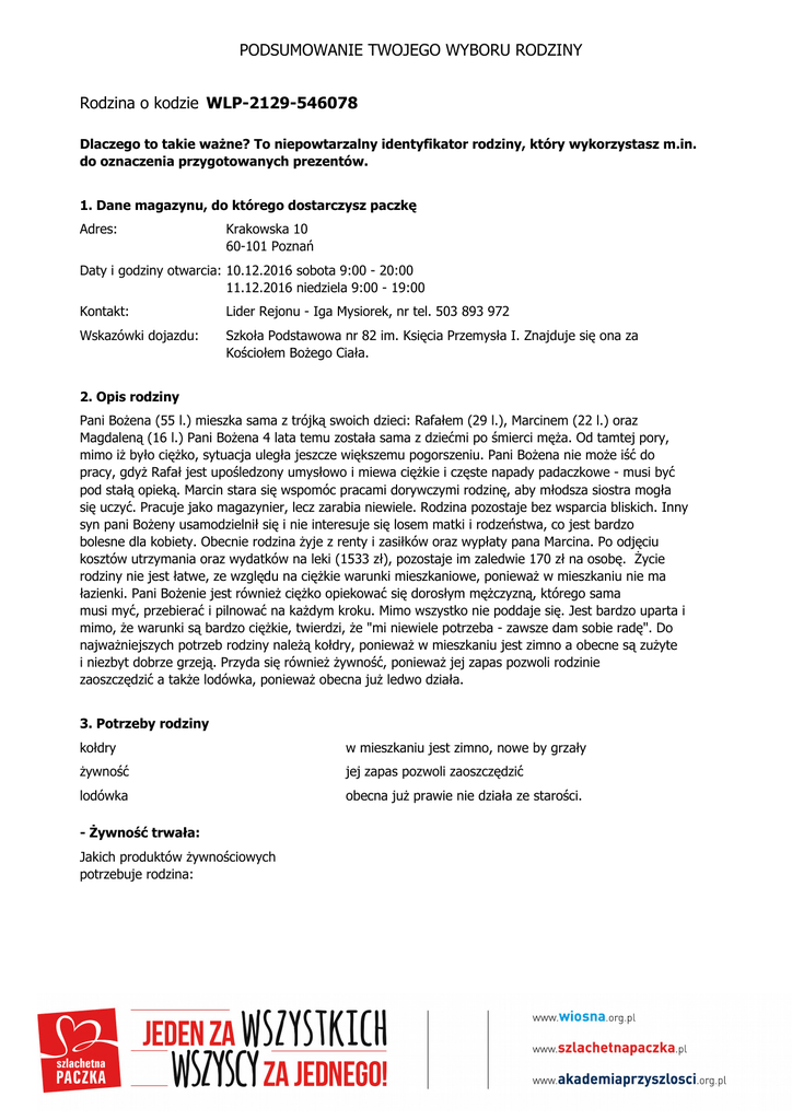 PODSUMOWANIE TWOJEGO WYBORU RODZINY Rodzina o kodzie WLP-2129-546078 Dlaczego to takie ważne? To niepowtarzalny identyfikator rodziny, który wykorzystasz m.in. do oznaczenia przygotowanych prezentów. 1. Dane magazynu, do którego dostarczysz paczkę Adres: Krakowska 10 60-101 Poznań Daty i godziny otwarcia: 10.12.2016 sobota 9:00 - 20:00 11.12.2016 niedziela 9:00 - 19:00 Kontakt: Lider Rejonu - Iga Mysiorek, nr tel. 503 893 972 Wskazówki dojazdu: Szkoła Podstawowa nr 82 im. Księcia Przemysła I. Znajduje się ona za Kościołem Bożego Ciała. 2. Opis rodziny Pani Bożena (55 l.) mieszka sama z trójką swoich dzieci: Rafałem (29 l.), Marcinem (22 l.) oraz Magdaleną (16 l.) Pani Bożena 4 lata temu została sama z dziećmi po śmierci męża. Od tamtej pory, mimo iż było ciężko, sytuacja uległa jeszcze większemu pogorszeniu. Pani Bożena nie może iść do pracy, gdyż Rafał jest upośledzony umysłowo i miewa ciężkie i częste napady padaczkowe - musi być pod stałą opieką. Marcin stara się wspomóc pracami dorywczymi rodzinę, aby młodsza siostra mogła się uczyć. Pracuje jako magazynier, lecz zarabia niewiele. Rodzina pozostaje bez wsparcia bliskich. Inny syn pani Bożeny usamodzielnił się i nie interesuje się losem matki i rodzeństwa, co jest bardzo bolesne dla kobiety. Obecnie rodzina żyje z renty i zasiłków oraz wypłaty pana Marcina. Po odjęciu kosztów utrzymania oraz wydatków na leki (1533 zł), pozostaje im zaledwie 170 zł na osobę. Życie rodziny nie jest łatwe, ze względu na ciężkie warunki mieszkaniowe, ponieważ w mieszkaniu nie ma łazienki. Pani Bożenie jest również ciężko opiekować się dorosłym mężczyzną, którego sama musi myć, przebierać i pilnować na każdym kroku. Mimo wszystko nie poddaje się. Jest bardzo uparta i mimo, że warunki są bardzo ciężkie, twierdzi, że "mi niewiele potrzeba - zawsze dam sobie radę". Do najważniejszych potrzeb rodziny należą kołdry, ponieważ w mieszkaniu jest zimno a obecne są zużyte i niezbyt dobrze grzeją. Przyda się również żywność, ponieważ jej zapas pozwoli rodzinie zaoszczędzić a także lodówka, ponieważ obecna już ledwo działa. 3. Potrzeby rodziny kołdry w mieszkaniu jest zimno, nowe by grzały żywność jej zapas pozwoli zaoszczędzić lodówka obecna już prawie nie działa ze starości. - Żywność trwała: Jakich produktów żywnościowych potrzebuje rodzina: PODSUMOWANIE TWOJEGO WYBORU RODZINY Rodzina o kodzie WLP-2129-546078 Herbata, Kasza, Cukier, Konserwy mięsne, Kawa, Makaron, Olej, Konserwy rybne, Ryż, Mąka, Dżem, Warzywa w puszkach - Środki czystości Jakich środków czystości potrzebuje rodzina: - Odzież Bożena Rodzaj odzieży: zimowa Kategoria: kurtka Rozmiar: XXL Sylwetka: grubsza Uwagi: Marcin Rodzaj odzieży: zimowa Kategoria: bluza Rozmiar: M Sylwetka: szczupła Uwagi: ciemne - Obuwie Magdalena Rodzaj obuwia: zimowe Kategoria: kozaki Rozmiar: 37 Uwagi: Rafał Rodzaj obuwia: zimowe Kategoria: trapery Rozmiar: 42 Uwagi: Proszek do prania, Płyn do mycia naczyń, Mydło/żel myjący, Pasta do zębów, Płyny czyszczące, Szampon, Szczoteczka do zębów PODSUMOWANIE TWOJEGO WYBORU RODZINY Rodzina o kodzie WLP-2129-546078 - Wyposażenie mieszkania Jakiego wyposażenia mieszkania potrzebuje rodzina: Kołdra, Koc, Ręczniki, Pościel, Poduszka Brakujące sprzęty: lodówka- obecna już prawie nie działa/ jest stara - Specjalne upominki Bożena-ciepły sweter Rafał-telefon komórkowy(klawiszowy), bawi się nim, słucha muzyki Magdalena-kosmetyki Marcin- bluza 4. Osoby opiekujące sie rodziną - Wolontariusz opiekun rodziny E-mail: [email protected] Telefon: 721883148, 721883148 Preferowana forma kontaktu: Telefoniczny - Lider Rejonu Imię i nazwisko: Iga Mysiorek 5. Mamy dla Ciebie kilka wskazówek, ważnych w przygotowaniu Paczki. * Paczki możesz dostarczyć wyłącznie do tego magazynu, z którego wybrana została rodzina. Wyjątkiem jest sytuacja, kiedy wybierzesz rodzinę z innego województwa, wtedy możesz dostarczyć paczkę do Magazynu Zastępczego znajdującego się w Twoim województwie (dane adresowe zamieszczone są na stronie wyboru rodziny). * Pamiętaj, że po wybraniu przez Ciebie rodziny nikt inny nie będzie już dla niej przygotowywał paczki. * Nie musisz zakupić wszystkich rzeczy z listy. Pamiętaj jednak, że wybierając rodzinę decydujesz się w pierwszej kolejności zaspokoić 3 najważniejsze potrzeby, które rodzina wymieniła w opisie. Zwróć jednak uwagę, że wszystkie wymienione rzeczy są dla rodziny bardzo ważne. * Rzeczy, które podarujesz rodzinie powinny być dla niej prezentem. Nie muszą być one nowe, a jeśli są używane – niech będą zadbane. Paczka przygotowywana jest z myślą o drugim człowieku – jest jak prezent. Przygotuj paczkę tak, by podniosła poczucie własnej wartości u obdarowanych przez Ciebie osób. * Paczki powinny być podzielone na kilka, poręcznych, niezbyt ciężkich pudeł, prosimy nie dostarczać PODSUMOWANIE TWOJEGO WYBORU RODZINY Rodzina o kodzie WLP-2129-546078 do magazynu produktów zapakowanych w reklamówki czy worki foliowe. * Każde pudło powinno być opisane kodem rodziny oraz opatrzone numerem, pudła należy numerować według klucza: np. 1 z 5, 2 z 5 itd. * W Paczce powinny znaleźć się suche i trwałe artykuły spożywcze. Prosimy, aby nie pakować do pudeł produktów, które łatwo ulegają uszkodzeniu, wylaniu, rozgnieceniu. * Aby prezent nabrał świątecznego charakteru można owinąć pudła świątecznym papierem! Warto też dodać kilka słów od siebie dla rodziny – chociażby na świątecznej kartce, czy w liście. 6. Aby cała Polska mogła na żywo śledzić wyniki SZLACHETNEJ PACZKI… … w trakcie finału w magazynach będziemy wybierali informacje o wartości Paczki i liczbie osób zaangażowanych w jej przygotowanie. Jednak nie uda nam się to bez Twojego wsparcia. Możesz sprawić, że przekazywane w świat wyniki będą