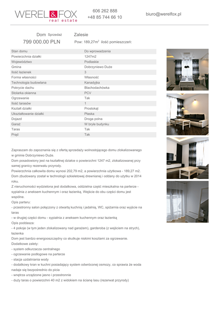 606 262 888 +48 85 744 66 10 Dom Sprzedaż 799 000.00 PLN Zalesie Pow: 189,27m2 ilość pomieszczeń: Stan domu Do wprowadzenia Powierzchnia działki 1247m2 Województwo Podlaskie Gmina Dobrzyniewo Duże Ilość łazienek 3 Forma własności Własność Technologia budowlana Kanadyjka Pokrycie dachu Blachodachówka Stolarka okienna PCV Ogrzewanie Tak Ilość tarasów 1 Kształt działki Prostokąt Ukształtowanie działki Płaska Dojazd Droga polna Garaż W bryle budynku Taras Tak Prąd Tak Zapraszam do zapoznania się z ofertą sprzedaży wolnostojącego domu zlokalizowanego w gminie Dobrzyniewo Duże. Dom posadowiony jest na kształtnej działce o powierzchni 1247 m2, zlokalizowanej przy samej granicy rezerwatu przyrody. Powierzchnia całkowita domu wynosi 202,79 m2, a powierzchnia użytkowa - 189,27 m2. Dom zbudowany został w technologii szkieletowej drewnianej i oddany do użytku w 2014 roku. Z nieruchomości wydzielona jest dodatkowa, oddzielna część mieszkalna na parterze sypialnia z aneksem kuchennym i oraz łazienką. Wejście do obu części domu jest wspólne. Opis parteru: - przestronny salon połączony z otwartą kuchnią i jadalnią, WC, spiżarnia oraz wyjście na taras - w drugiej części domu - sypialnia z aneksem kuchennym oraz łazienką Opis poddasza: - 4 pokoje (w tym jeden zlokalizowany nad garażem), garderoba (z wejściem na strych), łazienka Dom jest bardzo energooszczędny co skutkuje niskimi kosztami za ogrzewanie. Dodatkowe zalety: - system odkurzacza centralnego - ogrzewanie podłogowe na parterze - stacja uzdatniania wody - dodatkowy kran w kuchni posiadający system odwróconej osmozy, co sprawia że woda nadaje się bezpośrednio do picia - wnętrza urządzone jasno i przestronnie - duży taras o powierzchni 40 m2 z widokiem na ścianę lasu (rezerwat przyrody) [email protected] - rekuperacja Media: prąd, studnia głębinowa, przydomowa oczyszczalnia ścieków. Cena: 799 000 zł Polecam i zapraszam na prezentację! tel.: 731 500 669, +48 85 744 66 10, +48 85 744 66 11 Gwarancja bezpieczeństwa - nasze transakcje są ubezpieczone; numer licencji pośrednika w obrocie nieruchomościami 4277. Podane dane mają charakter wyłącznie informacyjny i winny być traktowane jako zaproszenie do zawarcia umowy. Informacja nie stanowi oferty w rozumieniu art.66 KC oraz innych właściwych przepisów prawnych. Informacje umieszczone w ofertach przekazywane są przez właścicieli nieruchomości i mogą ulegać zmianom. data wydruku: 2017-03-02 16:58:22