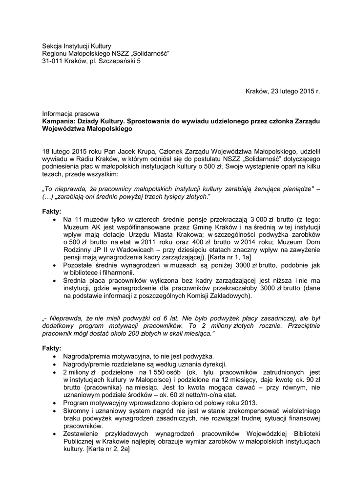 Sekcja Instytucji Kultury Regionu Małopolskiego NSZZ „Solidarność” 31-011 Kraków, pl. Szczepański 5 Kraków, 23 lutego 2015 r. Informacja prasowa Kampania: Dziady Kultury. Sprostowania do wywiadu udzielonego przez członka Zarządu Województwa Małopolskiego 18 lutego 2015 roku Pan Jacek Krupa, Członek Zarządu Województwa Małopolskiego, udzielił wywiadu w Radiu Kraków, w którym odniósł się do postulatu NSZZ „Solidarność” dotyczącego podniesienia płac w małopolskich instytucjach kultury o 500 zł. Swoje wystąpienie oparł na kilku tezach, przede wszystkim: „To nieprawda, że pracownicy małopolskich instytucji kultury zarabiają żenujące pieniądze" – (…) „zarabiają oni średnio powyżej trzech tysięcy złotych.” Fakty: Na 11 muzeów tylko w czterech średnie pensje przekraczają 3 000 zł brutto (z tego: Muzeum AK jest współfinansowane przez Gminę Kraków i na średnią w tej instytucji wpływ mają dotacje Urzędu Miasta Krakowa; w szczególności podwyżka zarobków o 500 zł brutto na etat w 2011 roku oraz 400 zł brutto w 2014 roku; Muzeum Dom Rodzinny JP II w Wadowicach – przy dziesięciu etatach znaczny wpływ na zawyżenie pensji mają wynagrodzenia kadry zarządzającej). [Karta nr 1, 1a] Pozostałe średnie wynagrodzeń w muzeach są poniżej 3000 zł brutto, podobnie jak w bibliotece i filharmonii. Średnia płaca pracowników wyliczona bez kadry zarządzającej jest niższa i nie ma instytucji, gdzie wynagrodzenie dla pracowników przekraczałoby 3000 zł brutto (dane na podstawie informacji z poszczególnych Komisji Zakładowych). „- Nieprawda, że nie mieli podwyżki od 6 lat. Nie było podwyżek płacy zasadniczej, ale był dodatkowy program motywacji pracowników. To 2 miliony złotych rocznie. Przeciętnie pracownik mógł dostać około 200 złotych w skali miesiąca.” Fakty: Nagroda/premia motywacyjna, to nie jest podwyżka. Nagrody/premie rozdzielane są według uznania dyrekcji. 2 miliony zł podzielone na 1 550 osób (ok. tylu pracowników zatrudnionych jest w instytucjach kultury w Małopolsce) i podzielone na 12 miesięcy, daje kwotę ok. 90 zł brutto (pracownika) na miesiąc. Jest to kwota mogąca dawać – przy równym, nie uznaniowym podziale środków – ok. 60 zł netto/m-c/na etat. Program motywacyjny wprowadzono dopiero od połowy roku 2013. Skromny i uznaniowy system nagród nie jest w stanie zrekompensować wieloletniego braku podwyżek wynagrodzeń zasadniczych, nie rozwiązał trudnej sytuacji finansowej pracowników. Zestawienie przykładowych wynagrodzeń pracowników Wojewódzkiej Biblioteki Publicznej w Krakowie najlepiej obrazuje wymiar zarobków w małopolskich instytucjach kultury. [Karta nr 2, 2a] „(…). Niezależnie od tego od jesieni ubiegłego roku w Wojewódzkiej Bibliotece daliśmy pieniądze na wyższe pensje. Tam się zarabiało najmniej.” Fakty: 70 zł netto na etat przeliczeniowy. W dużej części wynikało to ze wzrostu płacy minimalnej w 2015 r. zgodnie z regulacjami ustawy z dnia 10 października 2002 roku o minimalnym wynagrodzeniu za pracę (Dz. U. Nr 200, poz. 1679, z późn. zm.). Płace pracowników merytorycznych w Wojewódzkiej Bibliotece Publicznej w Krakowie są najniższe spośród bibliotek wojewódzkich w Polsce [Karta nr 3, 3a]. Średnie wynagrodzenie w bibliotekach publicznych województwa małopolskiego za 2013 rok wynosiło 2 729 zł brutto, a w WBP w Krakowie tylko 2 309 zł brutto, czyli 1 675 zł netto. Aktualne średnie wynagrodzenie za okres X-XII 2014 po „podwyżkach” to 2 360 zł brutto czyli 1 711 zł netto. Bibliotekarze pracują w systemie zmianowym od godz. 7.30 do 19.30. Pracują 7 dni w tygodniu. Wykształcenie pracowników działalności podstawowej Wojewódzkiej Bibliotece Publicznej w Krakowie wygląda następująco: stopień doktora lub doktora habilitowanego mają osoby pracujące na 3,25 etatu, wykształcenie wyższe osoby pracujące na 112 etatach, średnie na 22 etatach, zawodowe na 3 etatach (dane ze sprawozdania merytorycznego WBP w Krakowie za 2013 r.). Odpowiedź Pana Jacka Krupy na temat projektu „Wirtualne Muzea Małopolski” nie zasługuje na komentarz. Jest tak enigmatyczna, ogólnikowa i pełna haseł, że uznajemy, iż po prostu nie ustosunkował się do naszego zarzutu. Reasumując, należy zadać pytanie czy aby ten wywiad nie ociera się o próbę manipulacji opinią publiczną? Trudno wypowiedzi Pana Jacka Krupy zarzucić przekroczenie prawa, ale podnoszone kwestie w żaden sposób nie pasują do rzeczywistości. Można nawet pokusić się o stwierdzenie, iż służą wprowadzaniu w błąd opinii publicznej poprzez wybiórcze przedstawianie danych, selektywny dobór faktów pasujących do wygodnej, lansowanej przez niego tezy. Domagamy się zaprzestania takich praktyk oraz podjęcia pełnej, poważnej, wspartej faktami i rzeczowymi argumentami dyskusji na temat naszych płac, które wymagają wyrównania wieloletnich zaniedbań. Podtrzymujemy żądanie 500 zł podwyżki na etat od 1 stycznia 2015 roku. W razie pytań, uwag i komentarzy prosimy o kontakt: tel.: 602 667 104 Andrzej Rybicki – Przewodniczący Rady Sekcji Pracowników Muzeów i Instytucji Ochrony Zabytków NSZZ „Solidarność” Region Małopolska lub tel.: 503 680 936 Jacek Szczęsnowicz – Wiceprzewodniczący Komisji Międzyzakładowej NSZZ „Solidarność” Pracowników Bibliotek Publicznych Region Małopolska www.dziadykultury.wordpress.com Załączniki: 1-1a. Średnie wynagrodzenie w muzeach. Pismo Rady Sekcji Muzealnej z dn. 20.08.2012 złożone w Urzędzie Marszałkowskim 31.08.2012 oraz wyciąg z pisma z UMWM dn. 27.10.2014 r. 2-2a. Paski z płacami pracowników w WBP w Krakowie po „podwyżkach”. 3-3a. Średnie wynagrodzenie w bibliotekach wojewódzkich w Polsce za 2012 rok na podstawie danych z MKiDN.