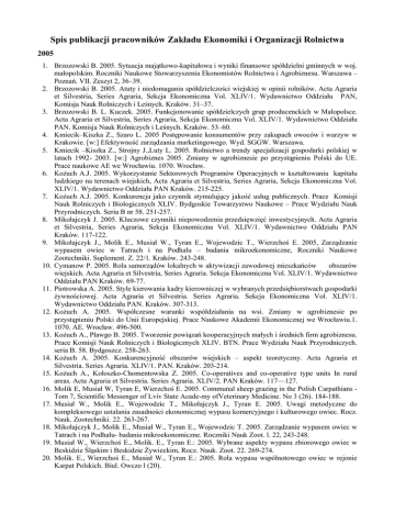 Spis publikacji pracowników Zakładu Ekonomiki i Organizacji Rolnictwa 2005 1. Brzozowski B. 2005. Sytuacja majątkowo-kapitałowa i wyniki finansowe spółdzielni gminnych w woj. małopolskim. Roczniki Naukowe Stowarzyszenia Ekonomistów Rolnictwa i Agrobiznesu. Warszawa – Poznań. VII. Zeszyt 2, 36–39. 2. Brzozowski B. 2005. Atuty i niedomagania spółdzielczości wiejskiej w opinii rolników. Acta Agraria et Silvestria, Series Agraria, Sekcja Ekonomiczna Vol. XLIV/1. Wydawnictwo Oddziału PAN, Komisja Nauk Rolniczych i Leśnych. Kraków. 31–37. 3. Brzozowski B. L. Kuczek. 2005. Funkcjonowanie spółdzielczych grup producenckich w Małopolsce. Acta Agraria et Silvestria, Series Agraria, Sekcja Ekonomiczna Vol. XLIV/1. Wydawnictwo Oddziału PAN. Komisja Nauk Rolniczych i Leśnych. Kraków. 53–60. 4. Kmiecik–Kiszka Z., Szaro L. 2005 Postępowanie konsumentów przy zakupach owoców i warzyw w Krakowie. [w:] Efektywność zarządzania marketingowego. Wyd. SGGW. Warszawa. 5. Kmiecik –Kiszka Z., Strojny J.,Luty L. 2005. Rolnictwo a trendy specjalizacji gospodarki polskiej w latach 1992- 2003. [w:] Agrobiznes 2005. Zmiany w agrobiznesie po przystąpieniu Polski do UE. Prace naukowe AE we Wrocławiu. 1070. Wrocław. 6. Kożuch A.J. 2005. Wykorzystanie Sektorowych Programów Operacyjnych w kształtowaniu kapitału ludzkiego na terenach wiejskich, Acta Agraria et Silvestria, Series Agraria, Sekcja Ekonomiczna Vol. XLIV/1. Wydawnictwo Oddziału PAN Kraków. 215-225. 7. Kożuch A.J. 2005. Konkurencja jako czynnik stymulujący jakość usług publicznych. Prace Komisji Nauk Rolniczych i Biologicznych XLIV. Bydgoskie Towarzystwo Naukowe – Prace Wydziału Nauk Przyrodniczych. Seria B nr 58. 251-257. 8. Mikołajczyk J. 2005. Kluczowe czynniki niepowodzenia przedsięwzięć inwestycyjnych. Acta Agraria et Silvestria, Series Agraria, Sekcja Ekonomiczna Vol. XLIV/1. Wydawnictwo Oddziału PAN Kraków. 117-122. 9. Mikołajczyk J., Molik E., Musiał W., Tyran E., Wojewodzic T., Wierzchoś E. 2005, Zarządzanie wypasem owiec w Tatrach i na Podhalu – badania mikroekonomiczne, Roczniki Naukowe Zootechniki. Suplement. Z. 22/1. Kraków. 243-248. 10. Cymanow P. 2005. Rola samorządów lokalnych w aktywizacji zawodowej mieszkańców obszarów wiejskich. Acta Agraria et Silvestria, Series Agraria. Sekcja Ekonomiczna Vol. XLIV/1. Wydawnictwo Oddziału PAN Kraków. 69-77. 11. Piotrowska A. 2005. Style kierowania kadry kierowniczej w wybranych przedsiębiorstwach gospodarki żywnościowej. Acta Agraria et Silvestria. Series Agraria. Sekcja Ekonomiczna Vol. XLIV/1. Wydawnictwo Oddziału PAN. Kraków. 307-313. 12. Kożuch A. 2005. Współczesne warunki współdziałania na wsi. Zmiany w agrobiznesie po przystąpieniu Polski do Unii Europejskiej. Prace Naukowe Akademii Ekonomicznej we Wrocławiu.1. 1070. AE. Wrocław. 496-500. 13. Kożuch A., Plawgo B. 2005. Tworzenie powiązań kooperacyjnych małych i średnich firm agrobiznesu. Prace Komisji Nauk Rolniczych i Biologicznych XLIV. BTN. Prace Wydziału Nauk Przyrodniczych. seria B. 58. Bydgoszcz. 258-263. 14. Kożuch A. 2005. Konkurencyjność obszarów wiejskich – aspekt teoretyczny. Acta Agraria et Silvestria. Series Agraria. XLIV/1. PAN. Kraków. 203-214. 15. Kożuch A., Kołoszko-Chomentowska Z. 2005. Co-operatives and co-operative type units In rural areas. Acta Agraria et Silvestria. Series Agraria. XLIV/2. PAN Kraków. 117—127. 16. Molik E, Musiał W, Tyran E, Wierzchoś E. 2005. Communal sheep grazing in the Polish Carpathians Tom 7, Scientific Messenger of Lviv State Acade-my ofVeterinary Medicine. No 3 (26). 184-188. 17. Musiał W., Molik E., Wojewodzic T., Mikołajczyk J., Tyran E. 2005. Uwagi metodyczne do kompleksowego ustalania zasadności ekonomicznej wypasu komercyjnego i kulturowego owiec. Rocz. Nauk. Zootechniki. 22. 263-267. 18. Mikołajczyk J., Molik E., Musiał W., Tyran E., Wojewodzic T. 2005. Zarządzanie wypasem owiec w Tatrach i na Podhalu- badania mikroekonomiczne. Roczniki Nauk Zoot. l. 22, 243-248. 19. Musiał W., Wierzchoś E., Molik. E., Tyran E.: 2005. Wybrane aspekty wypasu zbiorowego owiec w Beskidzie Śląskim i Beskidzie Żywieckim, Rocz. Nauk. Zoot. 22. 269-274. 20. Molik. E., Wierzchoś E., Musiał W., Tyran E.: 2005. Rola wypasu wspólnotowego owiec w rejonie Karpat Polskich. Biul. Owczo l (20). 21. Vinohradnik K., Kania J., Musiał W. 2005. Institutional suport for development of supply chain in rural areas. Acta Agraria et Silvestria. vol. XLIV/2. 273-283. 22. Musiał W. 2005. Supporting rural development in the Małopolska Region through “Sheep” Programmer. Acta Agraria et Silvestria 42/2 23. Musiał W. 2005. Korzyści ekonomiczne działań rolnośrodowiskowych na obszarach górskich – wybrane aspekty. Roczniki Naukowe VII. 4. Warszawa. 305-310. 24. Musiał W., 2005. Gospodarowanie rolniczą przestrzenią produkcyjną w strefach wysokościowych Karpat Polskich. Kwestia agrarna w Polsce i na Świecie. SGGW Warszawa. 485-495. 25. Wojewodzic T. 2005. Wpływ stawek podatku od nieruchomości na rozwój przedsiębiorczości w powiecie suskim. Przedsiębiorczość po wstąpieniu Polski do Unii Europejskiej, pod red. L. Pałasza. AR w Szczecinie. Szczecin. 577-584. 26. Brzozowski B. 2005. Opinions of farmer – milk producers In southern Poland on dairy cooperatives. Slovenska polnohospodarska Universita v Nitre. Materiały Międzynarodowej Konferencji Naukowej, Raczkova Dolina 27 – 28 kwiecień 2005. 27. Brzozowski B. 2005. Current problems of managing agricultural productions cooperatvs in Poland. Technicka Univerzita v Kosiciach. 1-7. 28. Brzozowski B. 2005. Legal and organizational aspects of froming and functioning of producer groups in Poland. Litewski Universytet Rolniczy. Materiały z Międzynarodowej Konferencji Naukowej Kowno 17 – 19 listopad 2005. 95 – 97. 29. Brzozowski B. J. Ramanauskas, V. Lekavicus, A. Pukenas. 2005. Possibilities for establishment of producer organizations fruits and vegeta