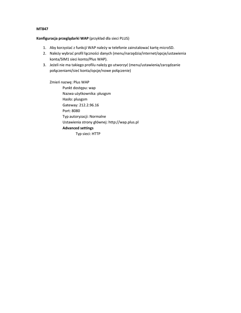 MT847 Konfiguracja przeglądarki WAP (przykład dla sieci PLUS) 1. Aby korzystać z funkcji WAP należy w telefonie zainstalować kartę microSD. 2. Należy wybrać profil łączności danych (menu/narzędzia/internet/opcje/ustawienia konta/SIM1 sieci konto/Plus WAP). 3. Jeżeli nie ma takiego profilu należy go utworzyć (menu/ustawienia/zarządzanie połączeniami/sieć konta/opcje/nowe połączenie) Zmień nazwę: Plus WAP Punkt dostępu: wap Nazwa użytkownika: plusgsm Hasło: plusgsm Gateway: 212.2.96.16 Port: 8080 Typ autoryzacji: Normalne Ustawienia strony głównej: http://wap.plus.pl Advanced settings Typ sieci: HTTP