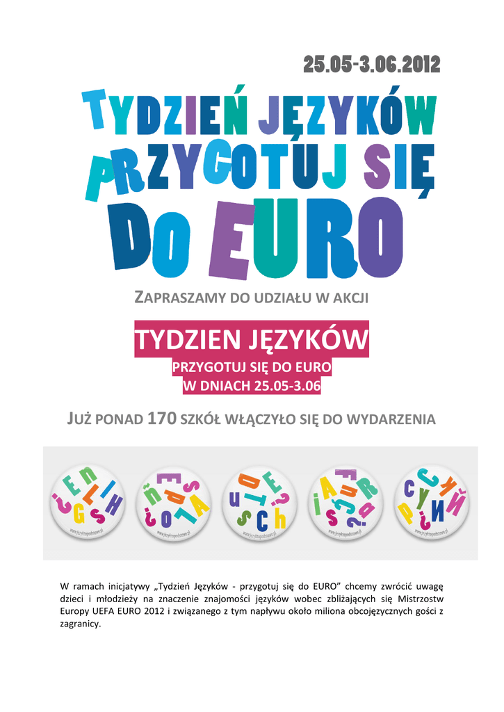 ZAPRASZAMY DO UDZIAŁU W AKCJI TYDZIEN JĘZYKÓW PRZYGOTUJ SIĘ DO EURO W DNIACH 25.05-3.06 JUŻ PONAD 170 SZKÓŁ WŁĄCZYŁO SIĘ DO WYDARZENIA ZAPRASZAMY DO UDZIAŁU W AKCJI TYDZIEN JĘZYKÓW PRZYGOTUJ SIĘ DO EURO W DNIACH 25.05-3.06 JUŻ PONAD 170 SZKÓŁ WŁĄCZYŁO SIĘ DO WYDARZENIA W ramach inicjatywy „Tydzień Języków - przygotuj się do EURO” chcemy zwrócić uwagę dzieci i młodzieży na znaczenie znajomości języków wobec zbliżających się Mistrzostw Europy UEFA EURO 2012 i związanego z tym napływu około miliona obcojęzycznych gości z zagranicy. Pragniemy im uzmysłowić jak ważna i korzystna jest dla nich umiejętność posługiwania się językiem obcym. Celem naszej akcji jest również kształtowanie wizerunku młodego Polaka jako obywatela Europy komunikującego się w językach obcych. „Tydzień Języków - przygotuj się do EURO” jest częścią ogólnopolskiej akcji społecznej „Język to podstawa. Ucz się języków”, której celem jest tworzenie w Polsce klimatu sprzyjającego nauce języków obcych. W akcję Tydzień Języków zostaną bezpośrednio zaangażowane środowiska nauczycieli i lektorów języków obcych (angielskiego, niemieckiego, francuskiego, hiszpańskiego i rosyjskiego), środowisko nauczycieli akademickich (akademickie ośrodki nauczania języków obcych m.in. zrzeszone w SERMO), uczniowie szkół podstawowych, gimnazjów i szkół średnich oraz ich rodzice i dodatkowo pracownicy punktów usługowych i sklepów w całej Polsce. Przedstawiamy listę 5 projektów, które będziemy realizować: LET’S WIN: Konkurs dla uczniów szkół publicznych, którego celem jest zainteresowanie nauczycieli i uczniów szkół publicznych atrakcyjnymi formami nauki języków w kontekście EURO. Nagrodą są multimedialne tablety dla uczniów zwycięskich grup projektowych oraz dla ich nauczycieli LET’S TALK: Nalepki, plakietki lub bransoletki – „Mówię w języku …”, rozdawane przez Państwa szkołę wśród uczniów i pracowników. LET’S CHECK: Bezpłatne certyfikaty językowe, może otrzymać każdy kto przystąpi do testu online podczas „drzwi otwartych” w Państwa szkole. LET’S WORK: Certyfikacja językowa punktów sprzedaży, które po zaliczeniu testu językowego uzyskają od Państwa szkoły etykietę „Tu mówimy w języku…”. LET’S PLAY: Akcje lokalne szkół językowych, mające na celu promocję nauki i znajomości języków obcych. Zarejestruj się na stronie http://www.tydzienjezykow.pl/index.php/rejestracja2/rejestracja do 18 maja by włączyć się do akcji. Więcej informacji na stronach www.tydzienjezykow.pl oraz www.jezyktopodstawa.pl.