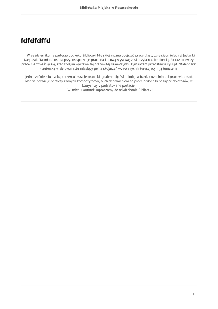 Biblioteka Miejska w Puszczykowie fdfdfdffd W październiku na parterze budynku Biblioteki Miejskiej można obejrzeć prace plastyczne siedmioletniej Justynki Kasprzak. Ta młoda osoba przynosząc swoje prace na lipcową wystawę zaskoczyła nas ich ilością. Po raz pierwszy prace nie zmieściły się, stąd kolejna wystawa tej pracowitej dziewczynki. Tym razem przedstawia cykl pt. "Kalendarz" - autorską wizję dwunastu miesięcy pełną skojarzeń wywołanych interesującym ją tematem. Jednocześnie z Justynką prezentuje swoje prace Magdalena Lipińska, kolejna bardzo uzdolniona i pracowita osoba. Madzia pokazuje portrety znanych kompozytorów, a ich dopełnieniem są prace ozdobniki pasujące do czasów, w których żyły portretowane postacie. W imieniu autorek zapraszamy do odwiedzania Biblioteki. 1