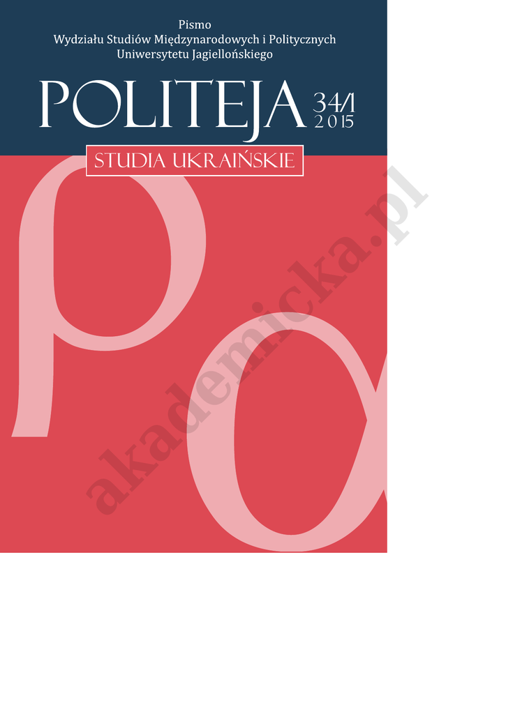 34/1 2 0 15 ak ad e m ic ka . pl Studia ukrainskie 2015-06-17 09:23:55 Księgarnia Akademicka Sp. z o.o. ul. św. Anny 6, 31-008 Kraków tel./fax: 12 431 27 43 [email protected] www.akademicka.pl ISSN 1733-6716 ad e Redakcja tekstów: Justyna Wójcik pl „Politeja. Pismo Wydziału Studiów Międzynarodowych i Politycznych Uniwersytetu Jagiellońskiego” ul. Piłsudskiego 13, pok. 209 31-110 Kraków tel.: 12 663 34 74, fax: 12 421 53 65 [email protected] www.politeja.wsmip.uj.edu.pl Saad Abudayeh ( Jordan University) Roman Bäcker (Uniwersytet Mikołaja Kopernika w Toruniu) Marek Bankowicz (Uniwersytet Jagielloński) Włodzimierz Bernacki (Uniwersytet Jagielloński) Maksim Bulachtin (Perm University) Adam Chmielewski (Uniwersytet Wrocławski) Artur Demchuk (Lomonosov Moscow State University) Joachim Diec (Uniwersytet Jagielloński) Andrzej Dudek (Uniwersytet Jagielloński) Stanisław Górka (Uniwersytet Jagielloński) Wojciech Kaute (Uniwersytet Śląski w Katowicach) Rafał Kęsek (Uniwersytet Jagielloński) Paulina Kewes (University of Oxford) Wawrzyniec Konarski (Uniwersytet Jagielloński) Leszek Korporowicz (Uniwersytet Jagielloński) Krzysztof Kościelniak (Uniwersytet Jagielloński) Barbara Krauz-Mozer (Uniwersytet Jagielloński) Małgorzata Kuźbida (PWS Wschodnioeuropejska w Przemyślu) Marek Maciejewski (Uniwersytet Wrocławski) Gerhard Meiser (Universität Halle) Włodzimierz Mich (Uniwersytet Marii Curie Skłodowskiej w Lublinie) Andrea Schmidt (Pecs University) Mieczysław Smoleń (Uniwersytet Jagielloński) Tomasz Stępniewski (Katolicki Uniwersytet Lubelski) Barbara Stoczewska (Uniwersytet Jagielloński) Lucjan Suchanek (Państwowa Wyższa Szkoła Zawodowa w Oświęcimiu) Krzysztof Szczerski (Uniwersytet Jagielloński) Andrzej Szeptycki (Uniwersytet Warszawski) Dariusz Szpoper (Uniwersytet Gdański) Paweł Ścigaj (Uniwersytet Jagielloński) Janusz J. Węc (Uniwersytet Jagielloński) Howard Williams (Aberystwyth University) Justyna Zając (Uniwersytet Warszawski) Ryszard Zięba (Uniwersytet Warszawski) ic ka . Publikacja wydana w dwóch wersjach: elektronicznej i drukowanej. Wersją pierwotną jest format elektroniczny Recenzenci m Publikacja wydana dzięki pomocy de minimis z Ministerstwa Nauki i Szkolnictwa Wyższego oraz środkom Wydziału Studiów Międzynarodowych i Politycznych UJ. Projekt okładki: Łukasz Fyderek Typografia, skład i łamanie: ak www.anatta.pl Nakład: 150 egz. „Politeja” jest c Uniwersytetu J tycznych i kult z ośrodków nau nych i nierozpa recenzji książek Ostateczna dec nego wyniku a spośród specjal Wymagania 1. Teksty w 2. Artykuł wraz z p nego m 3. Oprócz nych w 4. Na pier 5. W tekśc wraz z p 6. W przy 7. Prosimy 8. Przypis stronie 9. Autorzy dwóch t uzupełn 10.Po zaak twem K Pismo Wydziału Studiów Międzynarodowych i Politycznych Uniwersytetu Jagiellońskiego POLITEJA Nr 2 (34/1) Kraków 2015 ad e m ic ka . RADA PROGRAMOWA Prof. Jerzy Axer (Uniwersytet Warszawski) Prof. Andrea Ciampani (LUMSA, Roma) Prof. Břetislav Dančak (Masaryk University, Brno) Prof. Rahul Peter Das (Martin-Luther-Universität Halle-Wittenberg) Prof. Taras Finikov (KROK University, Kyiv) Prof. Saleh K. Hamarneh ( Jordan University) Prof. Ferenc Hörcher (Pázmány Péter Catholic University, Budapest) Prof. Alvydas Jokubaitis (Vilnius University) Prof. Wiesław Kozub-Ciembroniewicz (Instytut Nauk Politycznych i Stosunków Międzynarodowych UJ) Prof. Zdzisław Mach (Instytut Europeistyki UJ) Prof. Andrzej Mania (Instytut Nauk Politycznych i Stosunków Międzynarodowych UJ) Prof. Tadeusz Paleczny (Instytut Studiów Międzykulturowych UJ) Prof. Dorota Praszałowicz (Instytut Amerykanistyki i Studiów Polonijnych UJ) Prof. Anna Raźny (Instytut Rosji i Europy Wschodniej UJ) Prof. John Robertson (Cambridge University) Prof. Irena Stawowy-Kawka (Instytut Nauk Politycznych i Stosunków Międzynarodowych UJ) Prof. Noël O’Sullivan (University of Hull) Prof. Adam Walaszek (Instytut Amerykanistyki i Studiów Polonijnych UJ) Prof. Andrey Yuriyevich Shutov (Lomonosov Moscow State University) Prof. Andrzej Zięba (Instytut Nauk Politycznych i Stosunków Międzynarodowych UJ) pl STUDIA UKRAIŃSKIE pod redakcją Piotra Bajora REDAKTOR NACZELNY CZASOPISMA Prof. Bogdan Szlachta (Instytut Nauk Politycznych i Stosunków Międzynarodowych UJ) SEKRETARZ REDAKCJI CZASOPISMA ak Dr hab. Dorota Pietrzyk-Reeves (Instytut Nauk Politycznych i Stosunków Międzynarodowych UJ) Dr Arkadiusz Górnisiewicz (Instytut Nauk Politycznych i Stosunków Międzynarodowych UJ) Spis treści Artykuły Anatolij Romaniuk, Ewolucja opozycji politycznej na Ukrainie 25 Witalij Łytwyn, Ewolucja instytucji prezydentury w politycznej historii Ukrainy: ustanowienie prezydentury, kompetencje, rola i miejsce prezydenta w systemie rządów 63 Jurij Macijewśkyj, Dwa kryzysy i rewolucja: wydarzenia z 2004 i 2014 r. na Ukrainie w perspektywie porównawczej 79 Maksym Hon, Rewolucja honoru i godności na Ukrainie: perspektywa żydowska 93 Myrosława Lendel, Switłana Buła, Samorząd lokalny na Ukrainie: forma, która nie stała się treścią ic ka . pl 5 107 Natalia Rotar, Uczestnictwo polityczne obywateli Ukrainy: wymiar wyborczy, protestacyjny i dyskursywny 143 Jurij Ostapec, Społeczno-polityczny rozwój Zakarpacia (1991-2014) 161 Jurij Szweda, Partie polityczne i system partyjny Ukrainy: problemy kształtowania się w warunkach tworzenia państwa oraz transformacji społecznej m 177 Andrij Jurasz, Ukraina w europejskim kontekście pluralizmu religijnego i tolerancji ad e 201 Andrij Zotkin, Korupcja w systemie wzajemnych relacji między społeczeństwem i państwem na obszarze poradzieckim i na Ukrainie 215 Marina Tereszczuk, Media w aspekcie budowania świadomości marki narodowej. Wyzwania dla Ukrainy ak 229 Ołeksandr Łozowyckyj, Interesy geostrategiczne i geopolityka współczesnej Ukrainy w regionie czarnomorskim 239 Mykoła Doroszko, Dlaczego Putin wszczął wojnę przeciw Ukrainie 247 Walerij Kopij